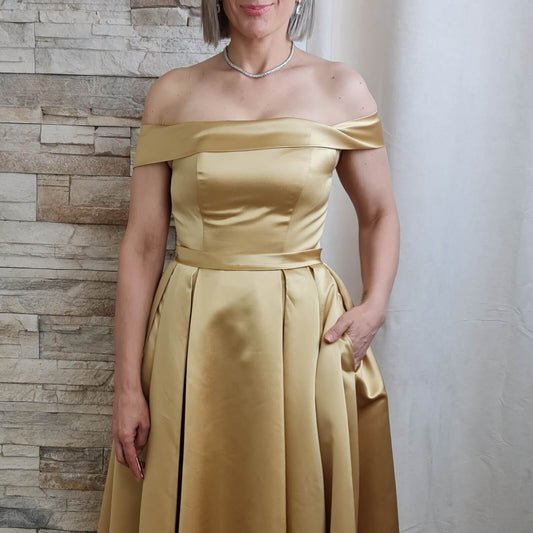 VESTIDO DE CERIMÓNIA ACETINADO COM DECOTE EM BARCO