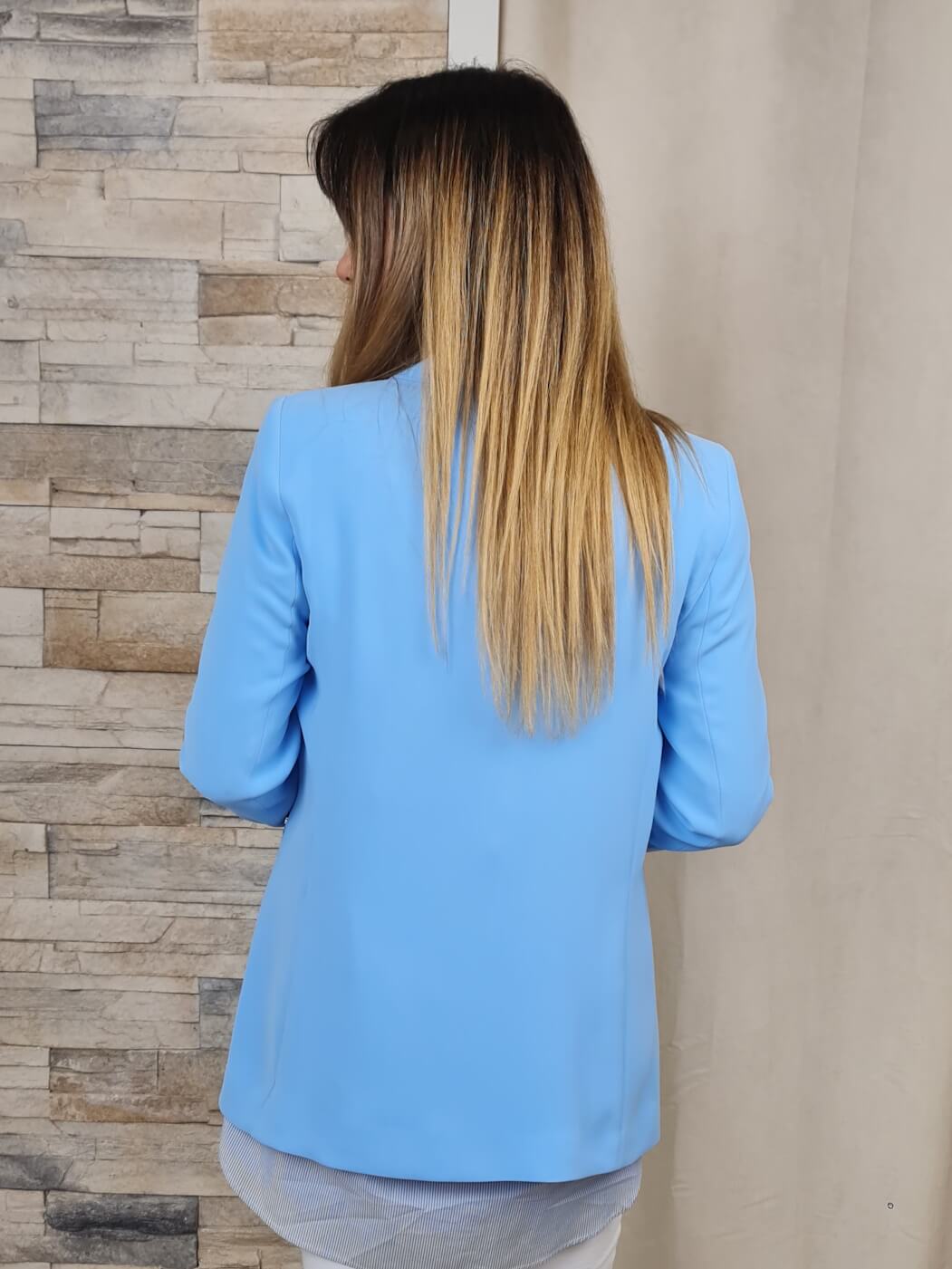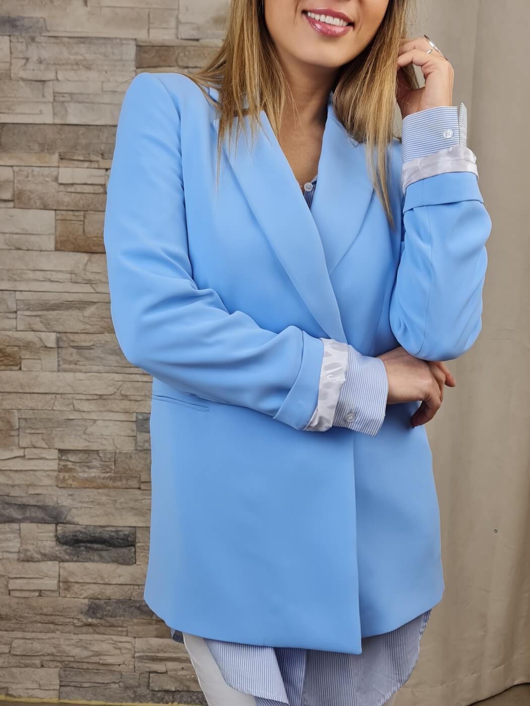 O blazer apresenta um design moderno e elegante, com um corte estruturado que define a silhueta. A cor azul confere um ar fresco e sofisticado, ideal para diversas ocasiões. O detalhe que mais se destaca são os botões dourados, que adicionam um toque de glamour e sofisticação ao visual.