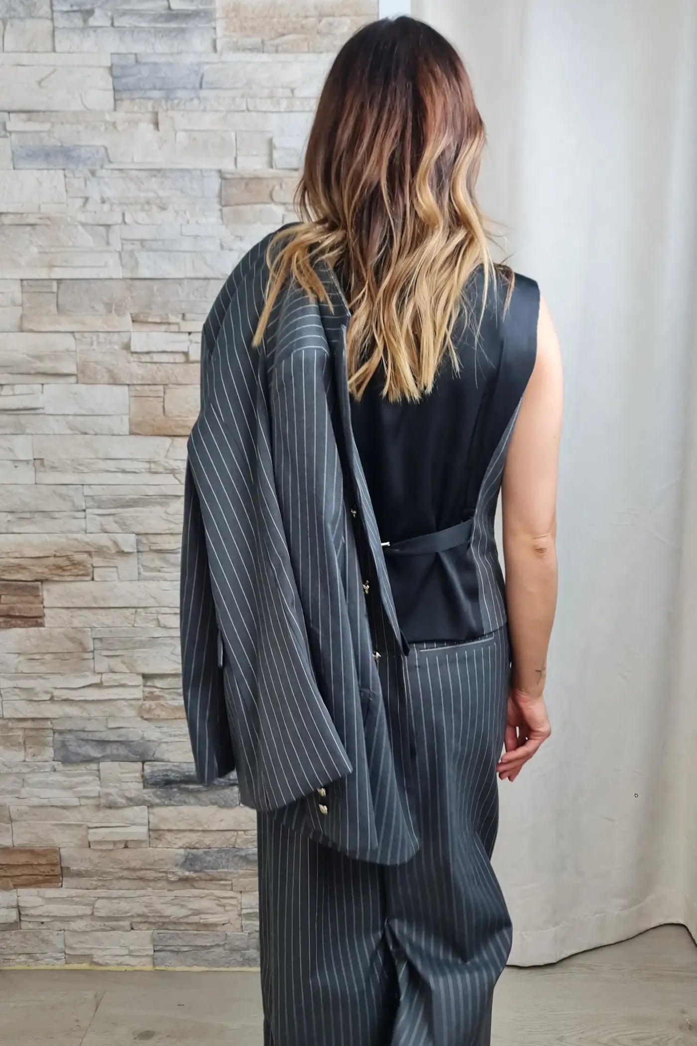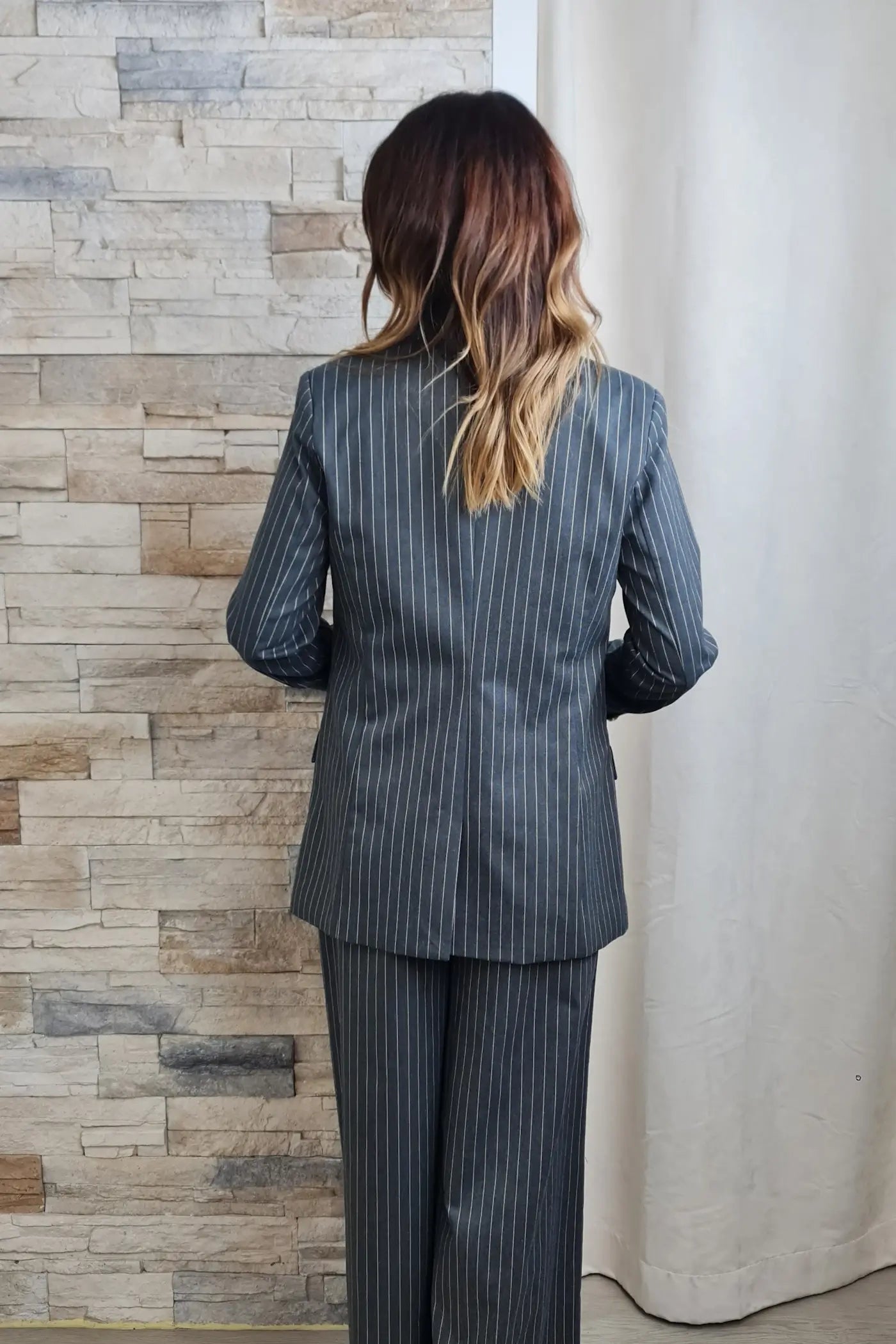 Ao vestir este blazer, sentirá a força e a sofisticação da cor cinzenta escura, que evoca o profissionalismo e a determinação, proporcionando uma sensação de controlo e confiança. As riscas de giz finas e bege não são apenas um padrão clássico; são uma afirmação da sua capacidade de se destacar com subtileza e requinte. O seu corte moderno e estruturado é perfeitamente complementado pelos botões dourados de destaque, que adicionam um toque de luxo e personalidade.