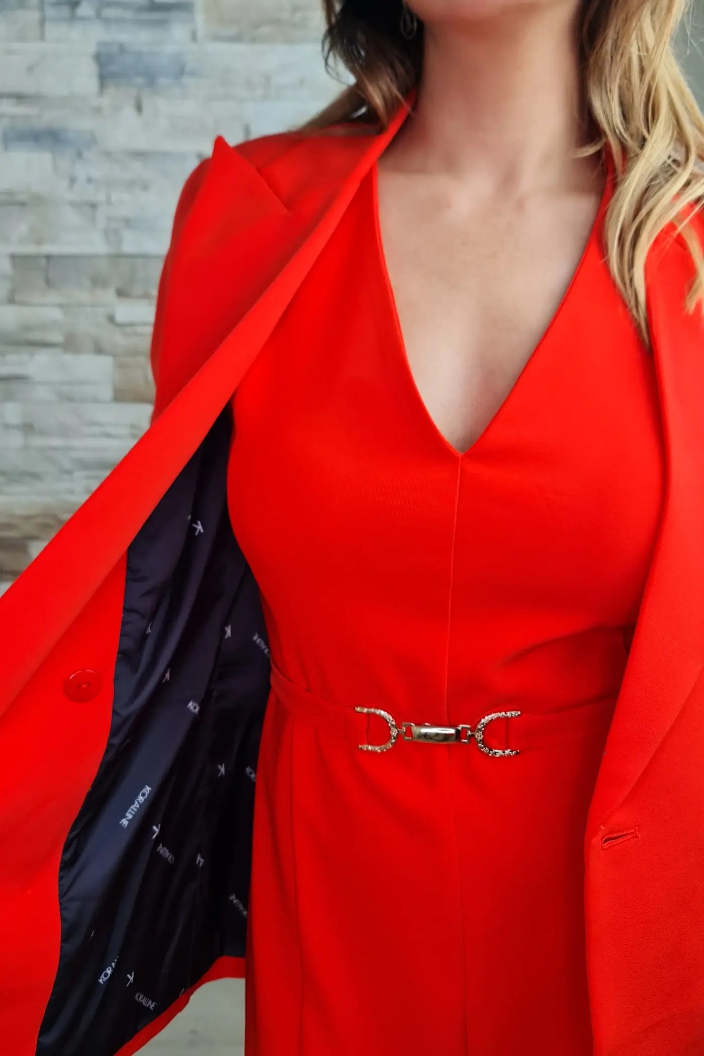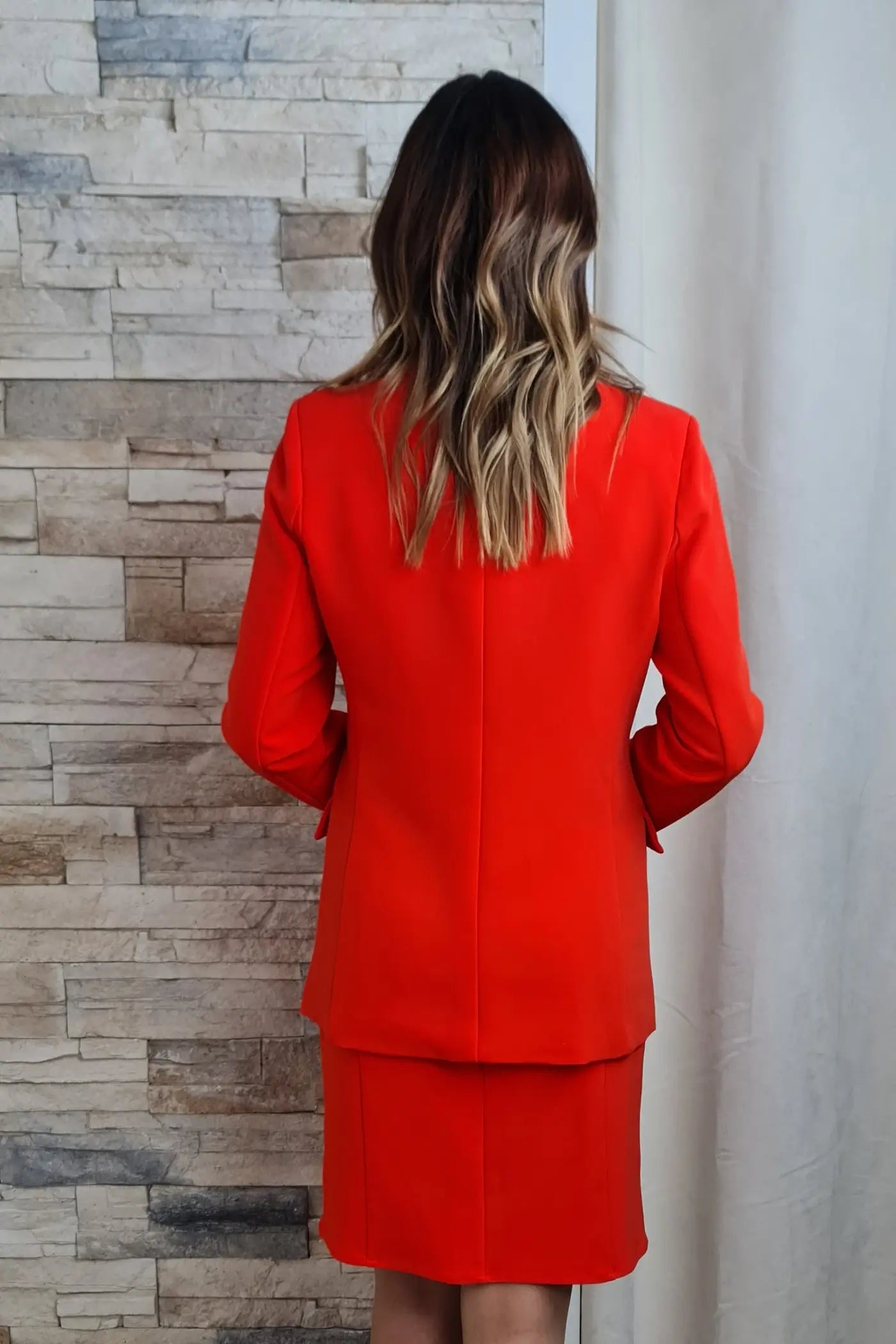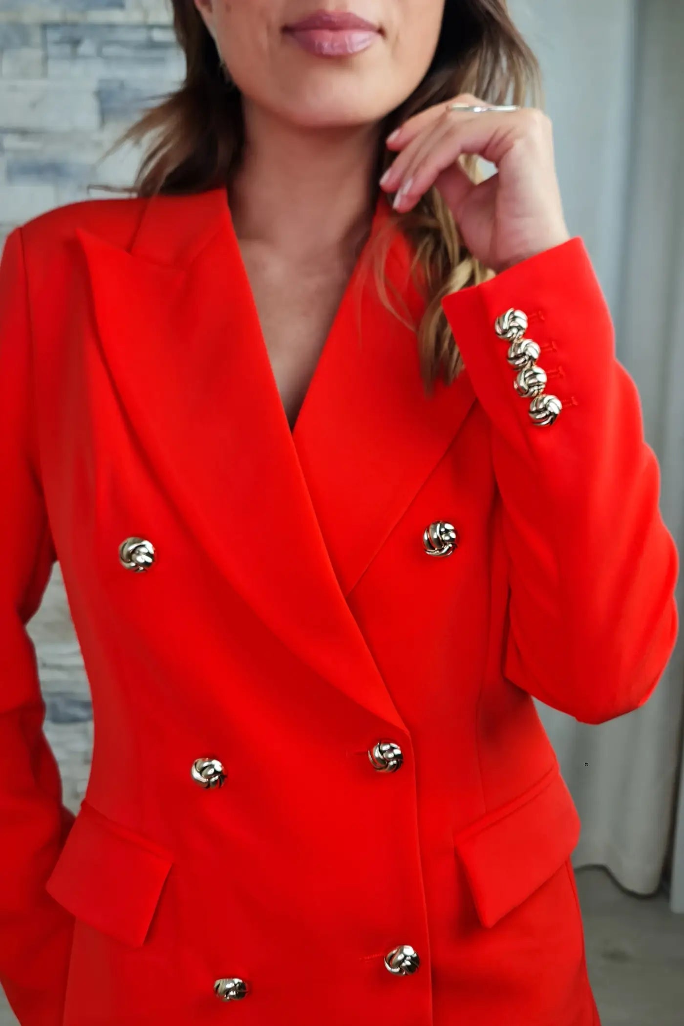 Ao vestir este blazer, sentirá a força e o calor da cor laranja vibrante, que evoca a paixão e a determinação, proporcionando uma sensação imediata de confiança e entusiasmo. O seu corte trespassado, com as lapelas pronunciadas e a silhueta estruturada, confere-lhe um visual poderoso e elegante. Os botões metálicos dourados em destaque, tanto no fecho principal como nos punhos, não são apenas detalhes charmosos; são uma afirmação de luxo e personalidade.