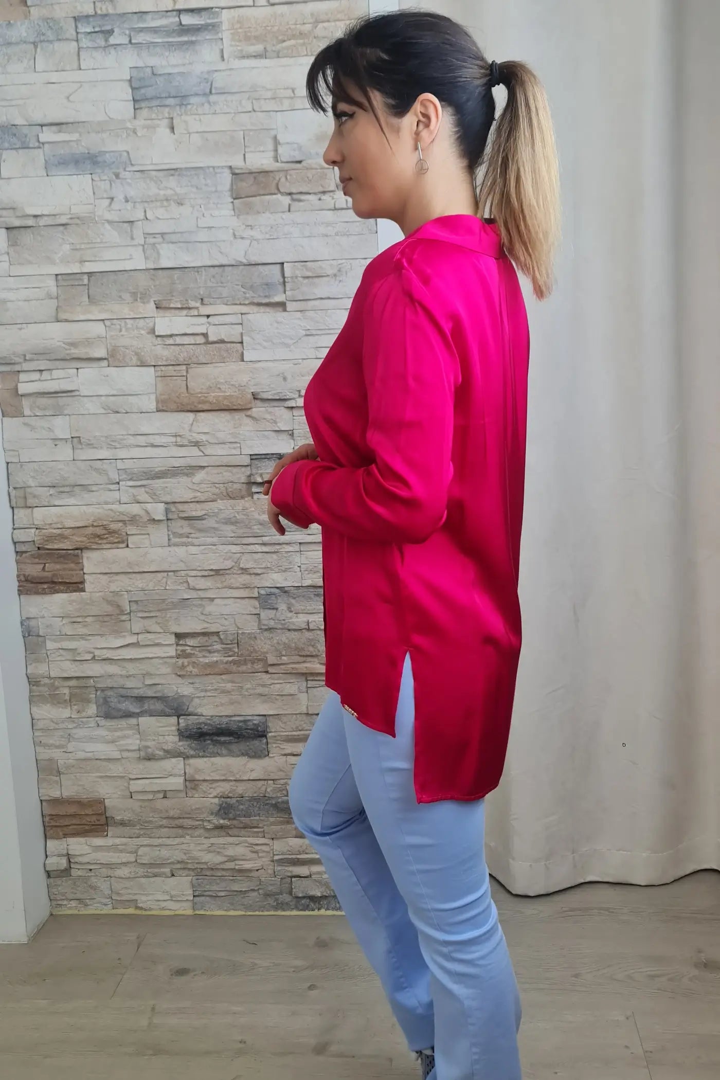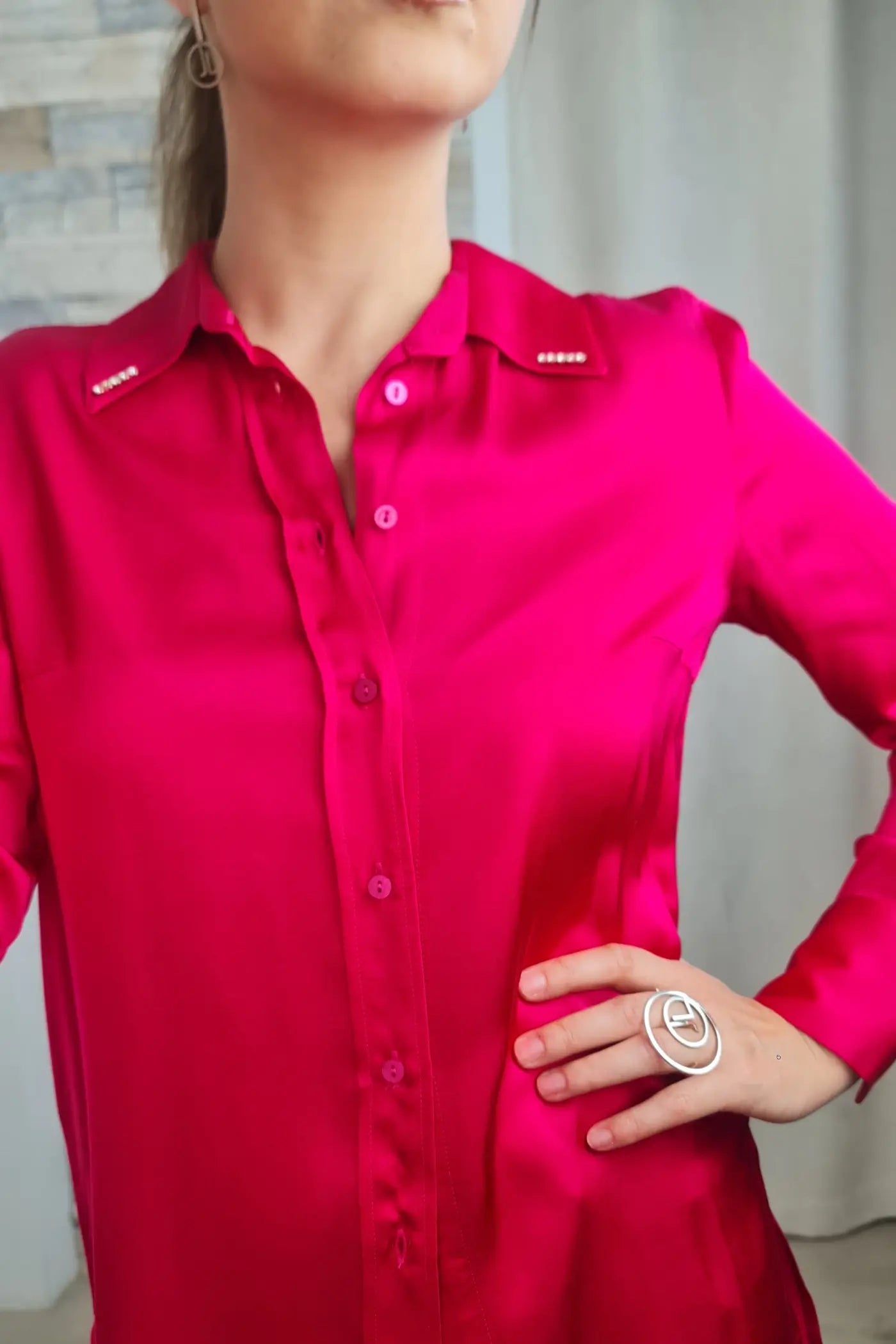A blusa exibida é de cor rosa vibrante (pink), com um acabamento acetinado que lhe confere um brilho suave. É uma camisa de manga comprida com colarinho. A parte frontal possui uma carcela de botões que vai do decote até a barra da blusa.