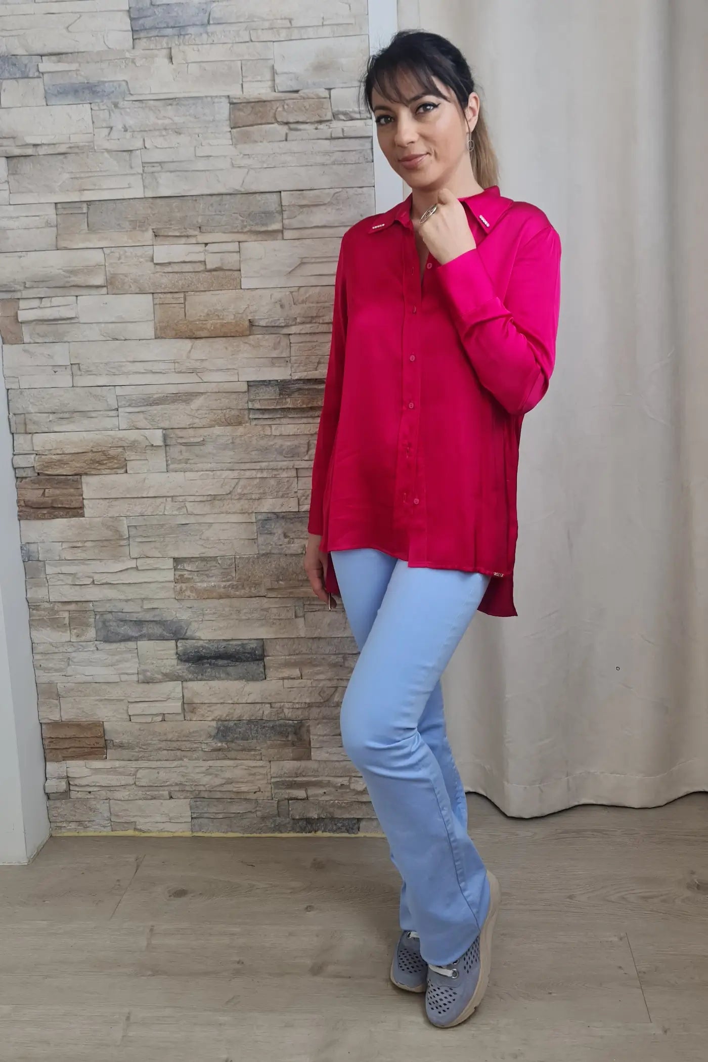 Um detalhe marcante são as aplicações brilhantes, dispostas ao longo das laterais do colarinho, adicionando um toque de elegância e brilho. As mangas estão dobradas na altura do pulso. A blusa tem um corte mais comprido na parte de trás.