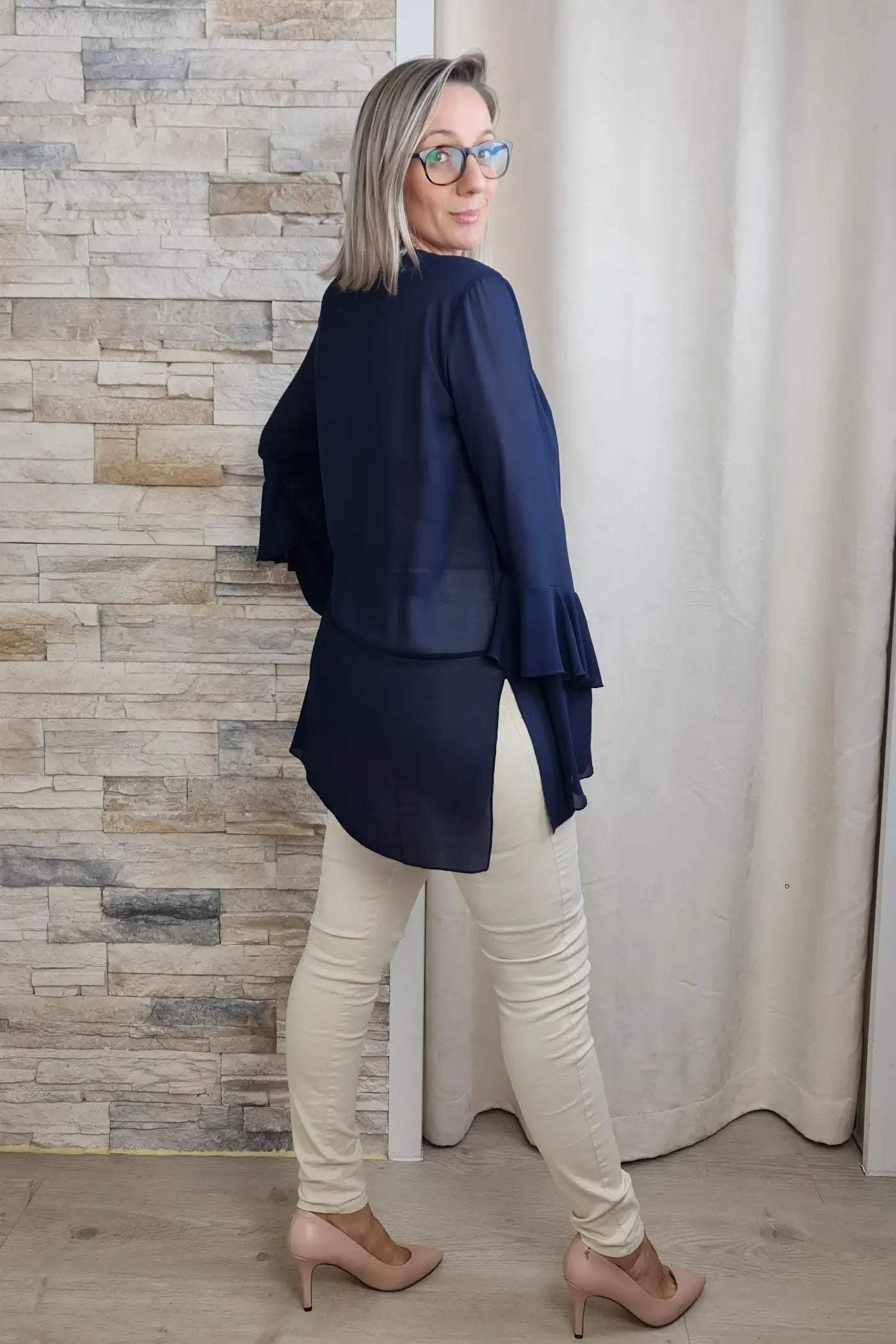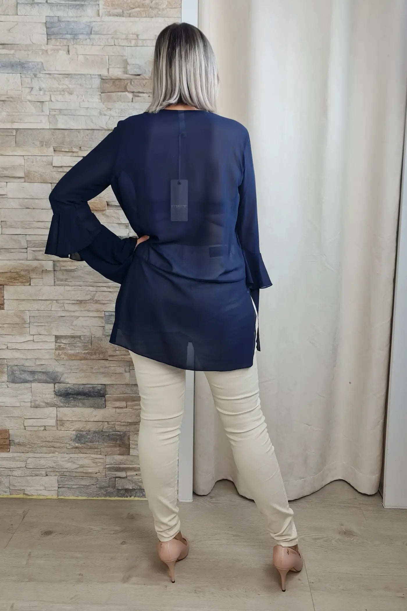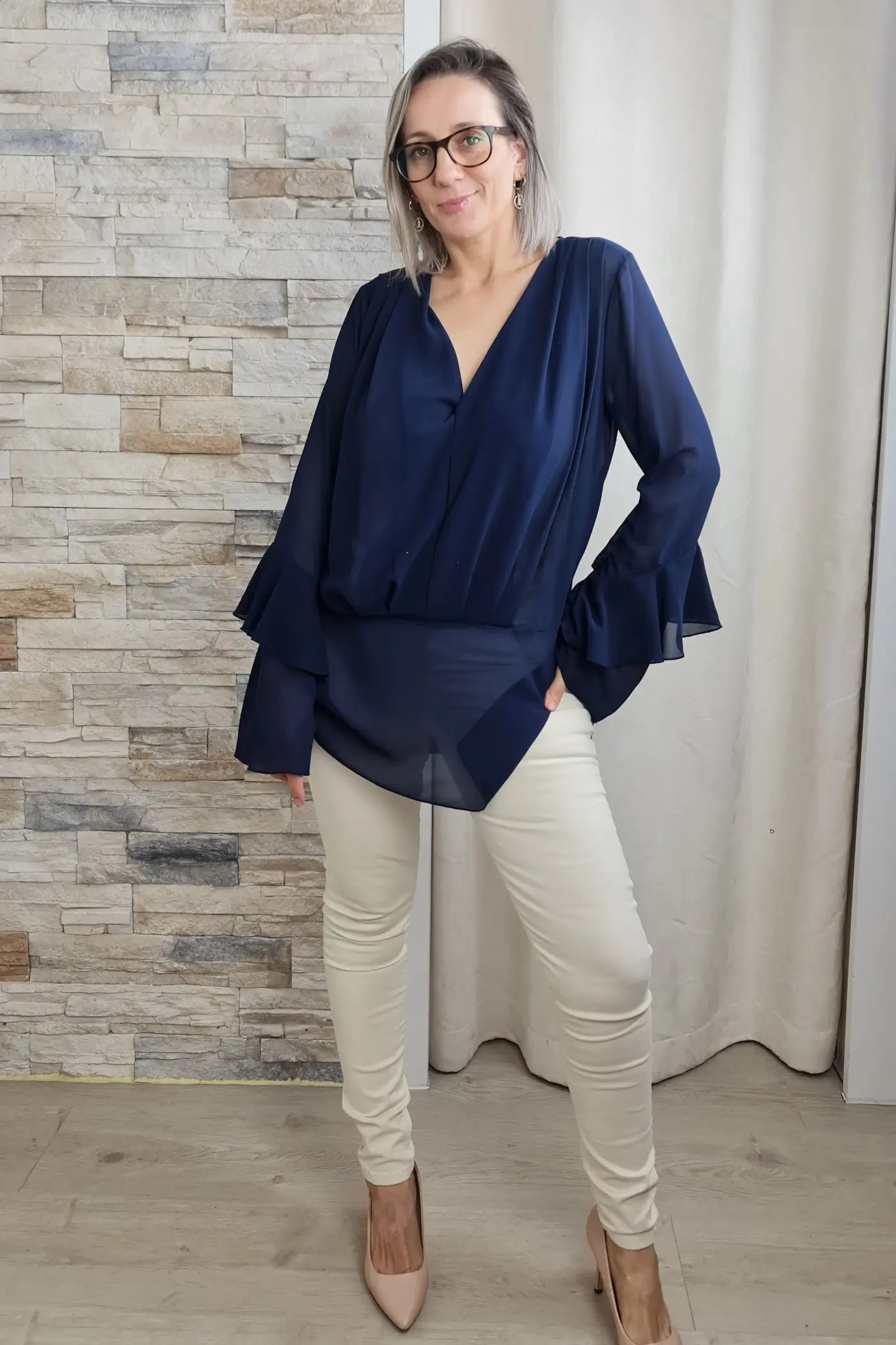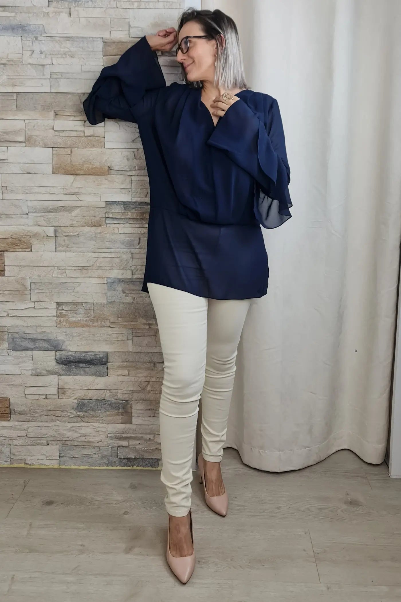 Ao vestir esta blusa, o seu tom azul marinho, que evoca a serenidade do oceano e a leveza do céu, proporciona uma sensação de calma e otimismo. O corte reto e o colarinho dobrado conferem-lhe um visual profissional e elegante, sem comprometer o conforto. O seu design com botões dourados, confere um toque de originalidade, convidando-a a expressar a sua personalidade de forma autêntica e descomplicada.