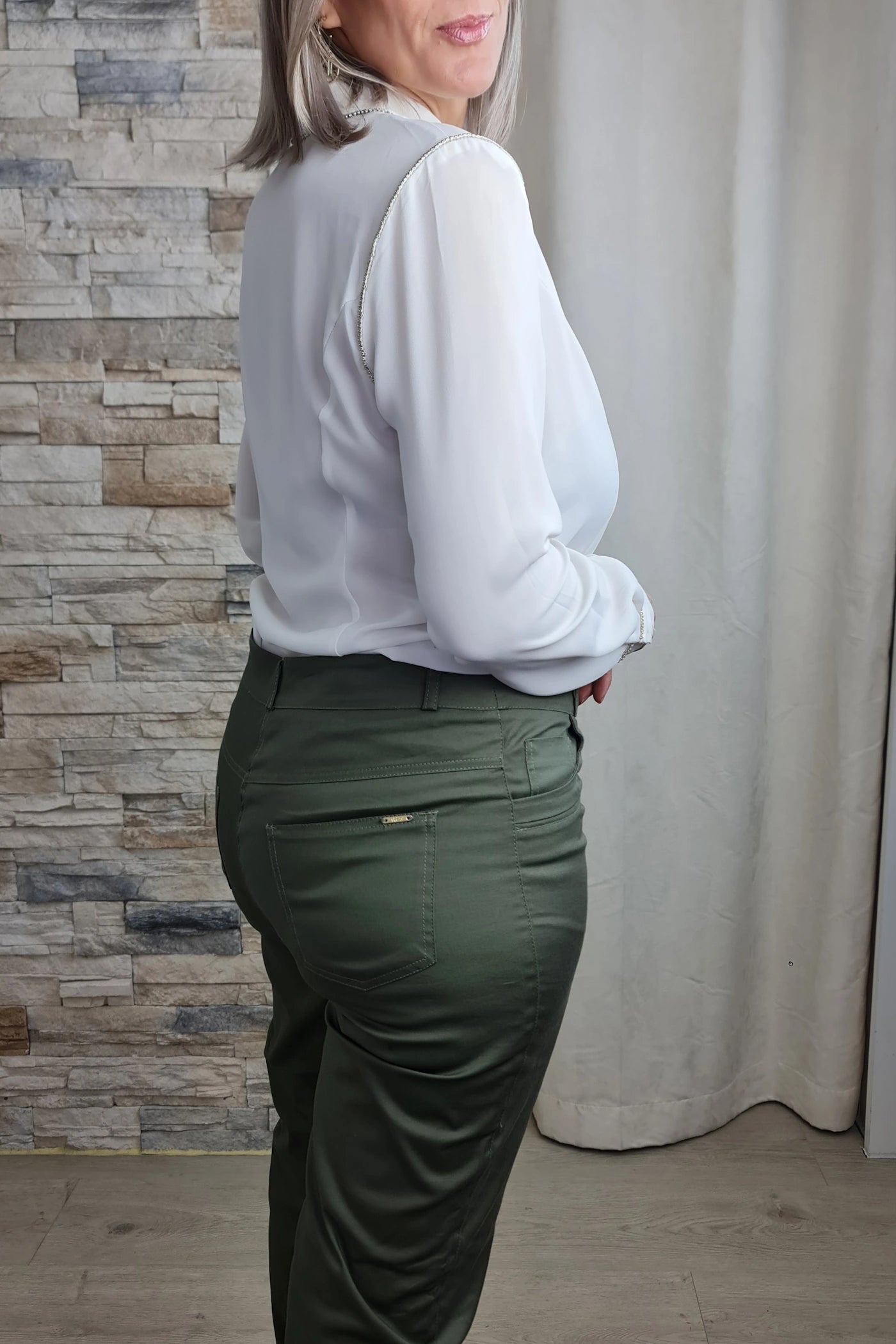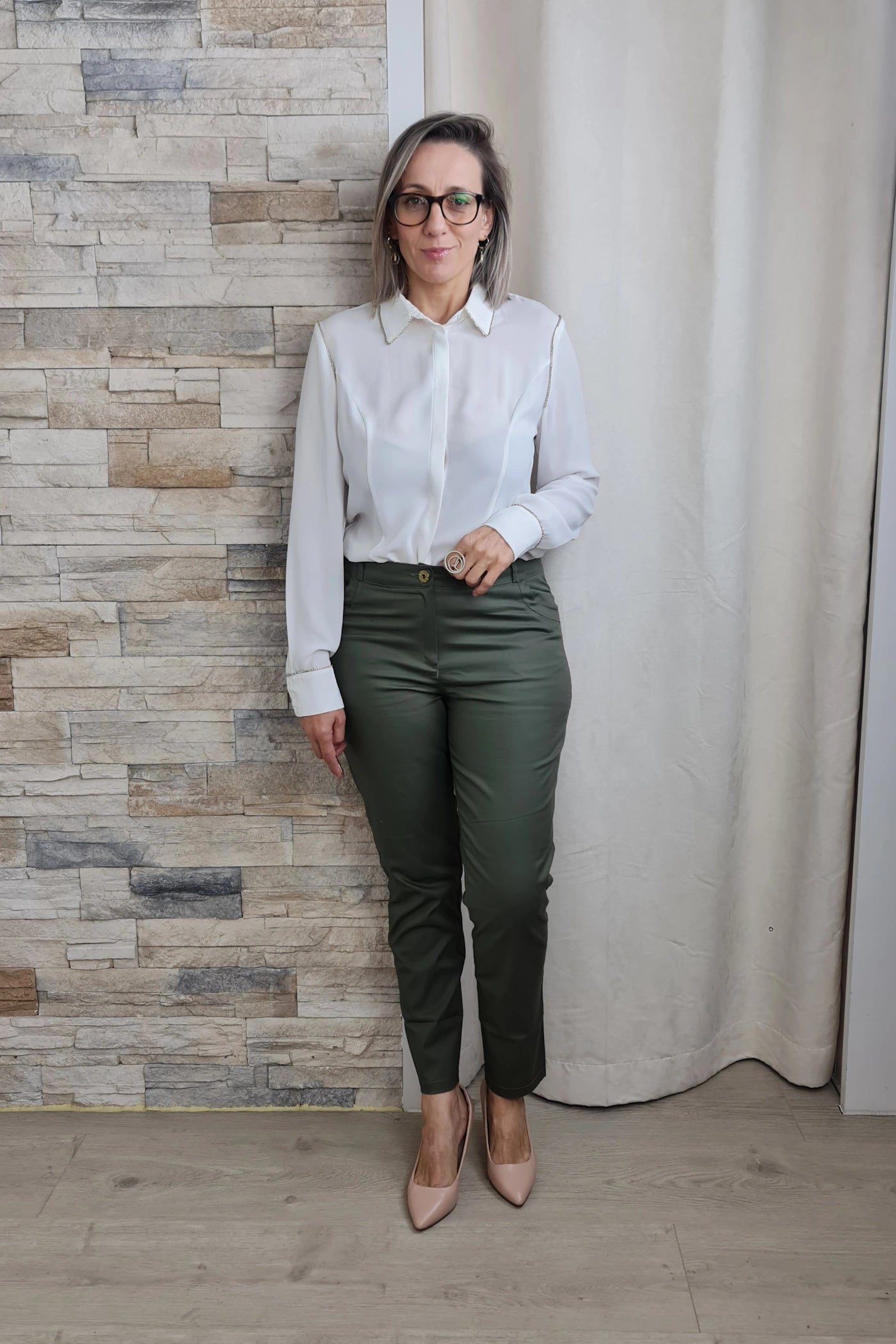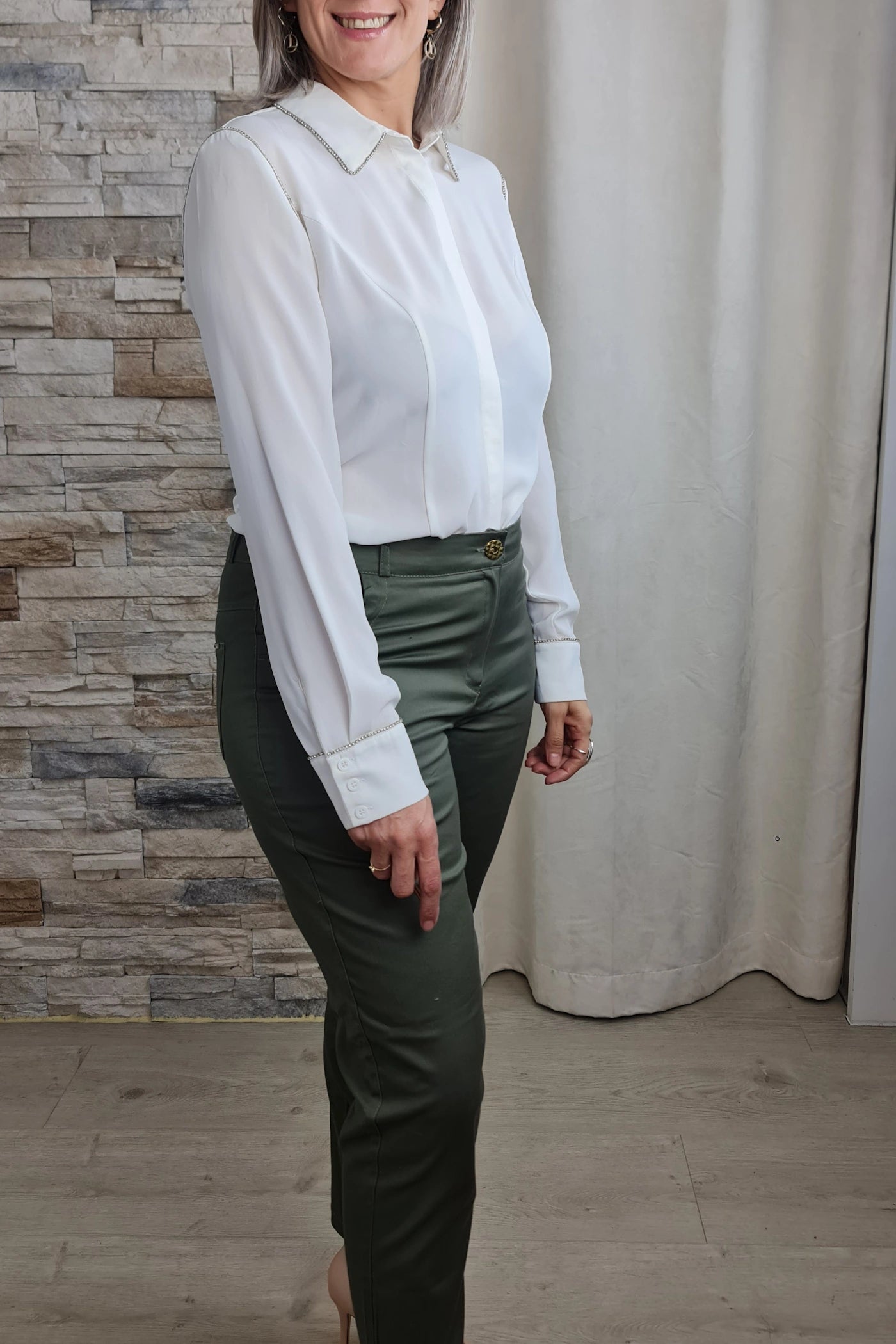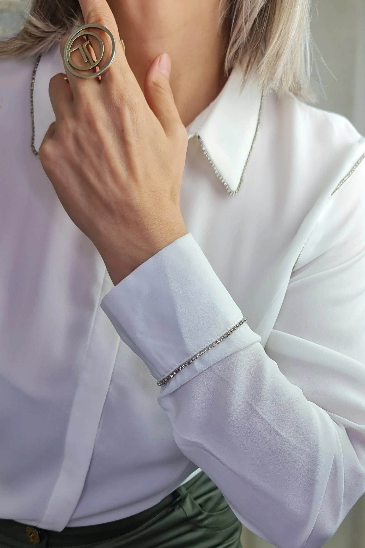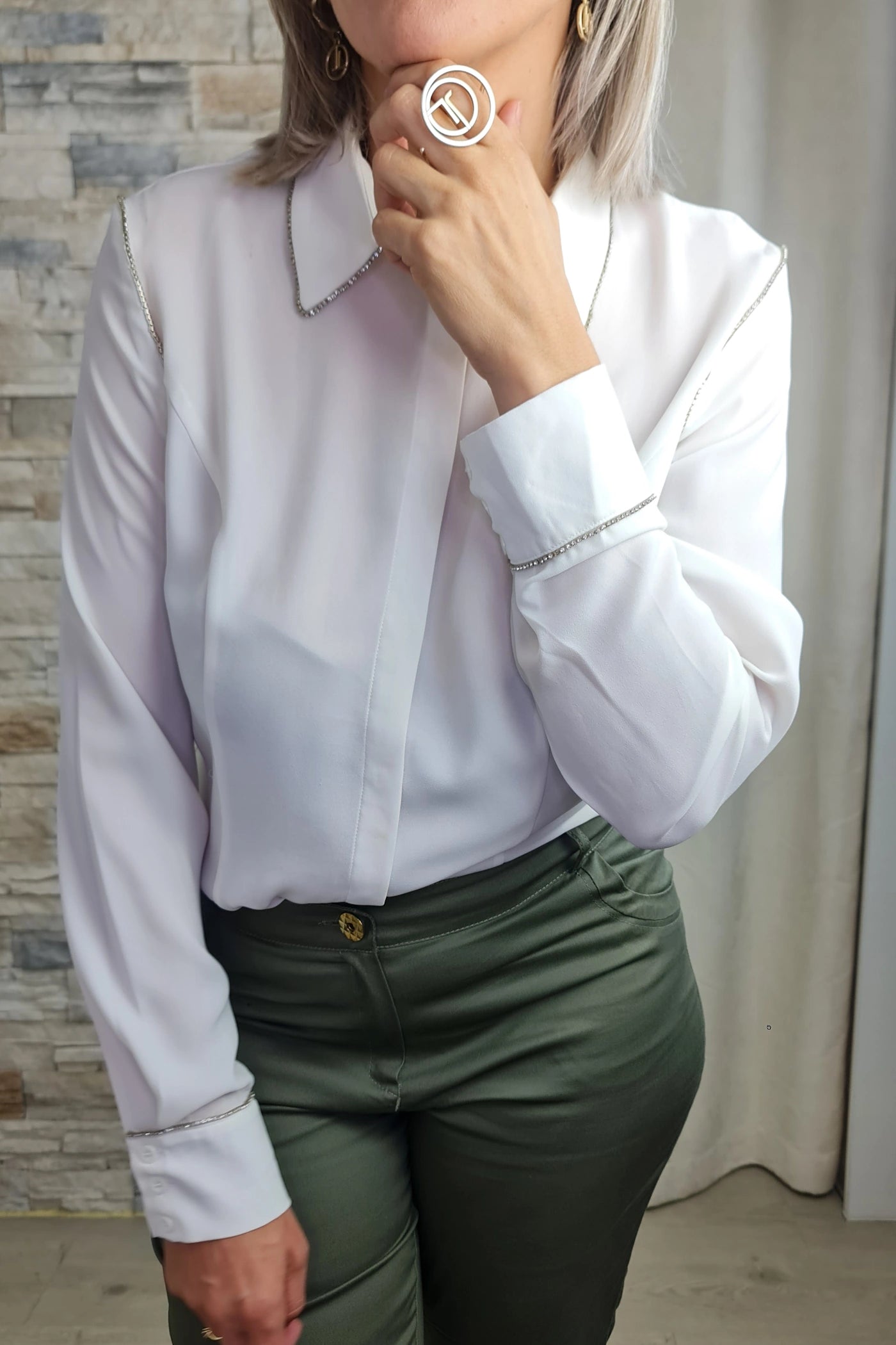 Ao vestir esta blusa, a sua cor branca, que evoca a pureza e a leveza, proporciona uma sensação imediata de clareza e paz. O seu corte ajustado, com a gola de colarinho, confere-lhe um visual profissional e elegante, sem comprometer o conforto. Os seus pormenores brilhantes nas mangas e na gola, adicionam um toque de originalidade, convidando-a a expressar a sua personalidade de forma autêntica e descomplicada.