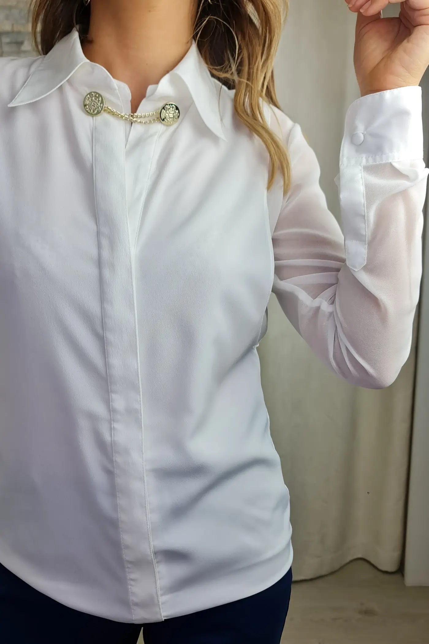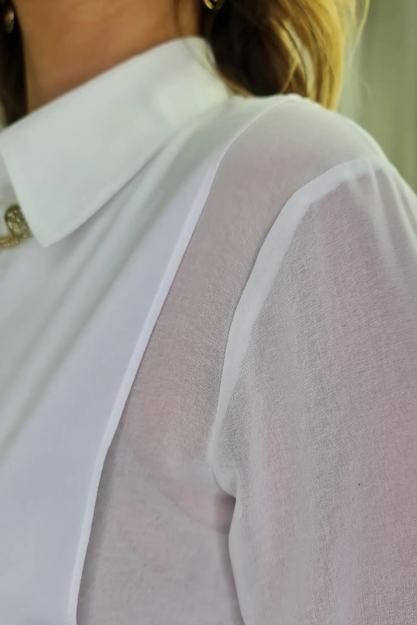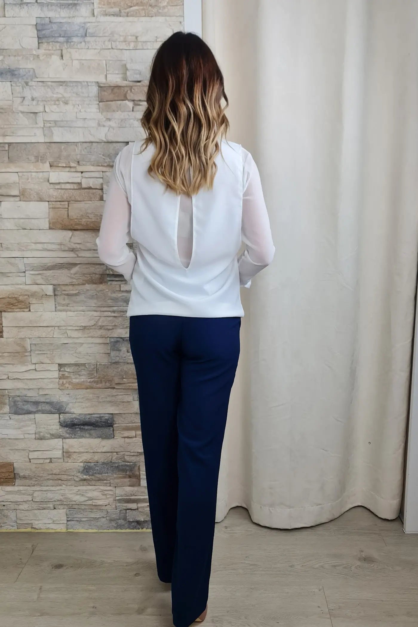 Ao vestir esta blusa, o seu tom suave e brilhante, que evoca a serenidade de um dia calmo, proporciona uma sensação de calma e otimismo. O design com ombros à mostra e os laços nas mangas não são apenas um detalhe, são uma afirmação da sua ousadia e coragem de ser quem realmente é.
