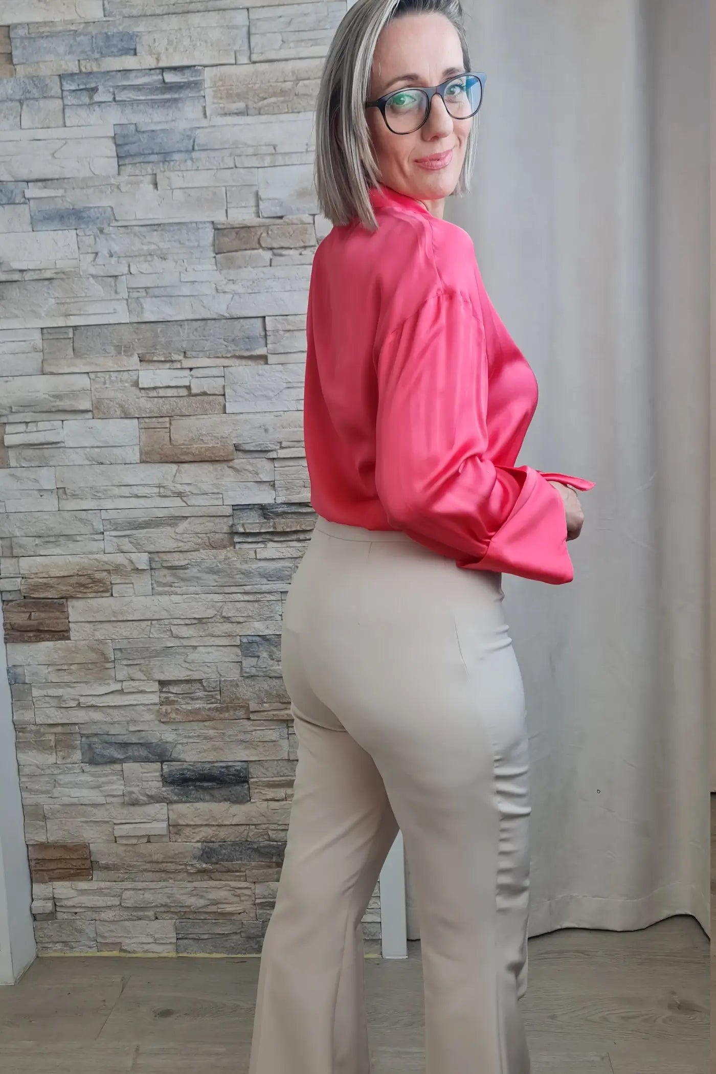 A blusa é de cor coral, com um acabamento acetinado que lhe confere um brilho suave. É um modelo de camisa com gola e botões frontais na mesma cor. As mangas são compridas e largas, com um detalhe de dobra nos punhos que as faz parecer um efeito de camada. A blusa é usada com um nó na parte da frente, criando um efeito cropped.