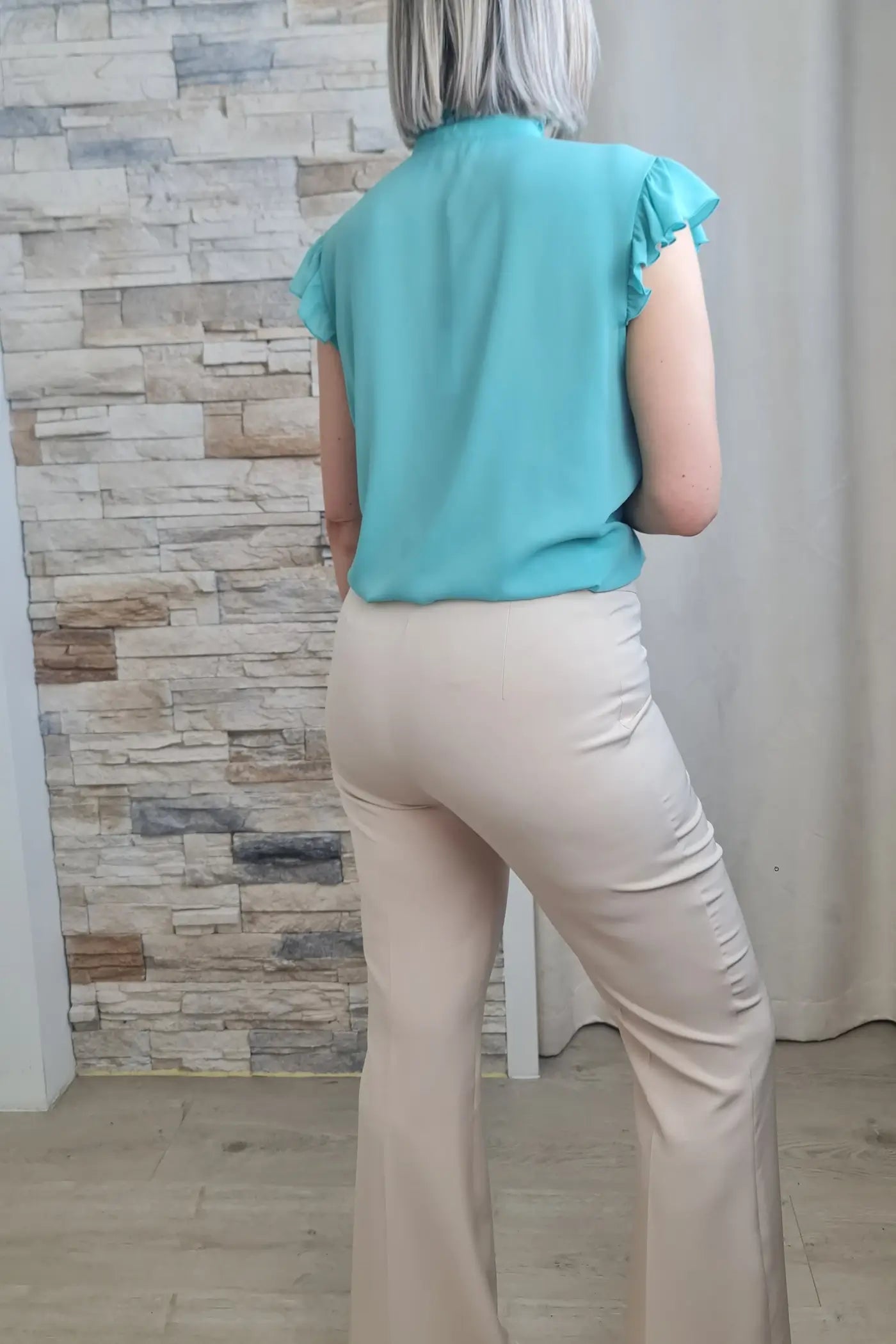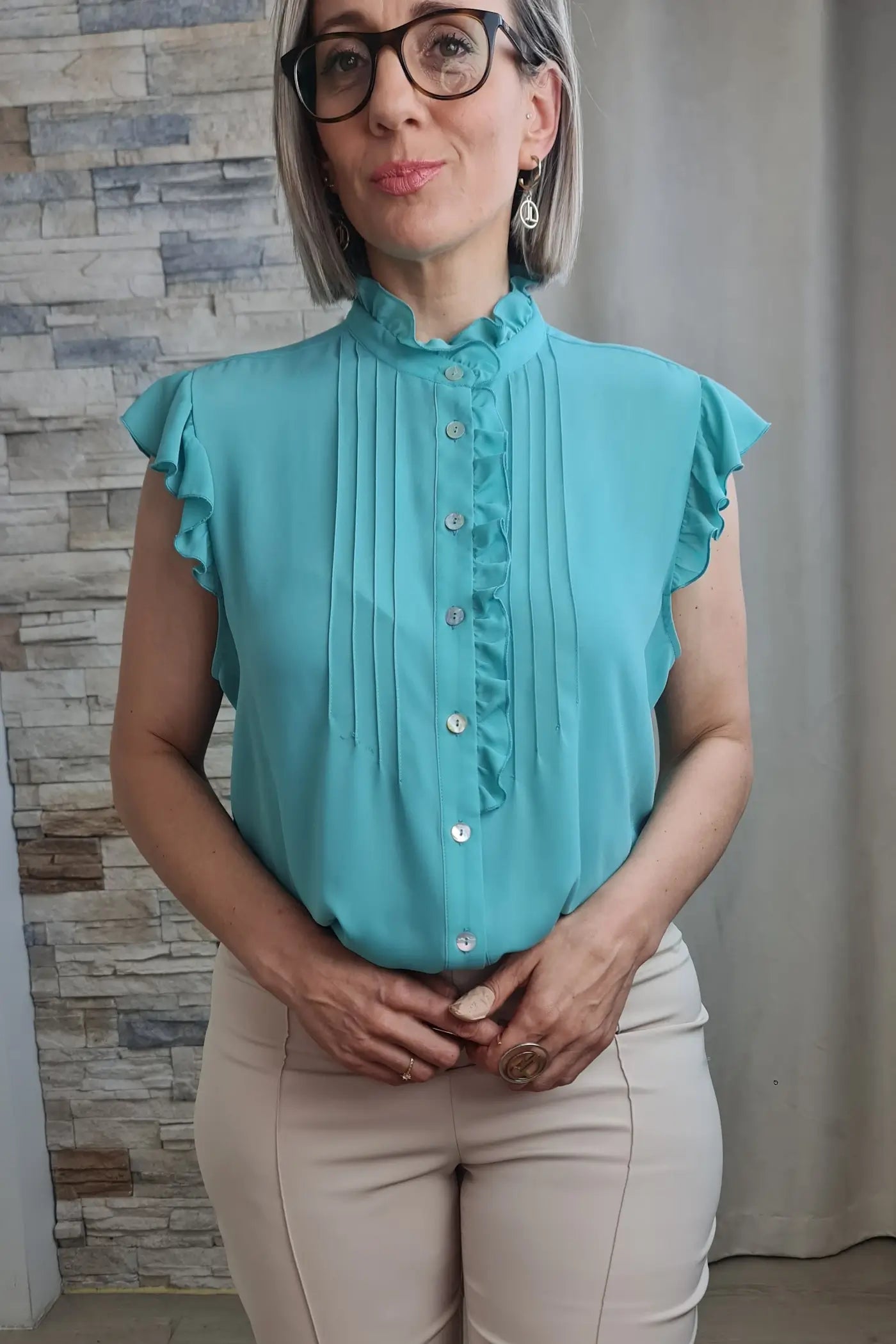 A blusa exibida é de cor verde azulado, com um design delicado e romântico. Possui um decote alto com um pequeno folho e os botões estão presentes na parte frontal. A frente da blusa tem pregas verticais que adicionam textura. As mangas são curtas, estilo borboleta, com babados que caem sobre os ombros.