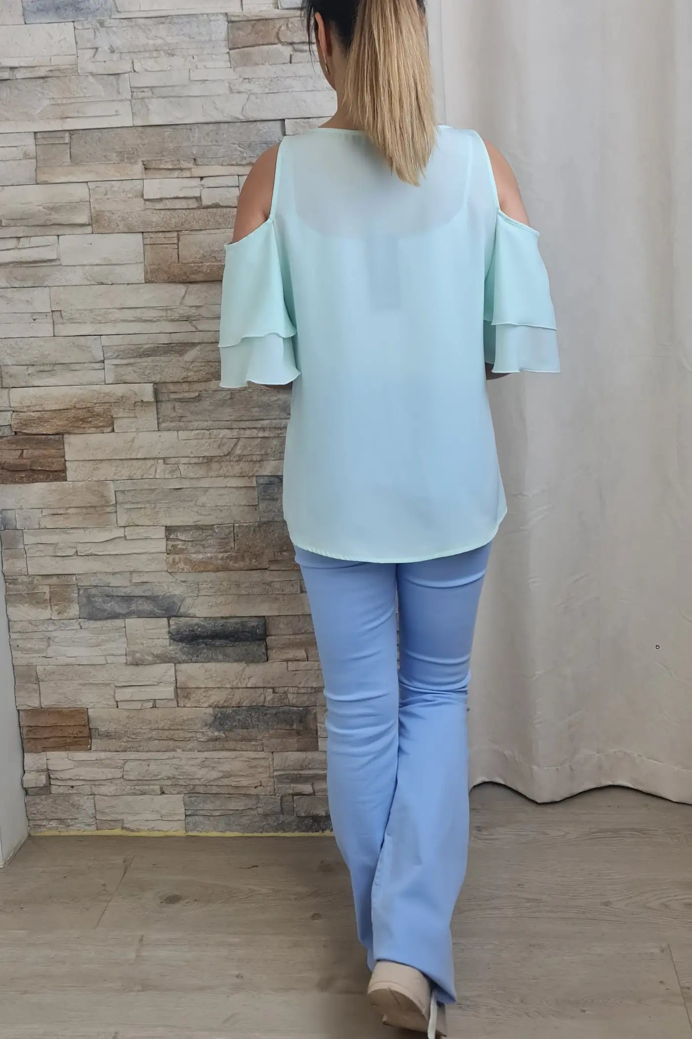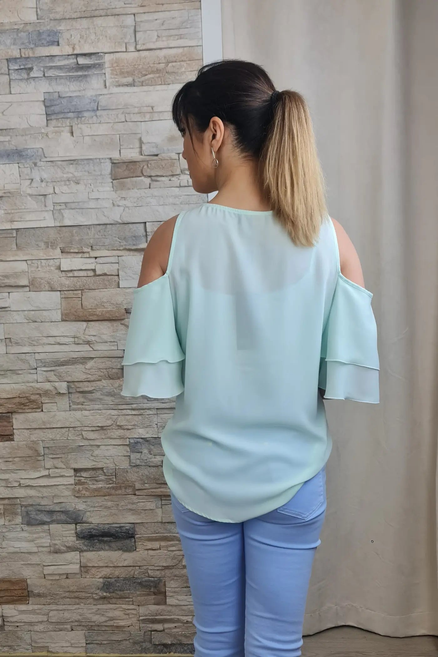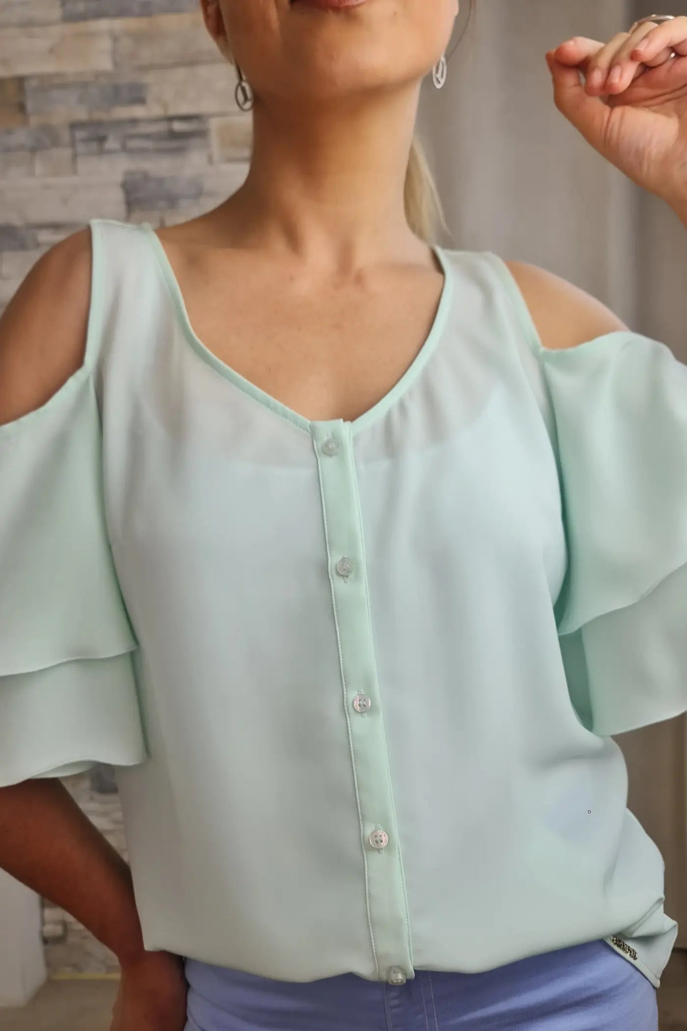 A blusa exibida é de cor verde-água clara e possui um design que deixa os ombros à mostra. O decote é redondo e tem uma carcela com botões brancos na parte frontal. As mangas são curtas e têm um estilo fluido com camadas, adicionando movimento à peça. O tecido é leve e transparente.