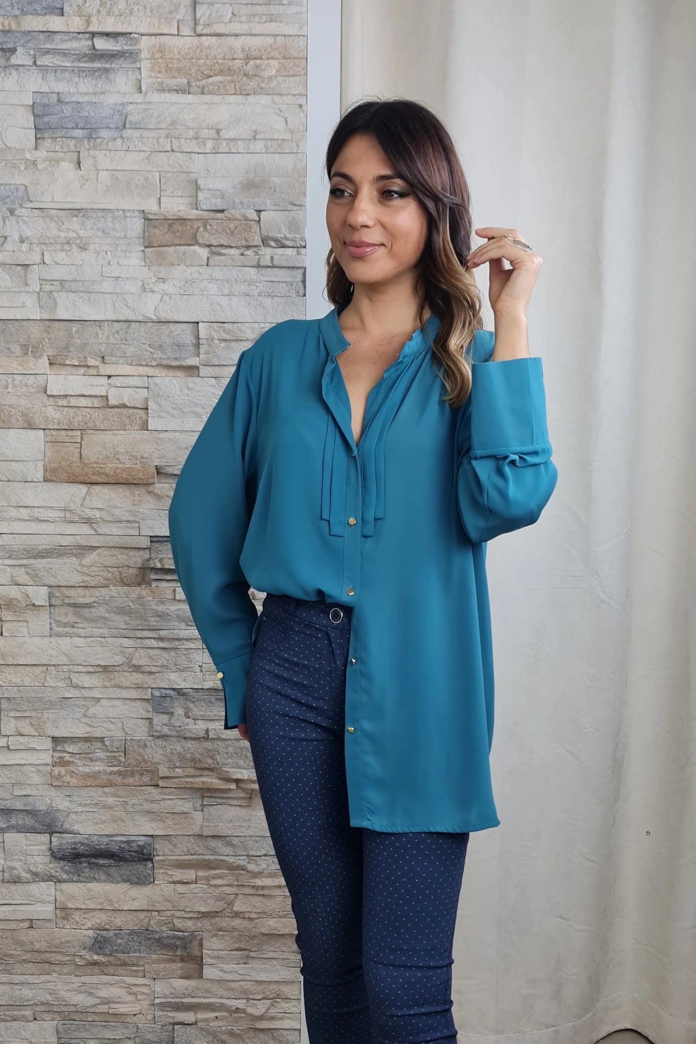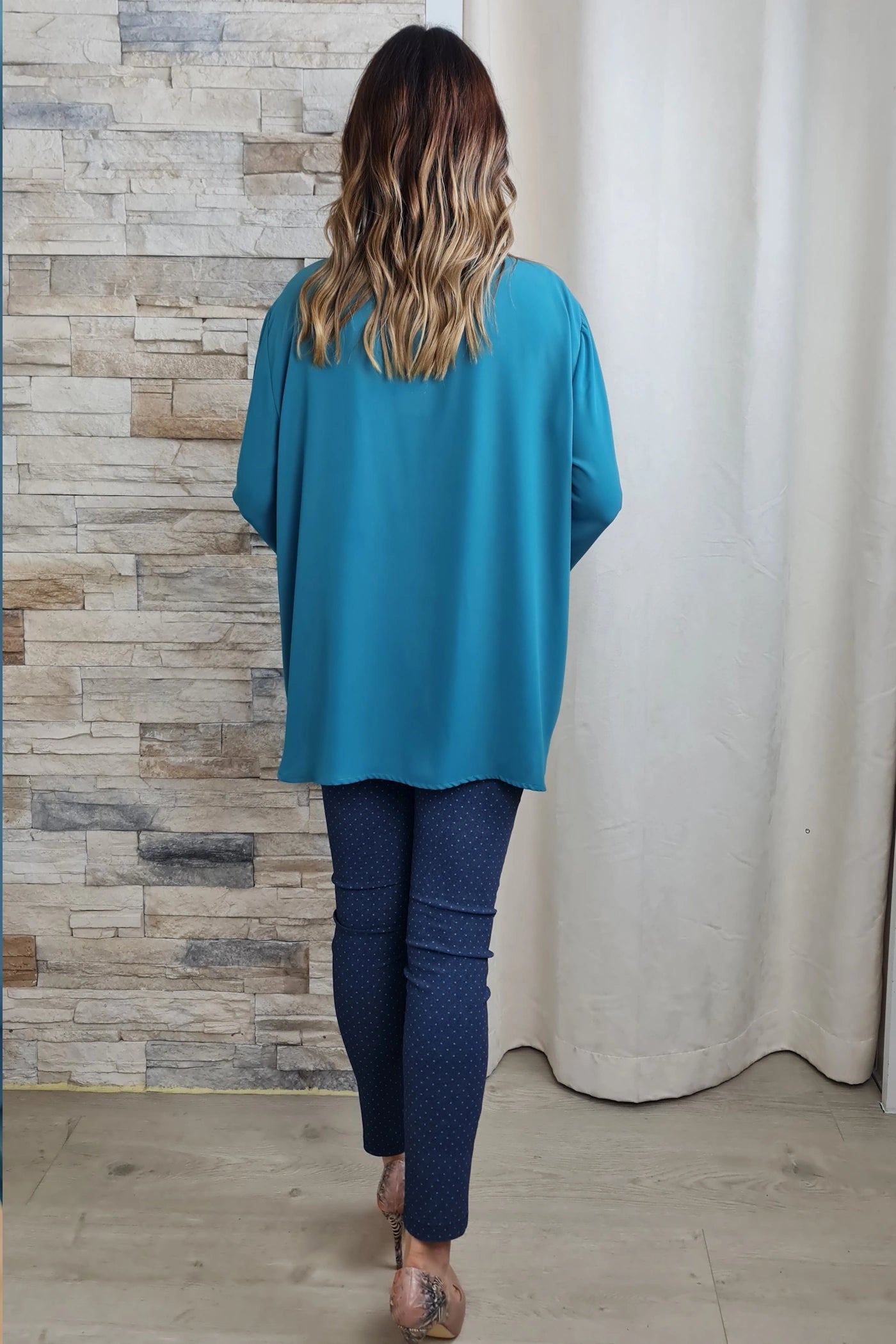 Ao vestir esta blusa, sentirá o tecido leve e fluído a deslizar suavemente, proporcionando uma sensação imediata de bem-estar. A sua cor azul turquesa, rica e profunda, evoca a calma do oceano e a energia de um céu aberto, infundindo em si uma dose de otimismo e clareza. O decote em V, elegante e sem esforço, e os detalhes de pregas verticais na frente, conferem um toque de sofisticação discreta, realçando a sua beleza natural.