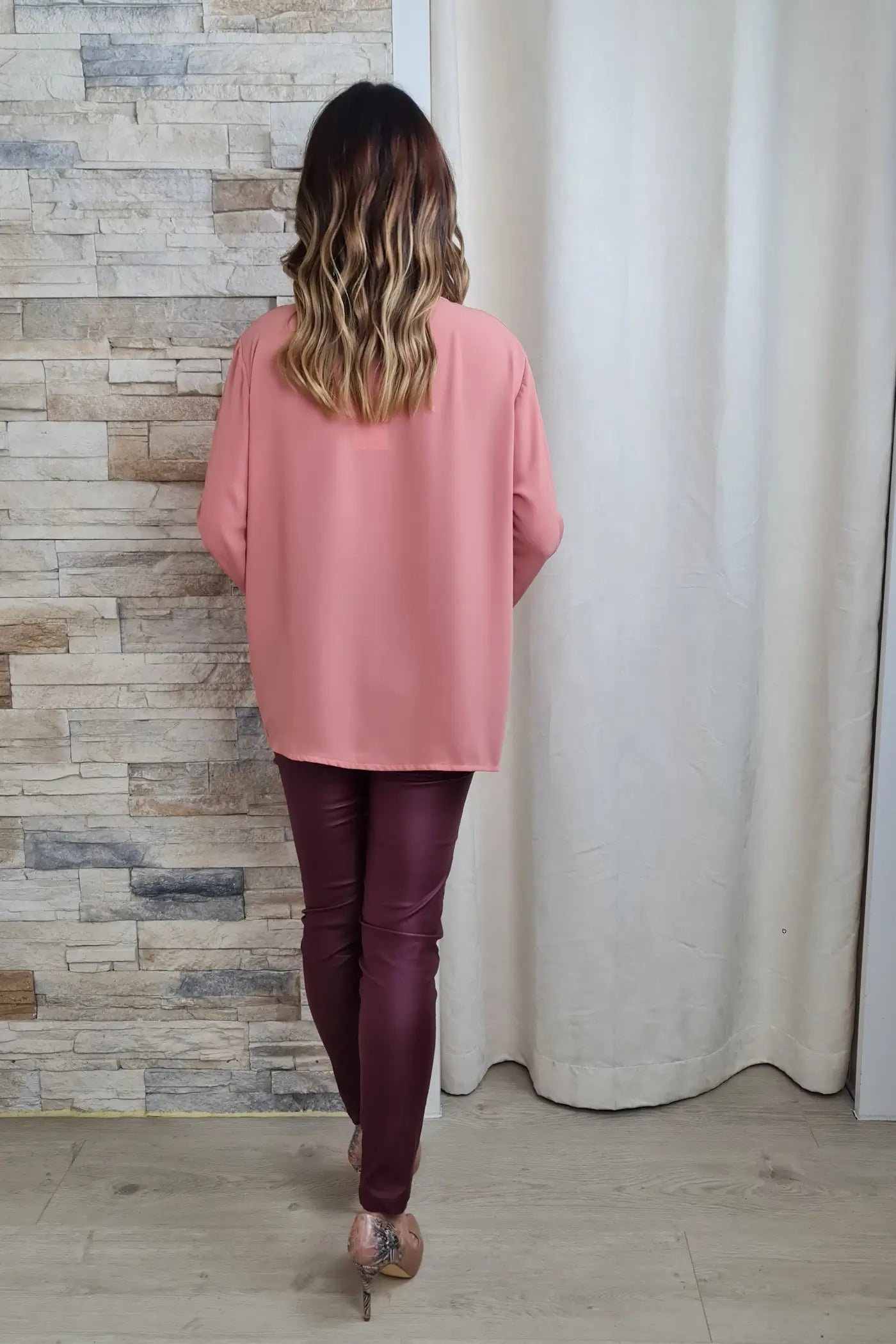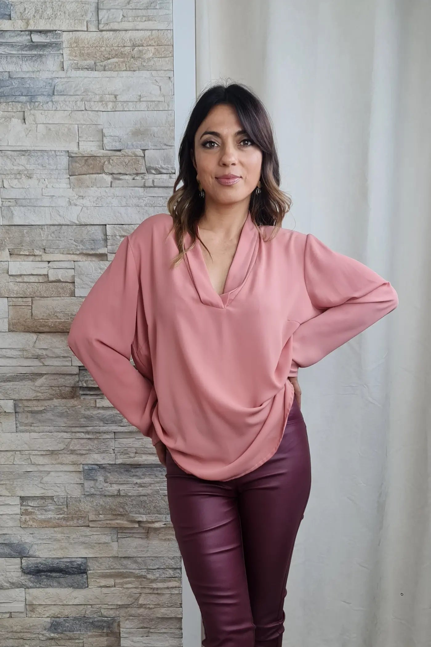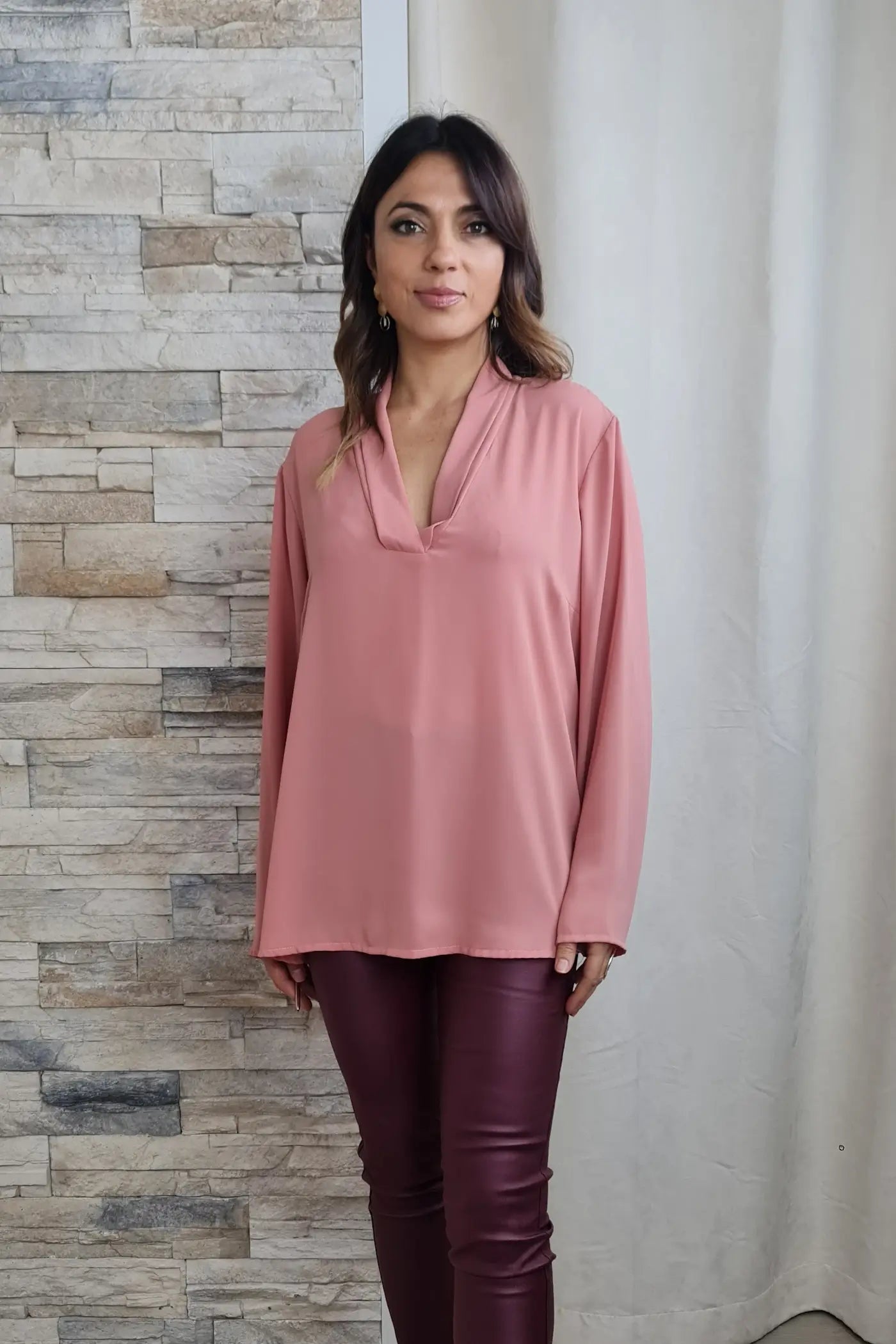 Ao vestir esta blusa, a sua cor rosa, que evoca a doçura e a calma, transmite uma sensação imediata de serenidade e paz. O seu corte ajustado, com a gola clássica e os folhos a percorrer o peito, confere-lhe um visual feminino e confiante, sem comprometer o conforto.