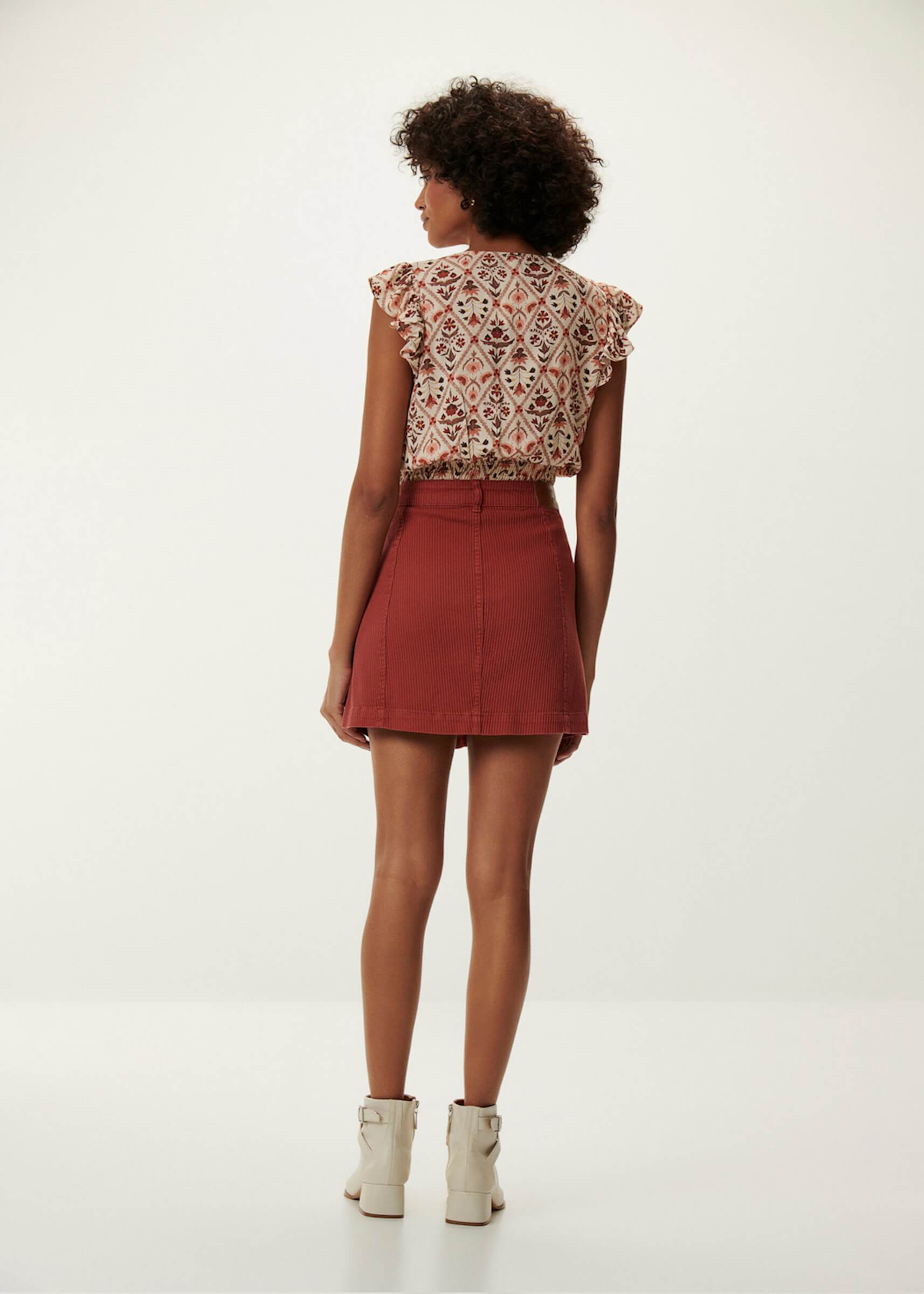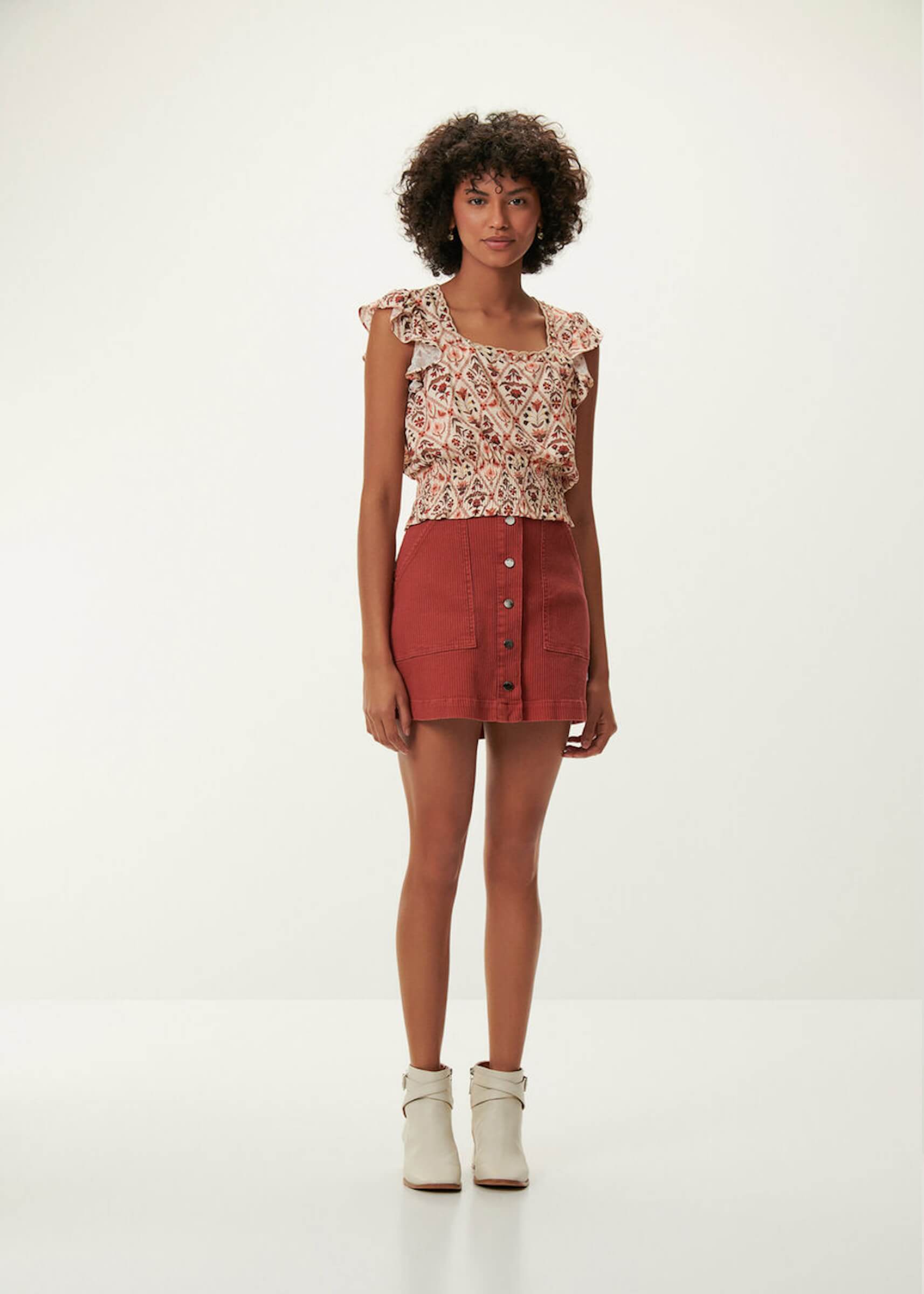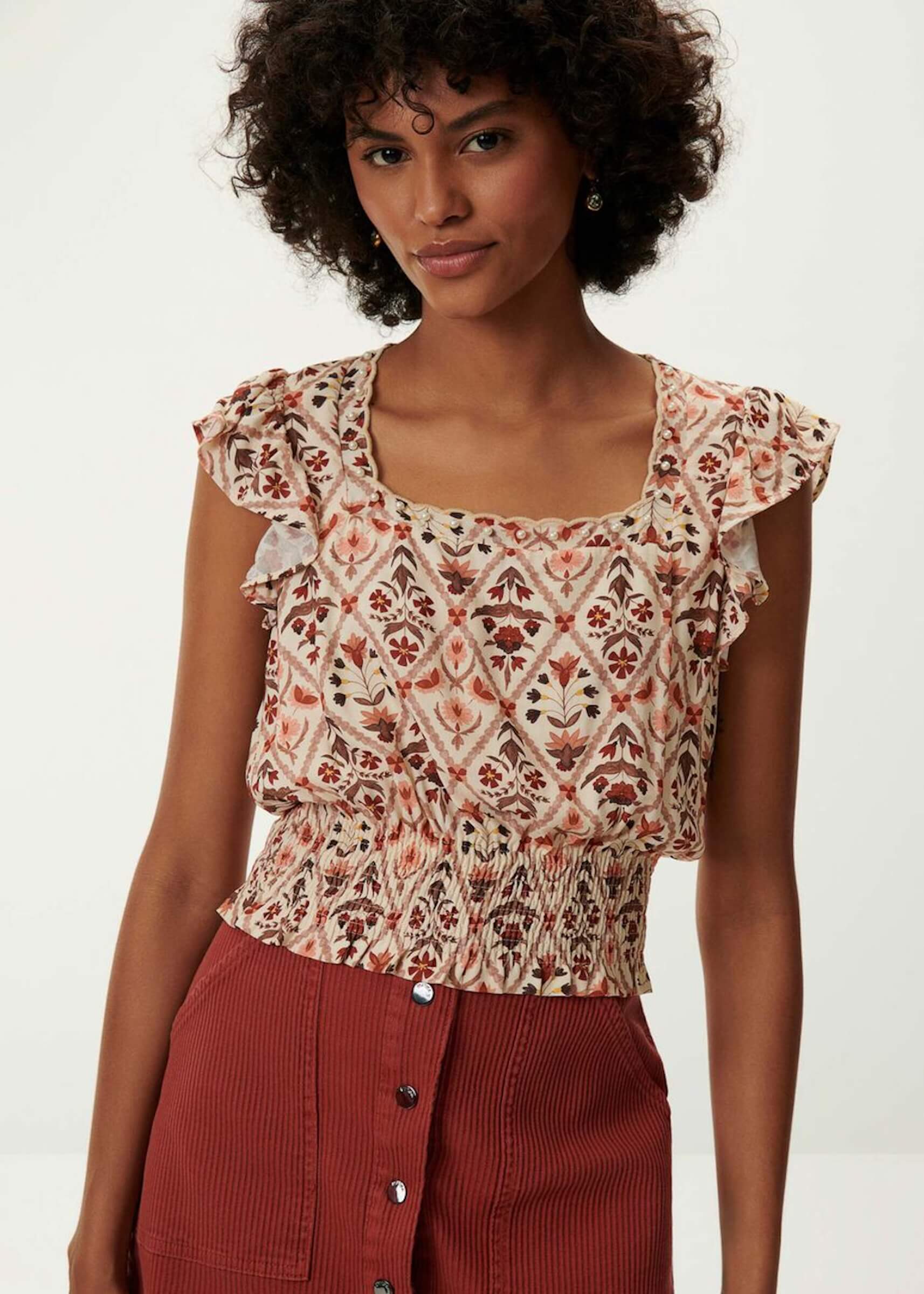 O design é uma celebração da arte e feminilidade. Com um decote quadrado e mangas curtas com babados, destaca-se pela estampa abstrata em tons terrosos e pastéis, criando um padrão visualmente rico e artístico.