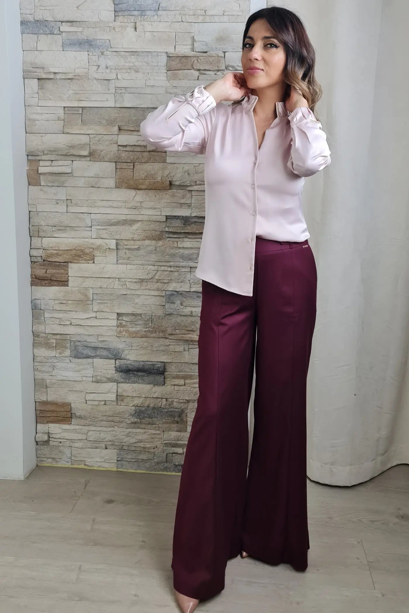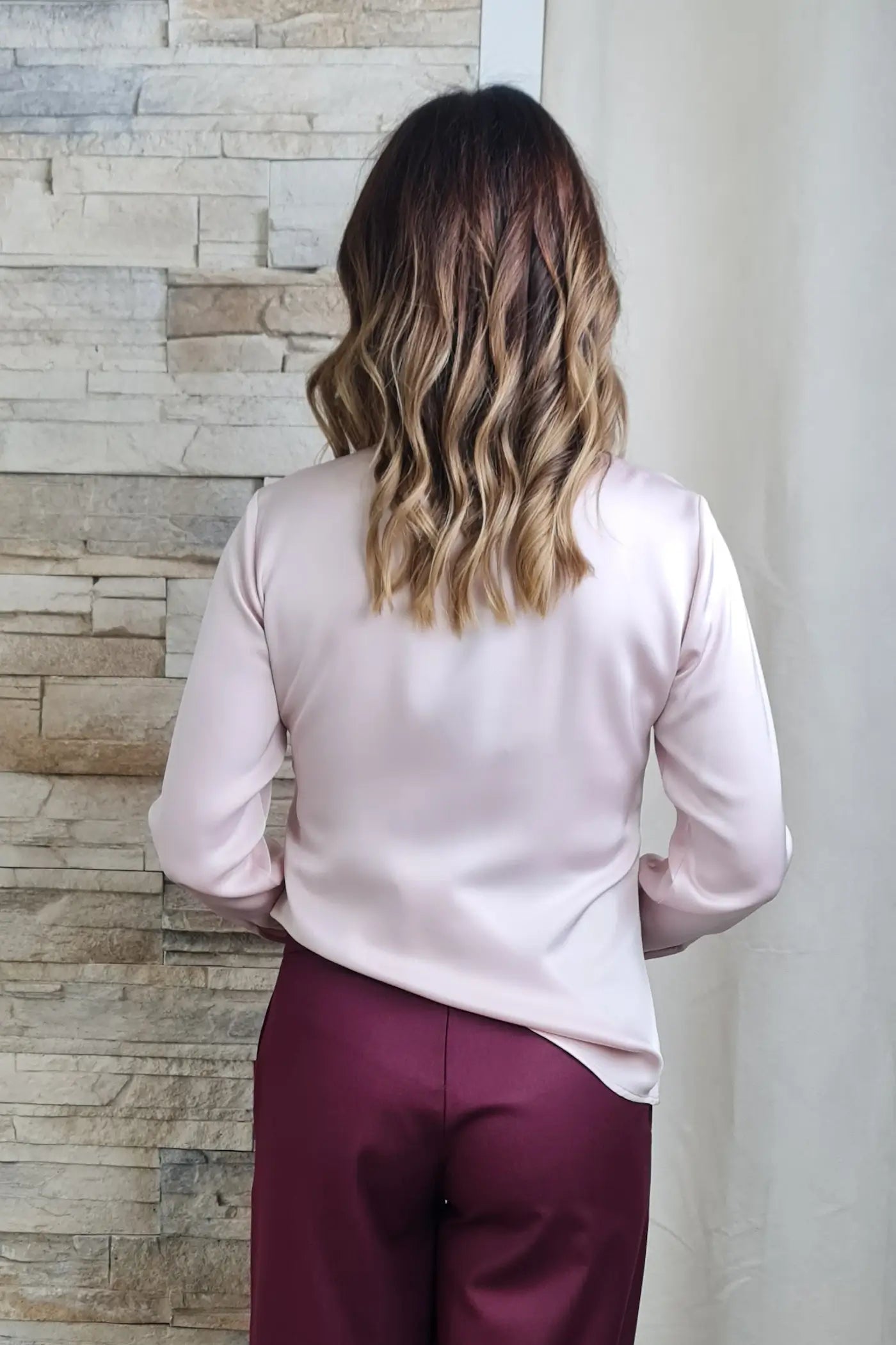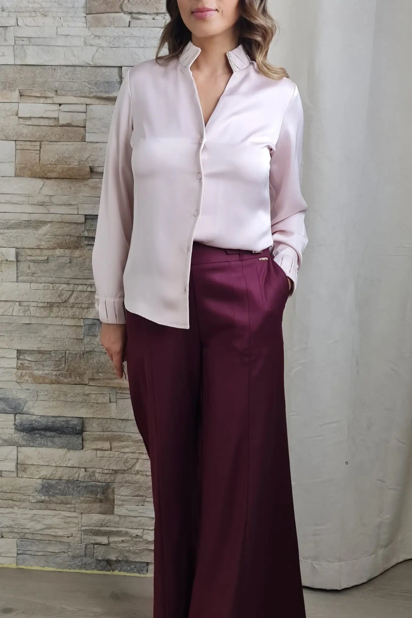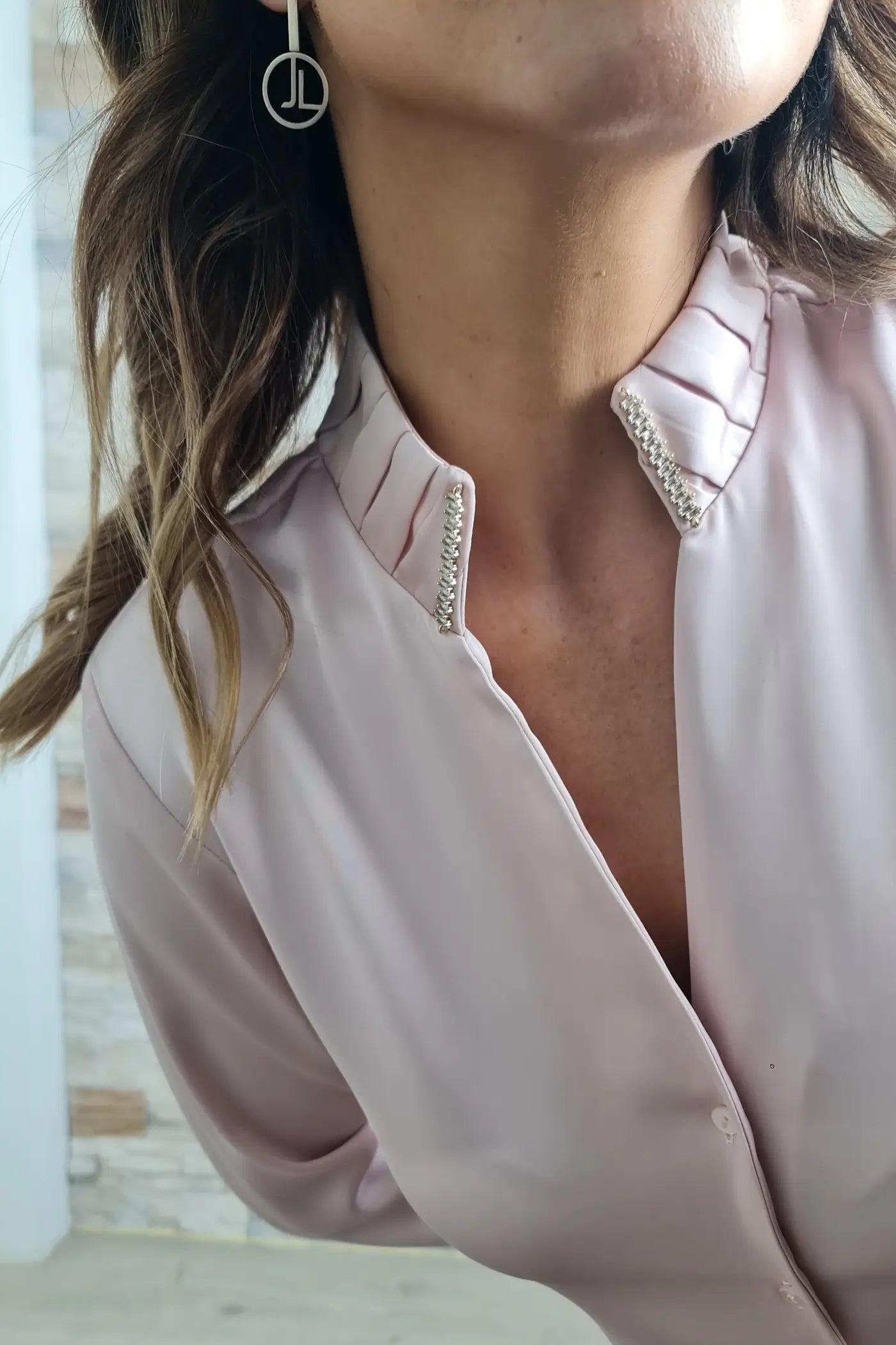O design é clássico com um toque moderno. Em tom rosa claro suave, destaca-se pela gola alta com pregas e detalhes brilhantes, que adicionam um brilho discreto e sofisticado. A abotoadura frontal e as mangas compridas com punhos finos franzidos completam o visual elegante.