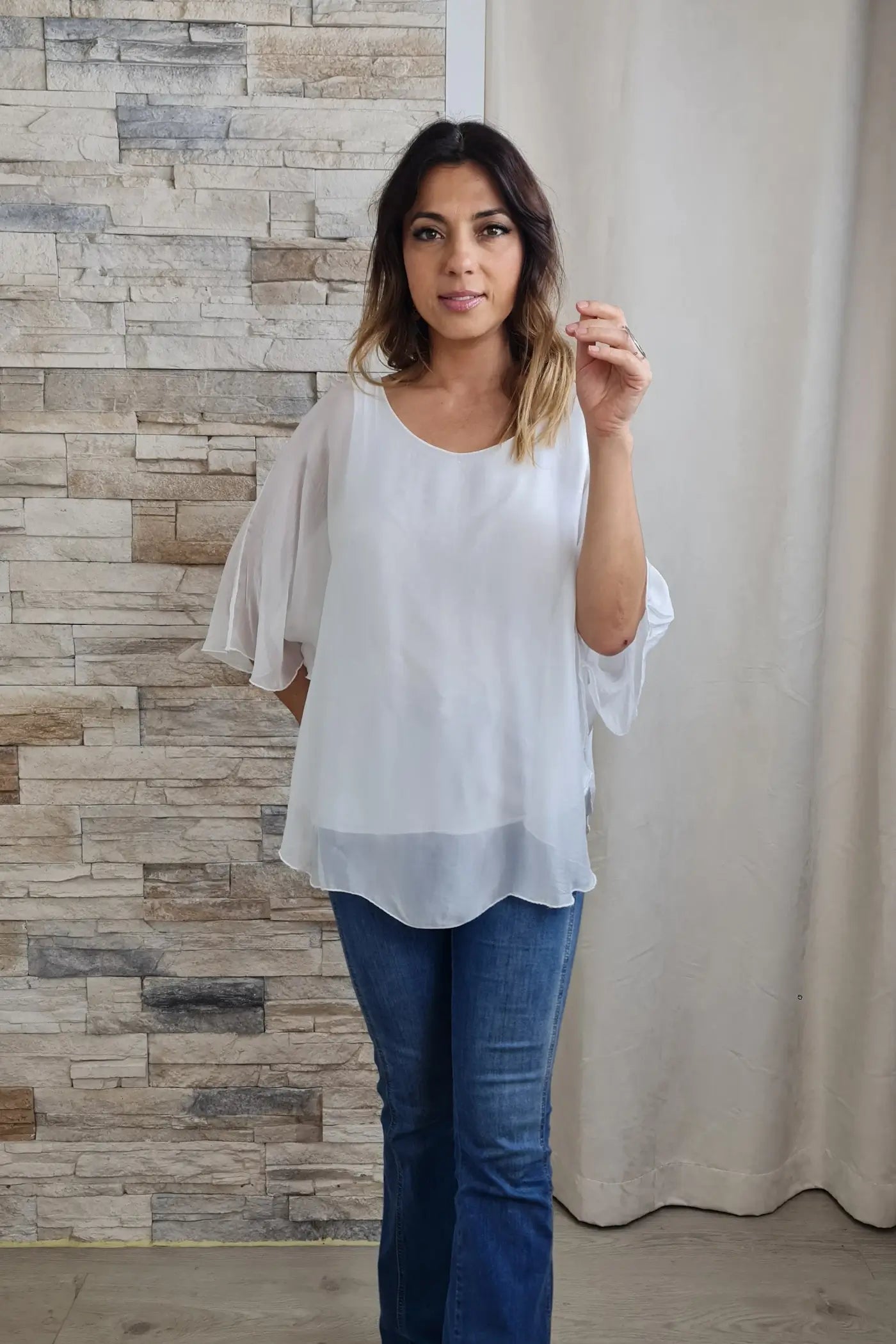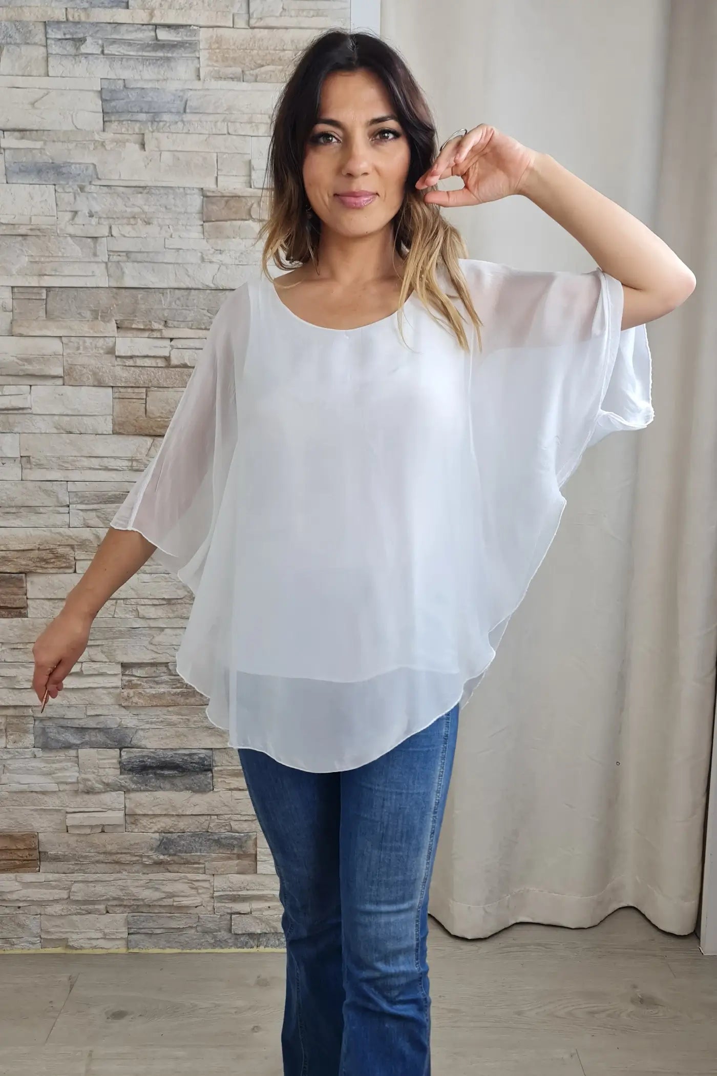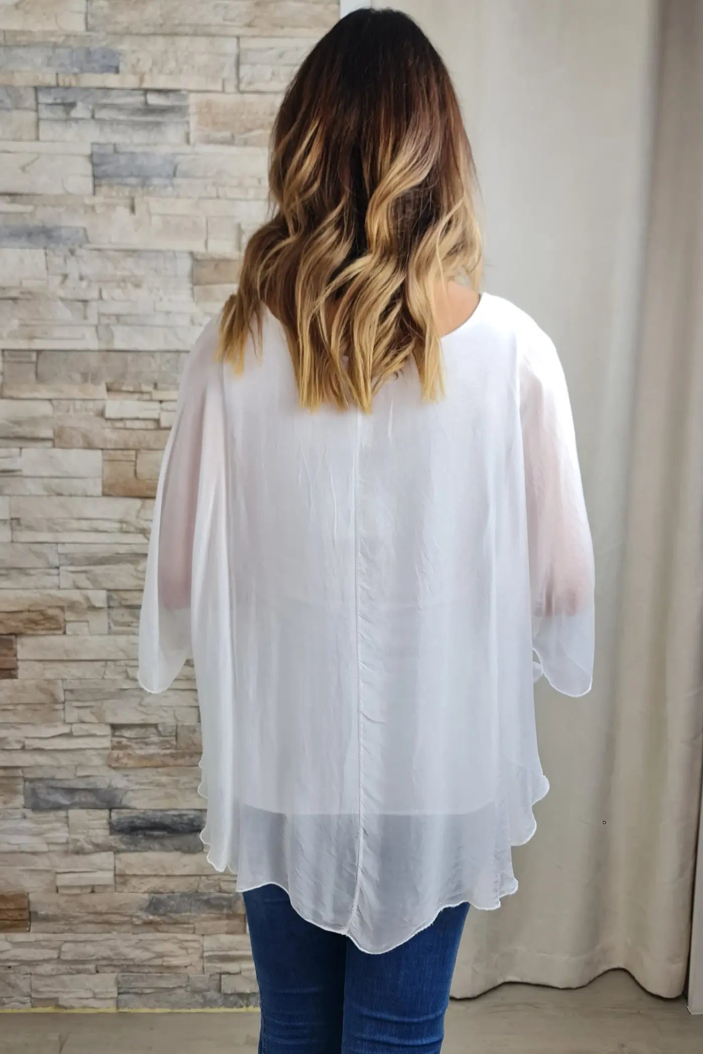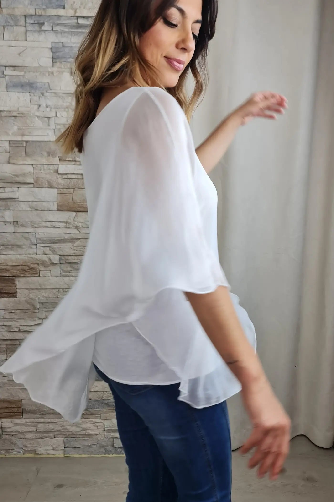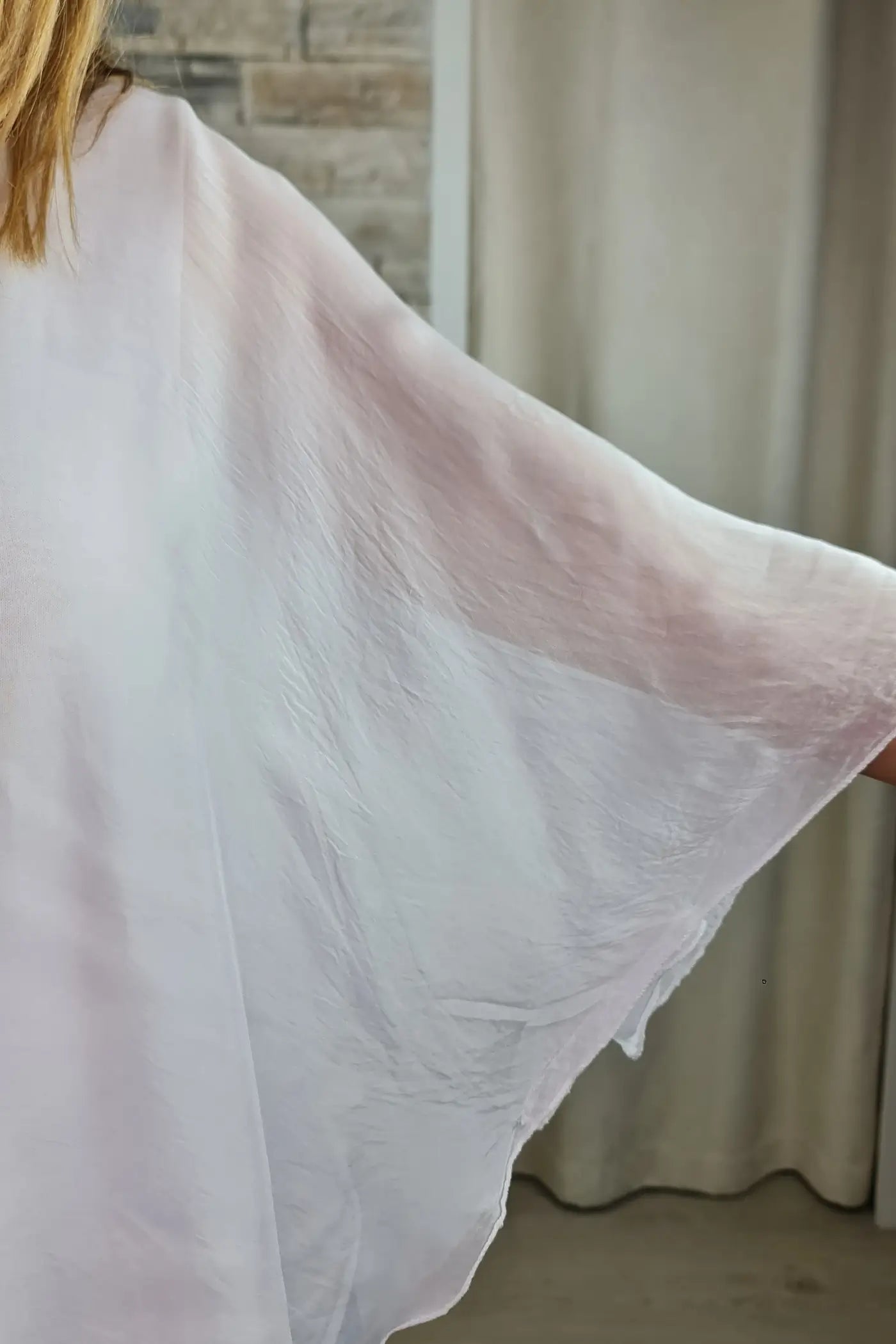 Ao vestir esta blusa, sentirá a fluidez etérea do tecido transparente, que abraça o corpo com delicadeza e permite que a sua energia brilhe sem restrições. A cor branca, que evoca a pureza e a leveza das nuvens, proporciona uma sensação imediata de clareza e paz. O corte assimétrico e as mangas amplas conferem um toque de liberdade e elegância, convidando-a a expressar a sua personalidade de forma autêntica e descomplicada.