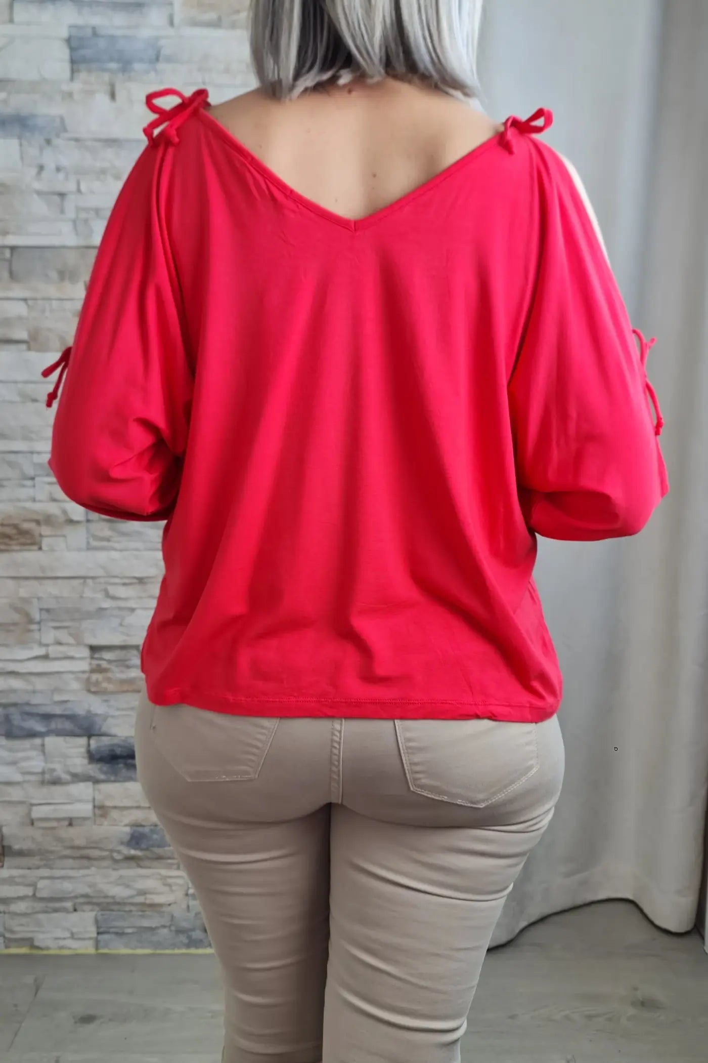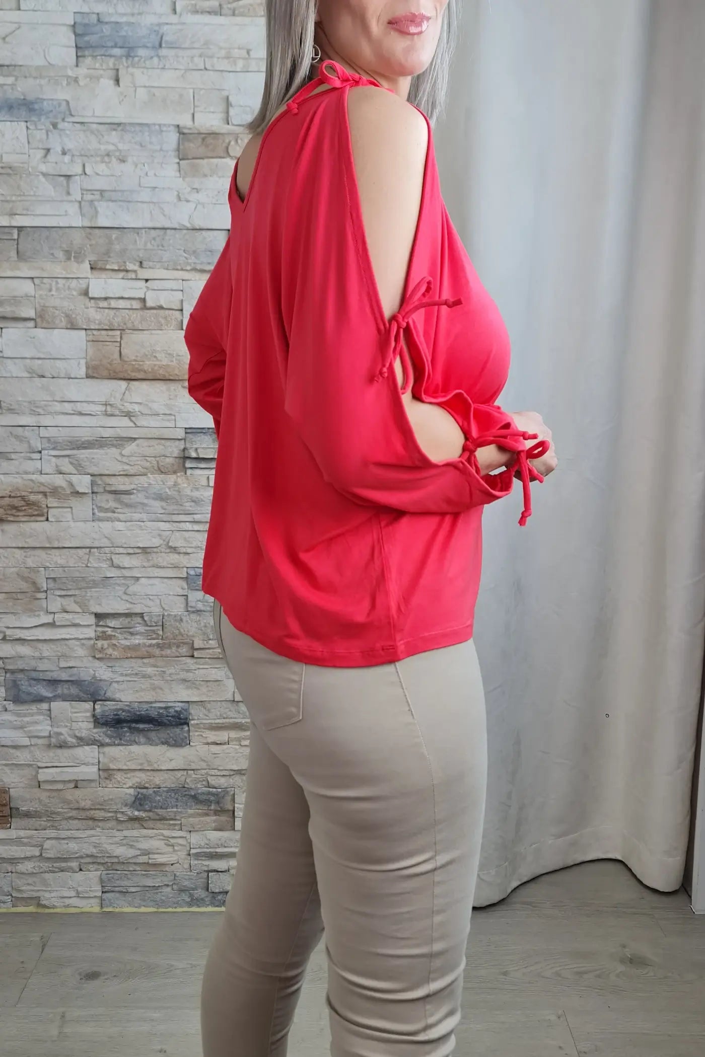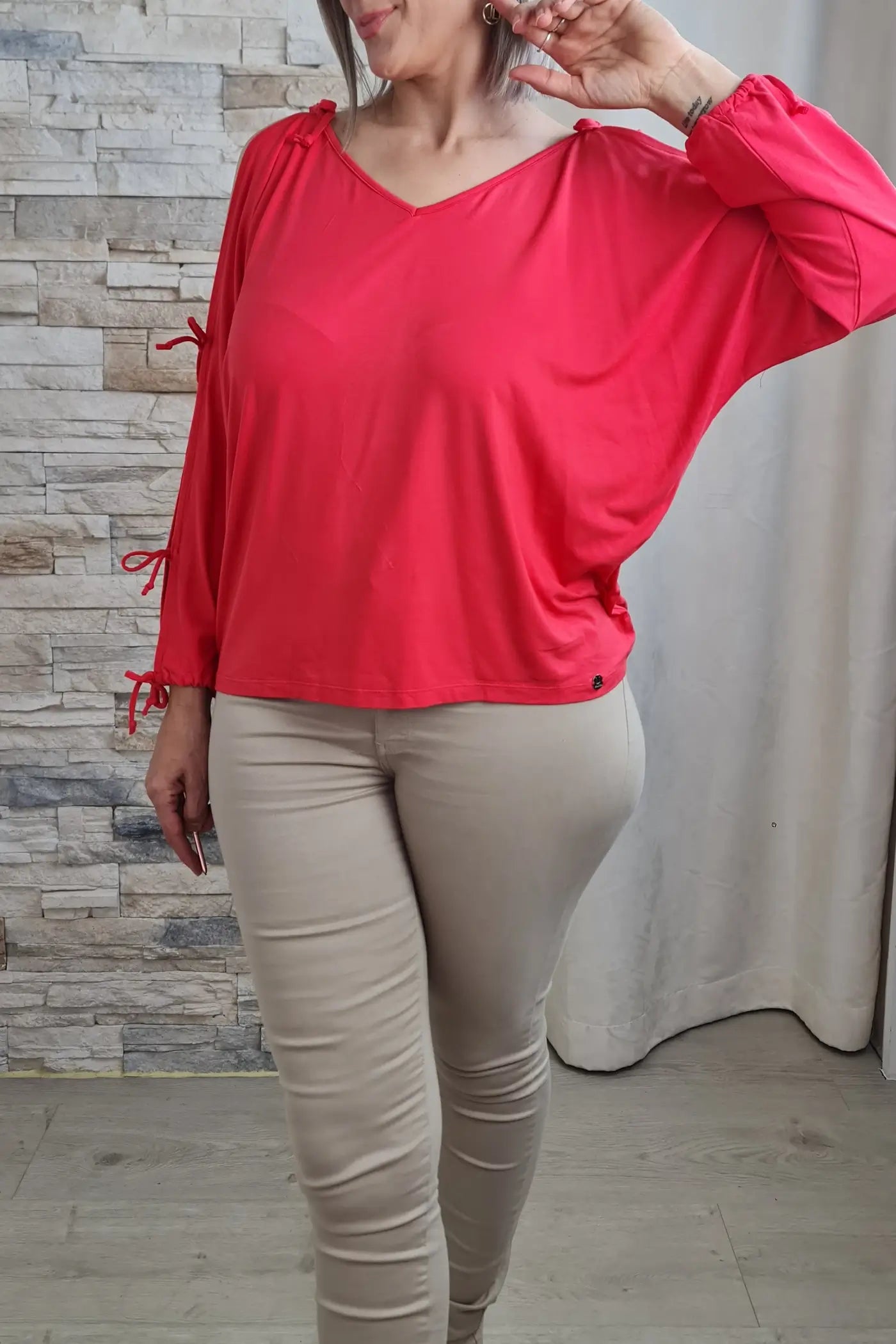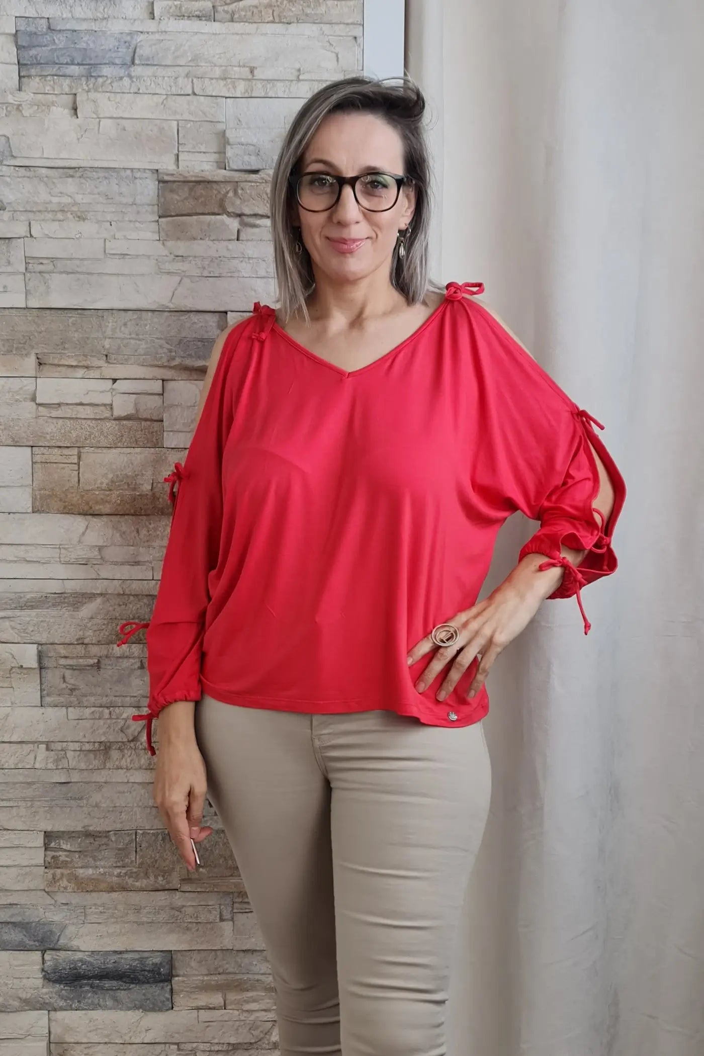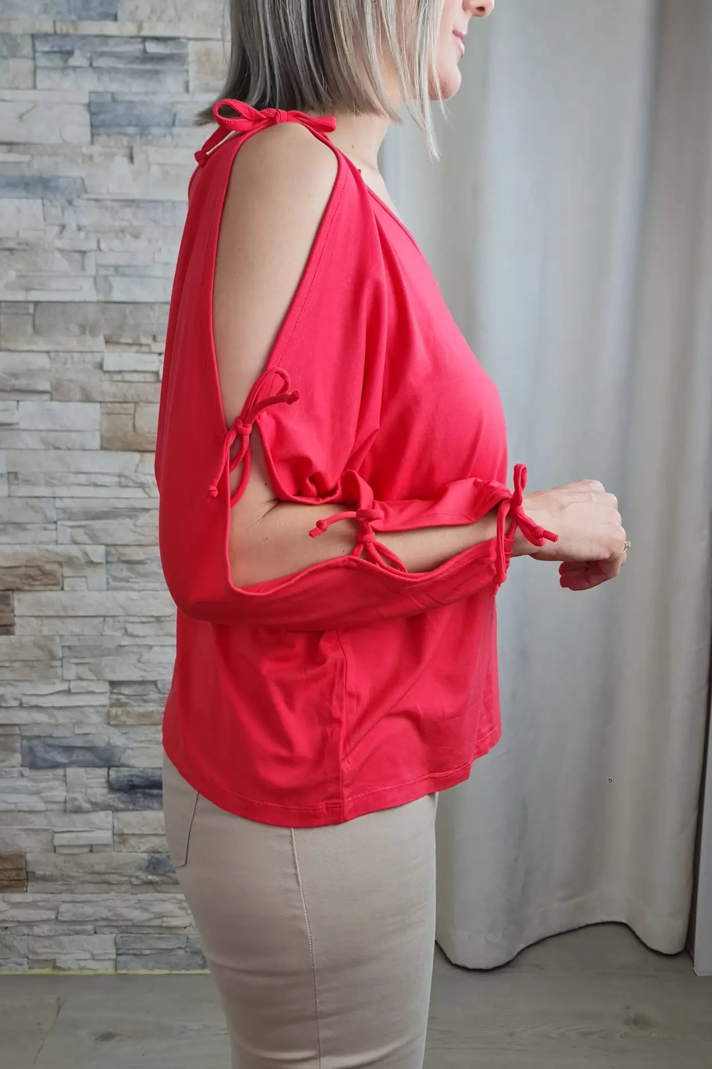 Ao vestir esta túnica, sentirá o tecido leve e fluido que abraça o corpo com suavidade. A sua cor fúchia vibrante é mais do que um tom; é uma explosão de energia e ousadia, um convite para celebrar a sua vivacidade e paixão. O design com ombros à mostra e os laços nas mangas não são apenas detalhes charmosos; são uma afirmação da sua coragem para se mostrar, quebrar as regras e expressar a sua individualidade de forma alegre e confiante.
