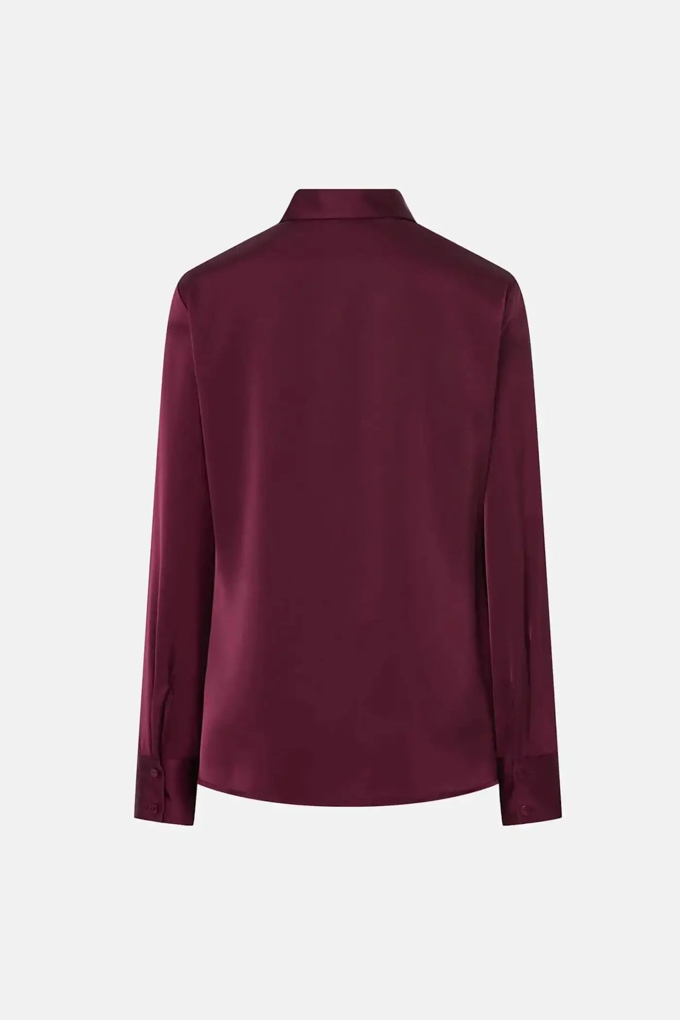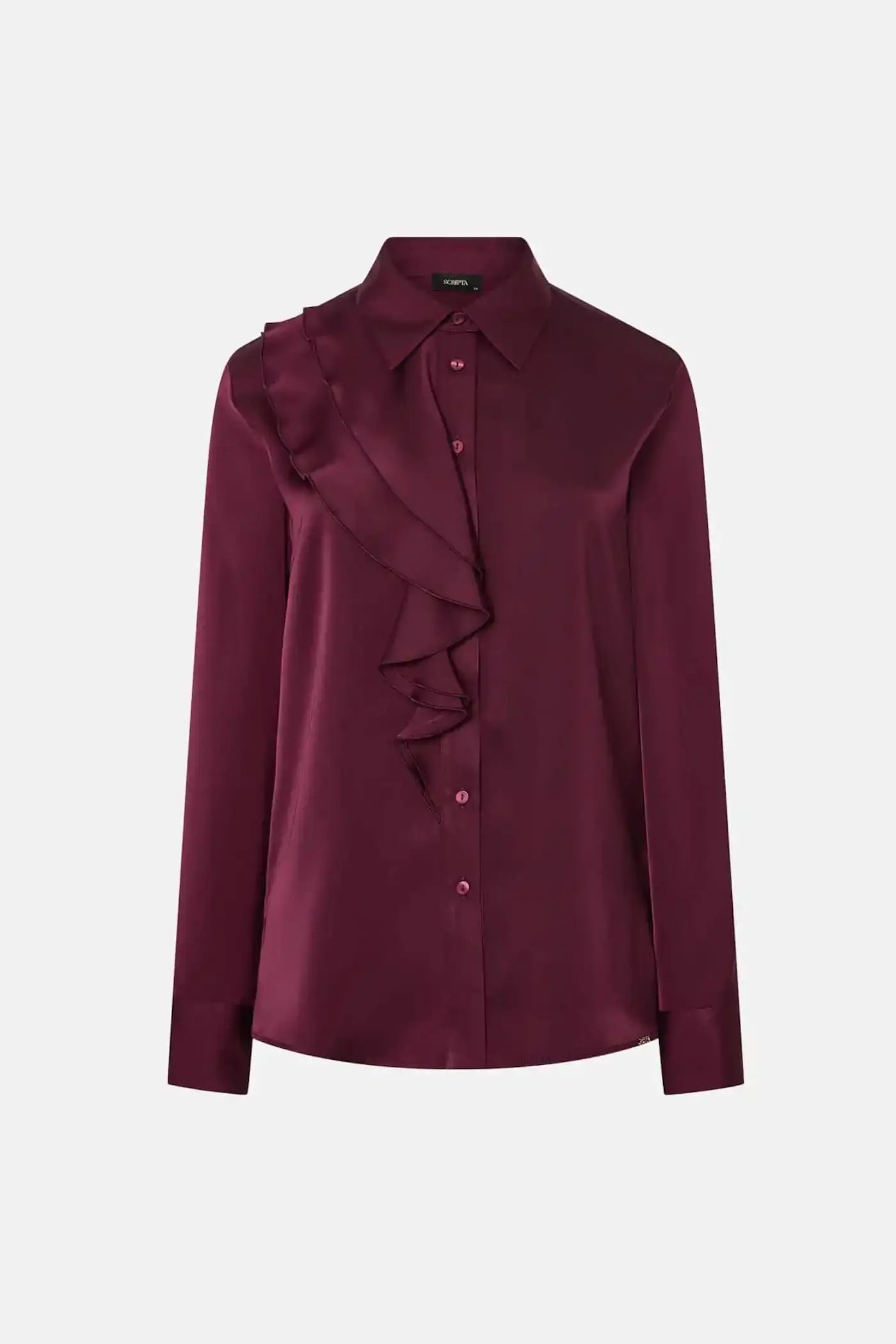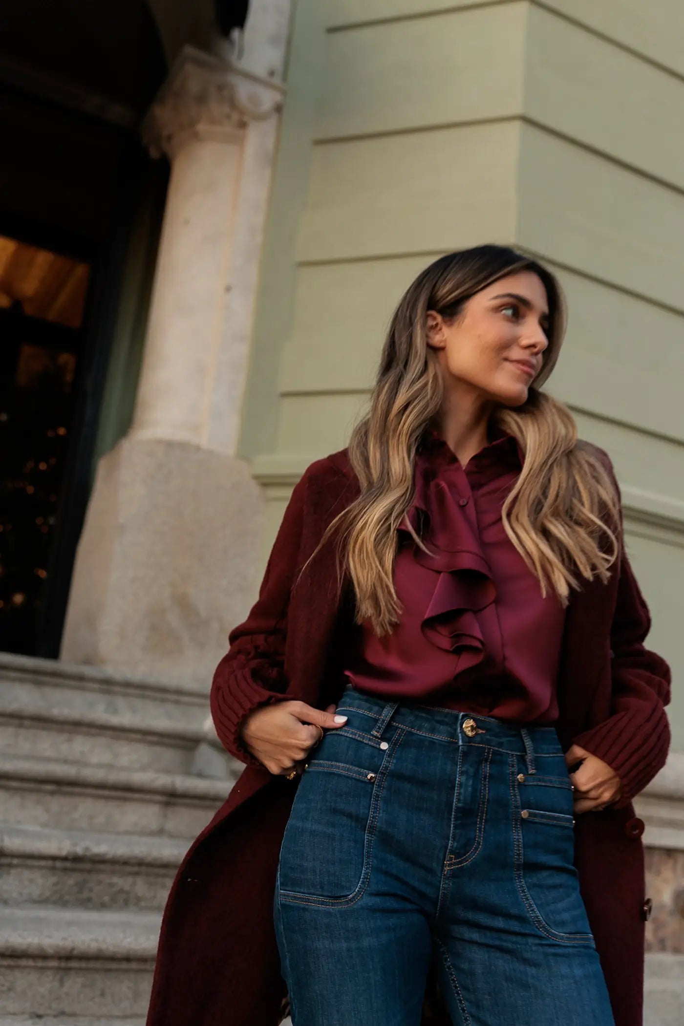 O design é clássico com um toque moderno. Em tom bordeaux, destaca-se pela gola clássica e pelos folhos que descem do ombro, criando um drapeado elegante na frente, adicionando um detalhe refinado e único. Os botões no mesmo tom da blusa completam o visual harmonioso.