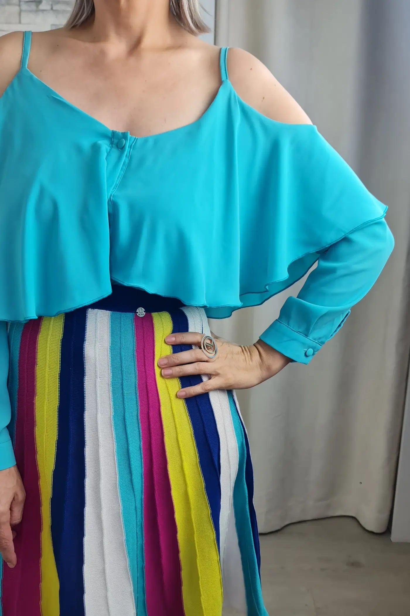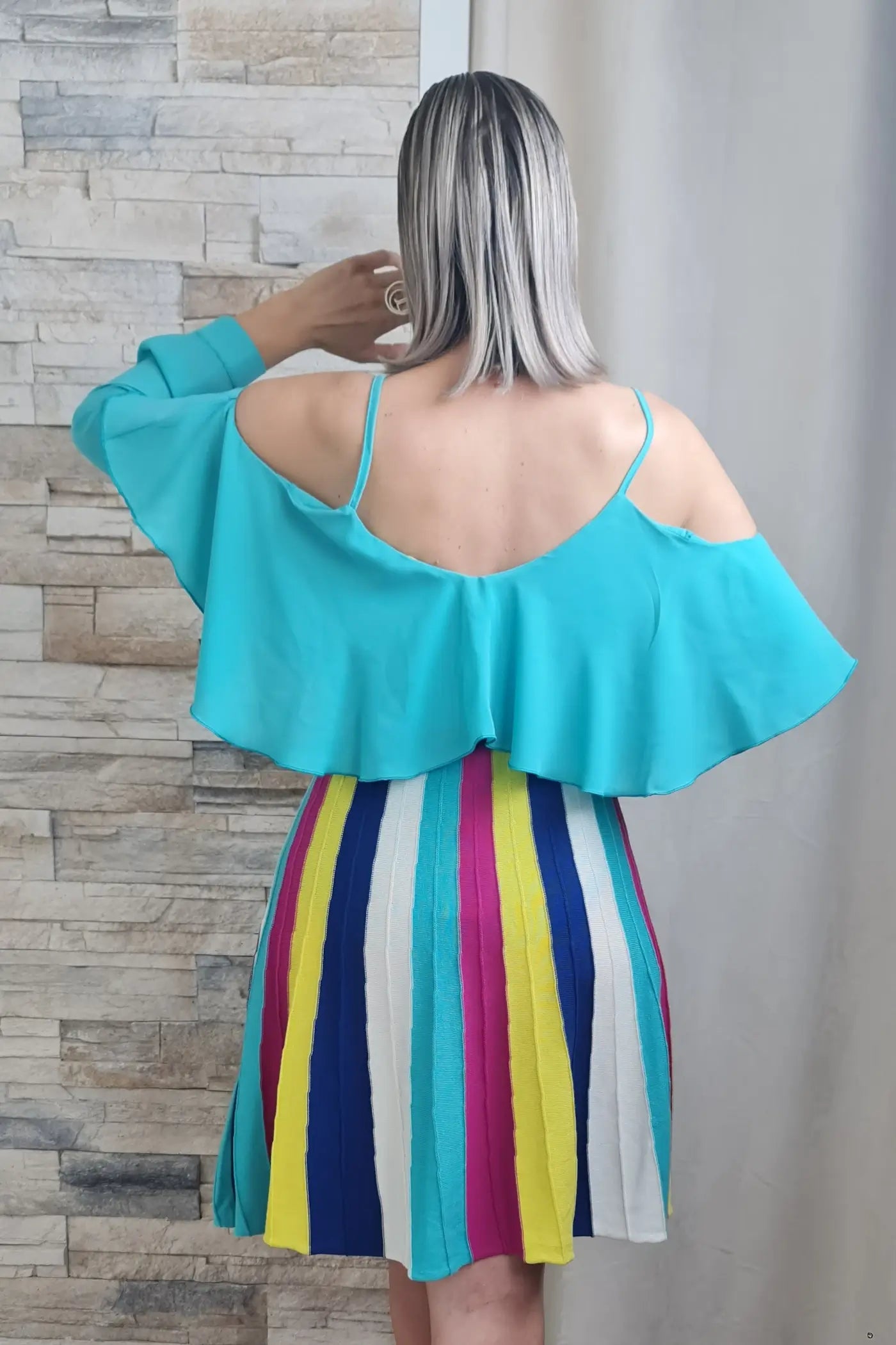 Ao vestir esta blusa, a cor azul turquesa, que evoca a serenidade do oceano e a leveza do céu, proporciona uma sensação de calma e otimismo. O design com ombros à mostra e o tecido leve e fluido conferem um toque de liberdade e sensualidade, convidando-a a expressar a sua personalidade de forma leve e descomplicada. As mangas compridas com punho adicionam um toque de elegância, tornando esta peça perfeita para diversas ocasiões.