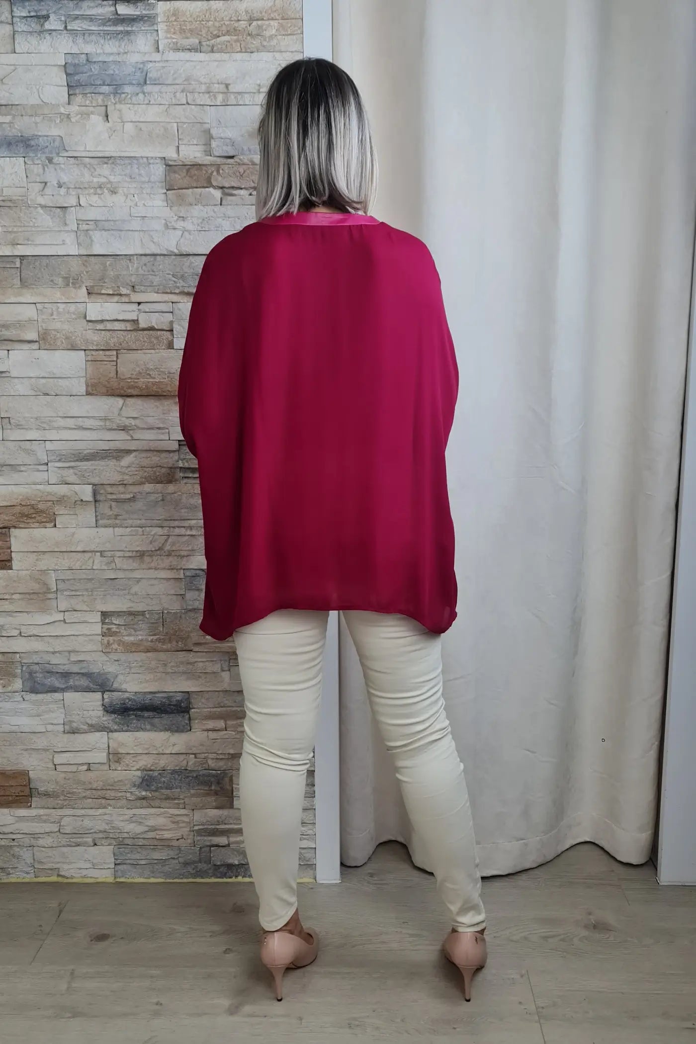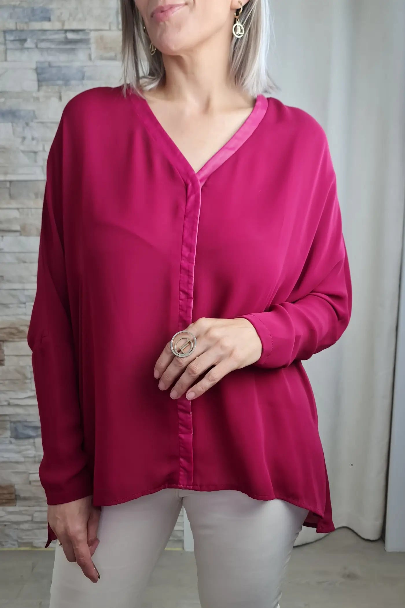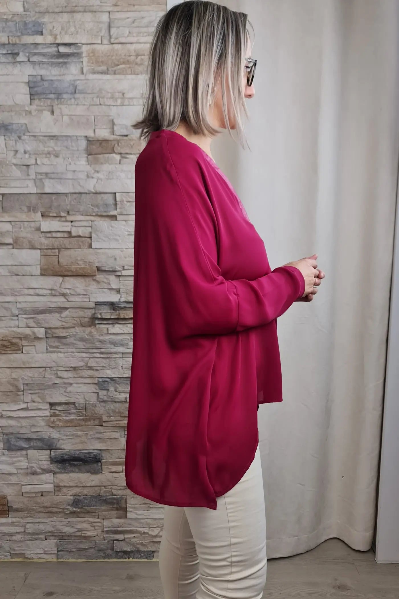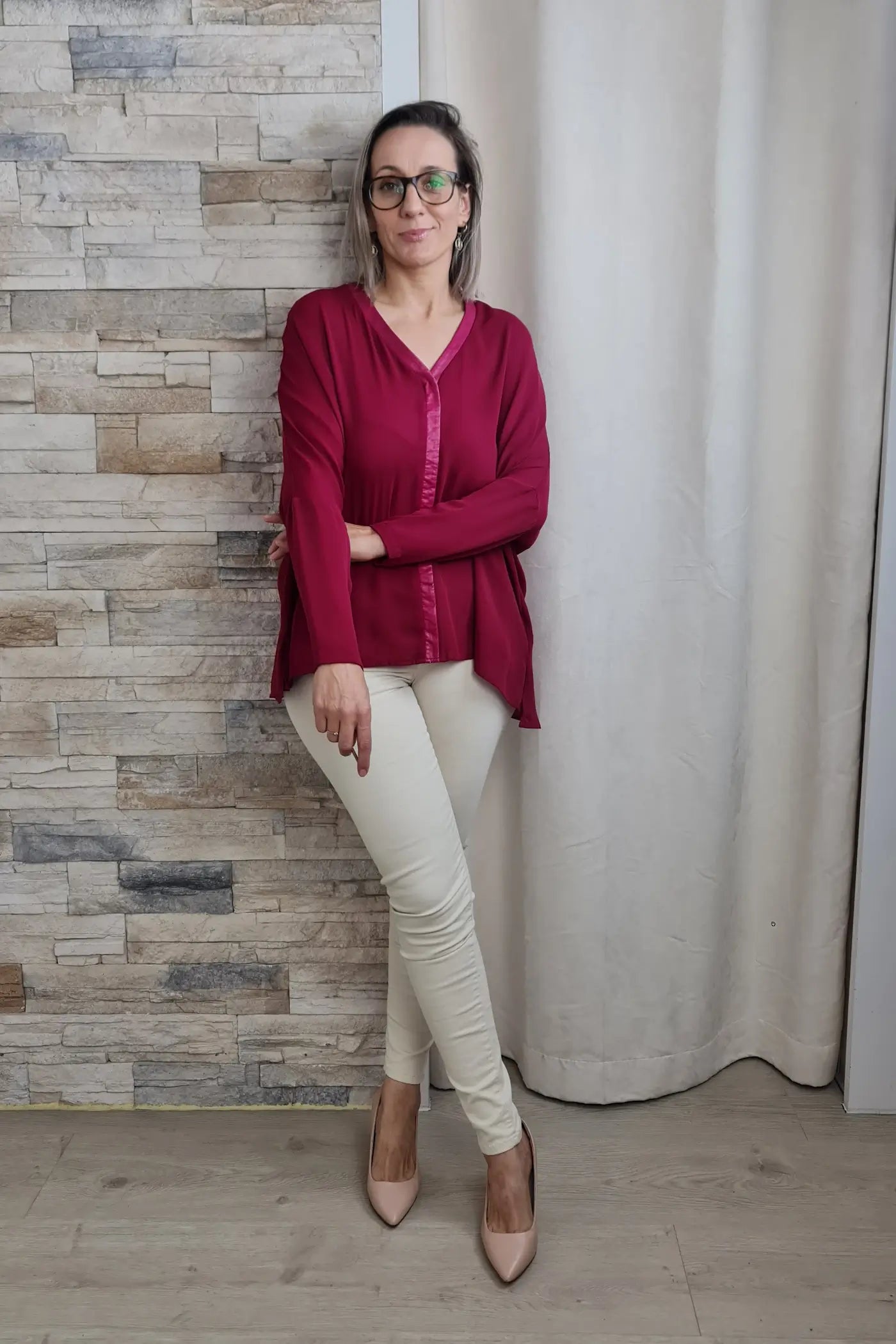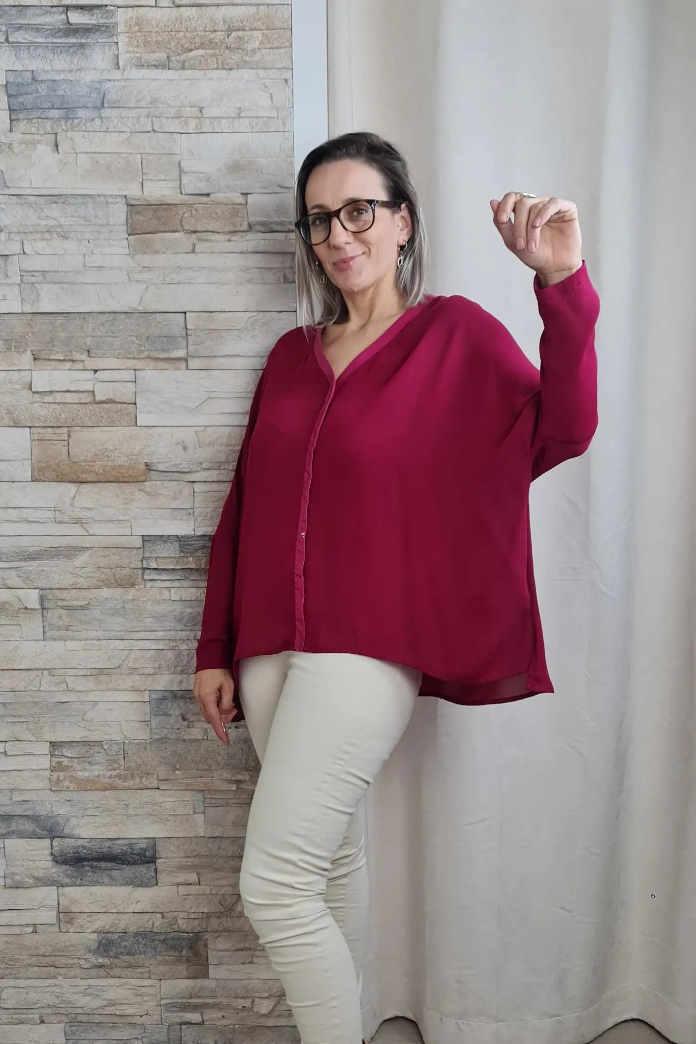 Ao vestir esta blusa, a sua cor cereja vibrante transmite uma sensação imediata de energia e otimismo. O seu corte ajustado, com a gola clássica e os folhos a percorrer o peito, confere-lhe um visual feminino e confiante, sem comprometer o conforto.