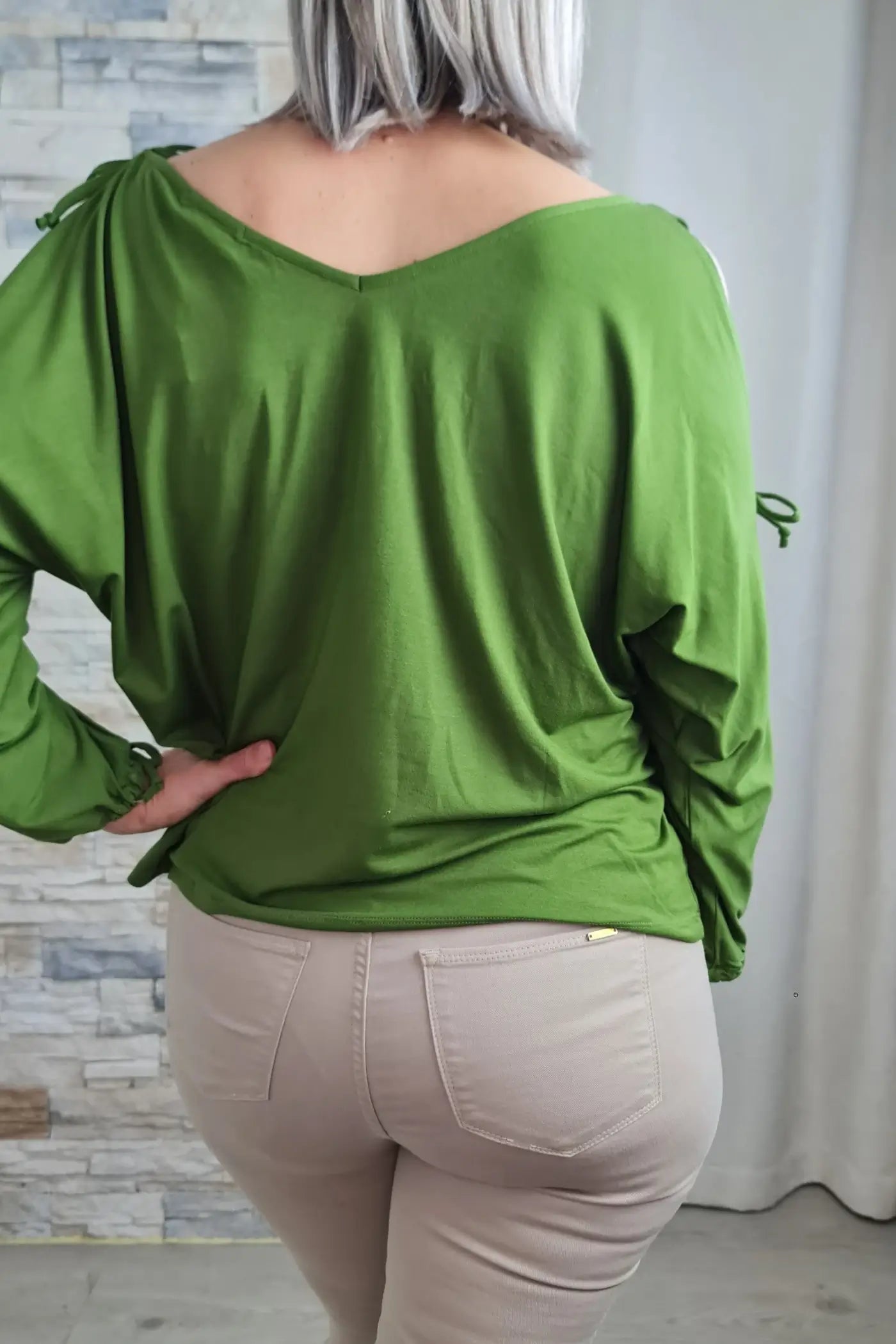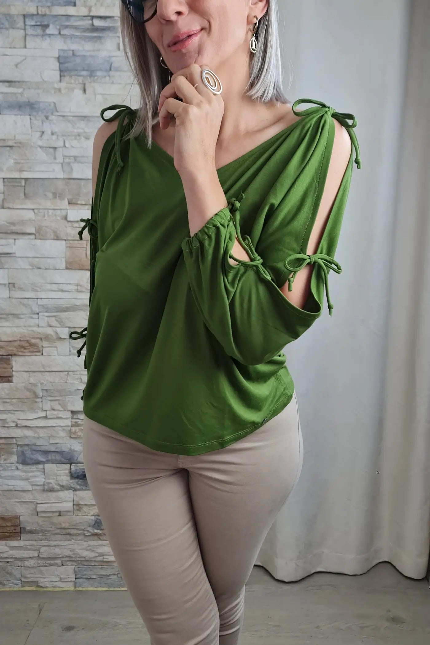 Ao vestir esta blusa, sentirá o tecido leve e fluido, que se adapta ao seu corpo com uma suavidade natural. A sua cor verde, que evoca a força da natureza e a serenidade, transmite uma sensação de calma e confiança. O seu design com ombros à mostra e os laços nas mangas não são apenas um detalhe, são uma afirmação da sua ousadia e coragem de ser quem realmente é.