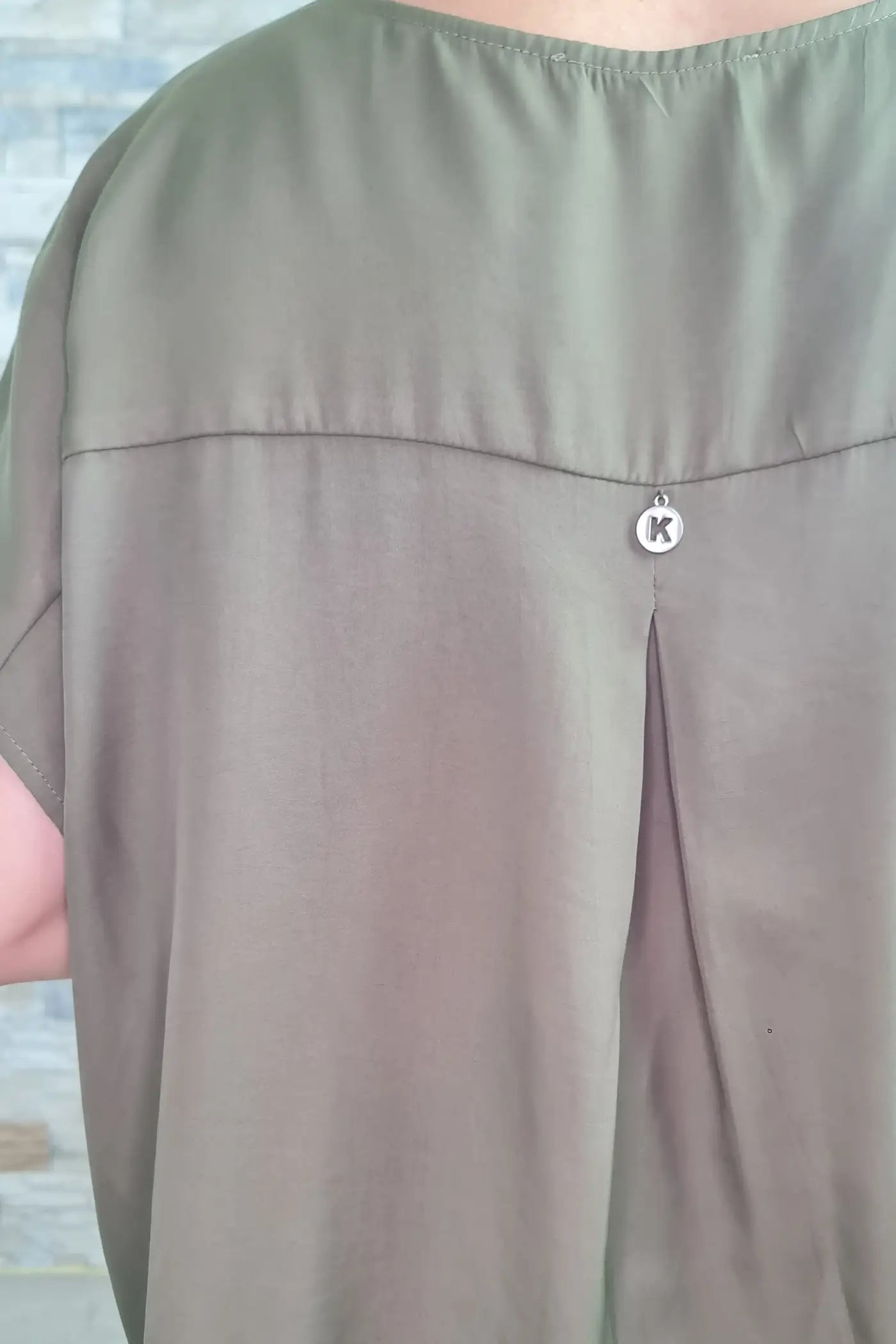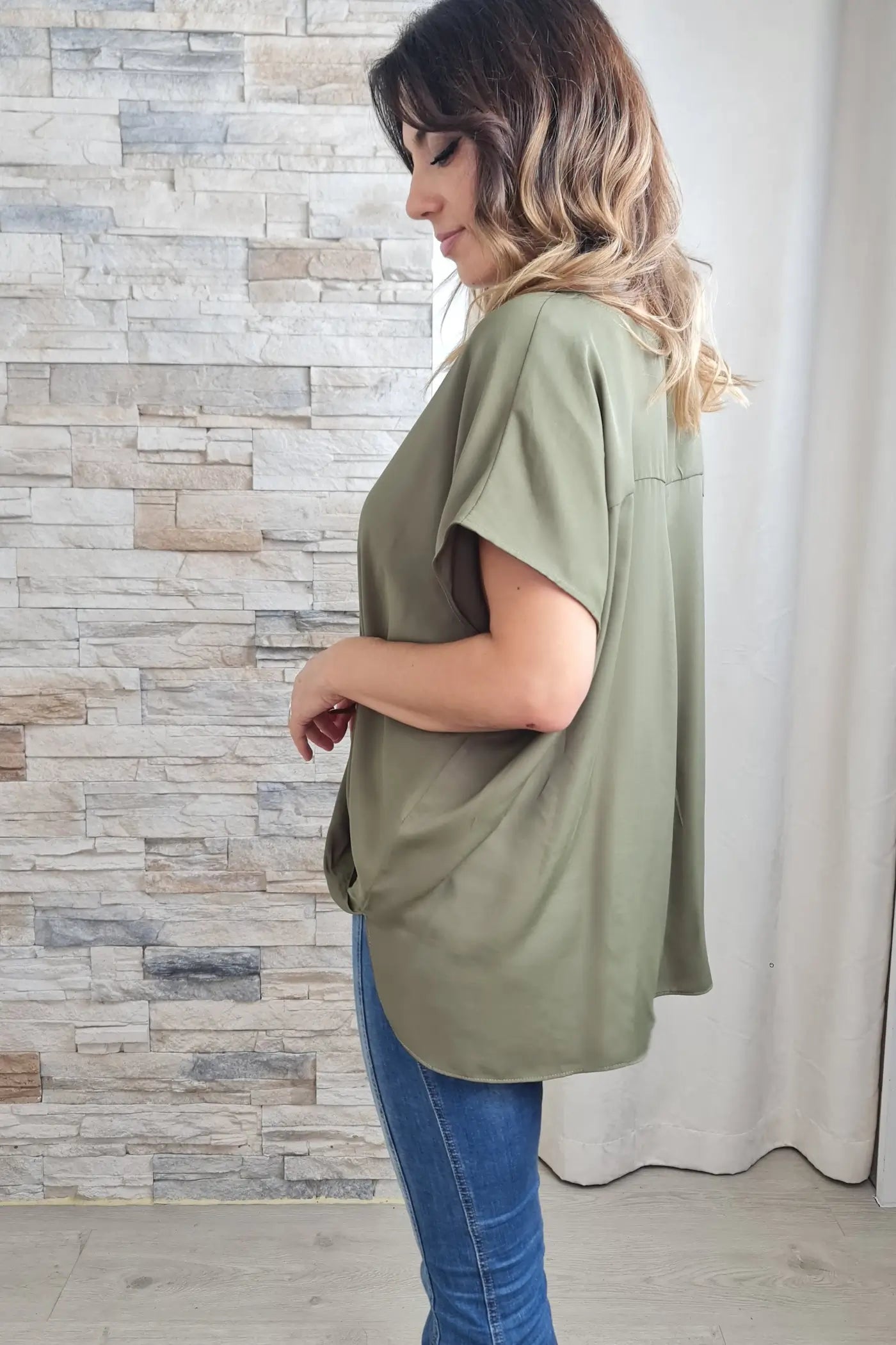 Ao vestir esta blusa, o tecido acetinado, leve e fluido, proporciona uma sensação imediata de conforto e elegância. A cor verde-oliva, que evoca a força da natureza e a serenidade, transmite uma sensação de calma e confiança. O seu corte com efeito de trespasse na frente é mais do que um detalhe de design; é um convite para abraçar a sua singularidade, lembrando-a de que a sua elegância não precisa de seguir regras.