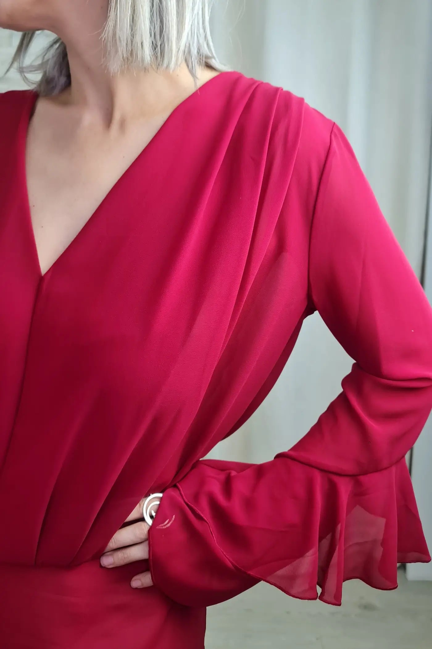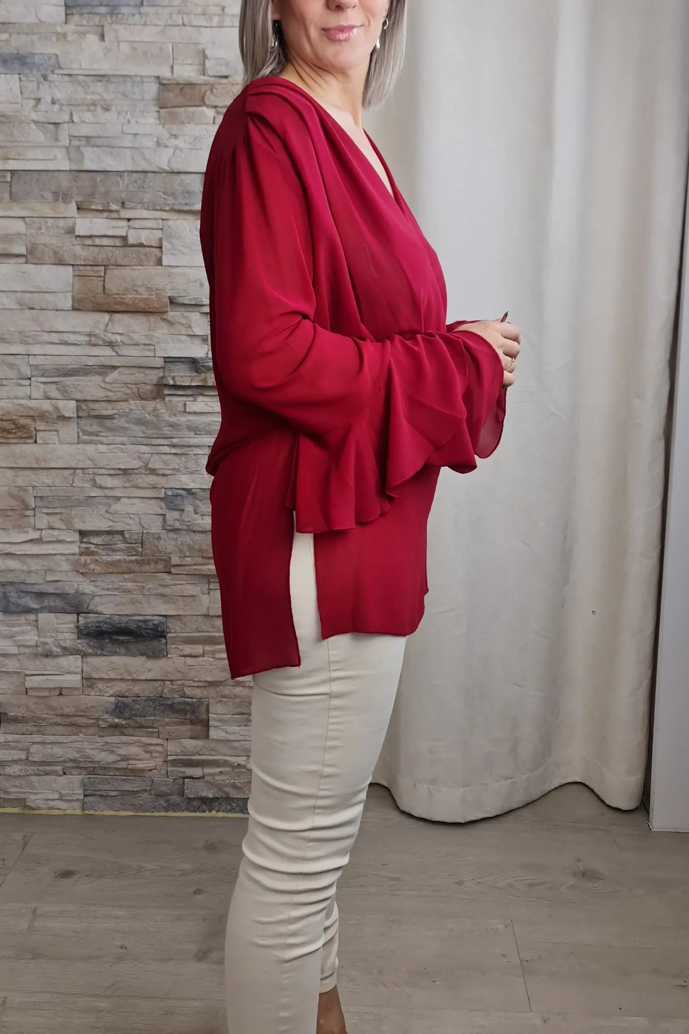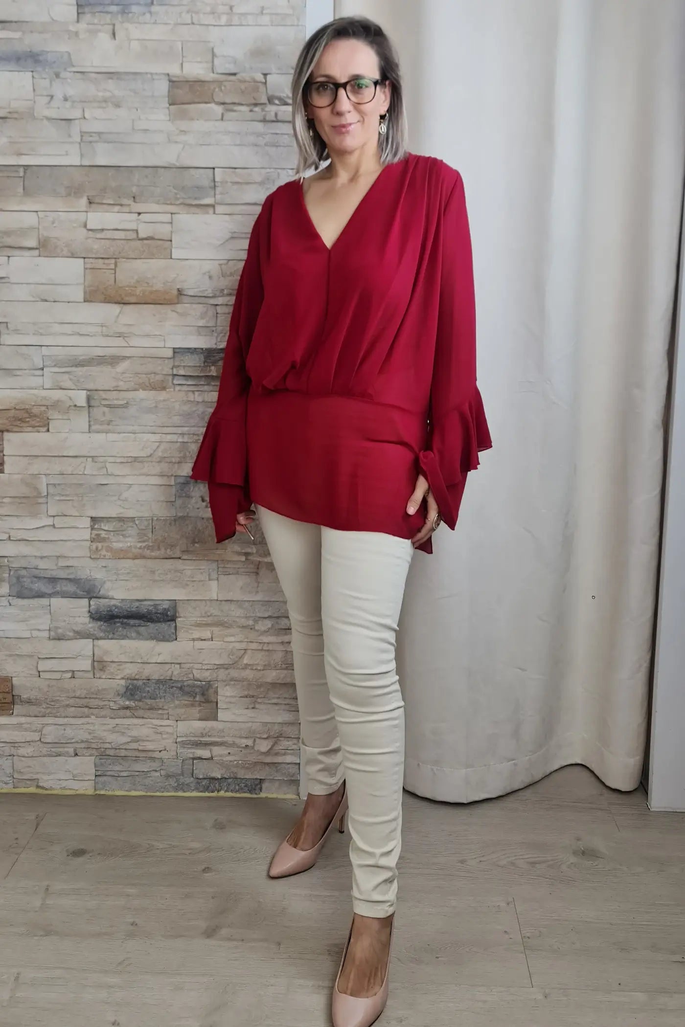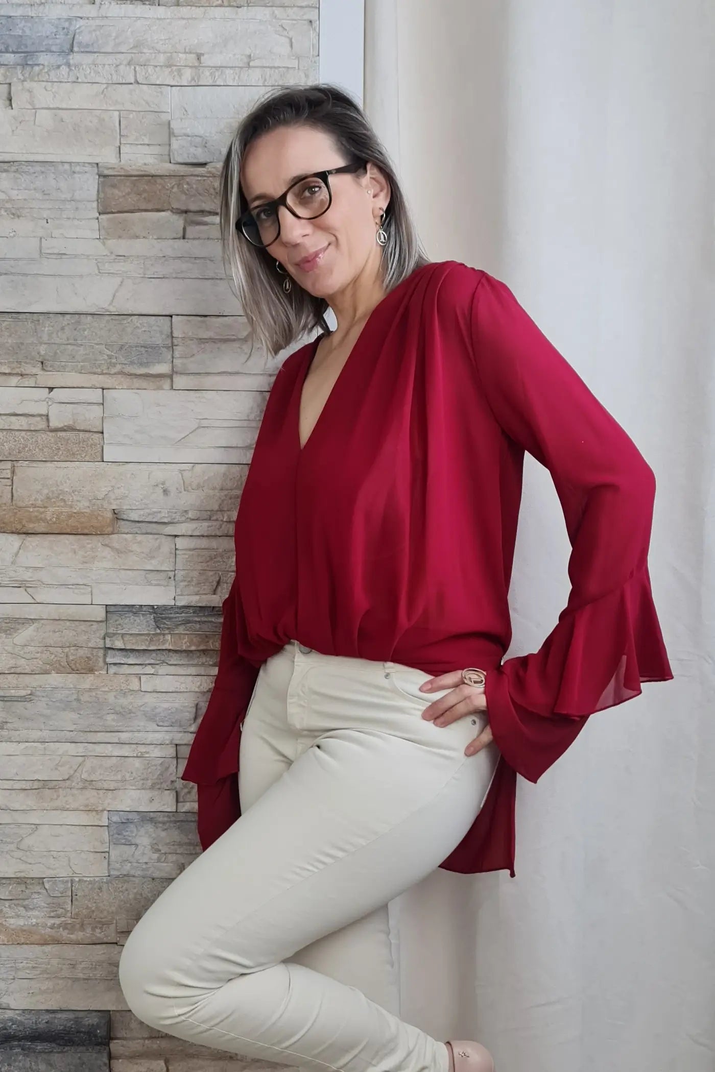 Ao vestir esta blusa, sentirá o tecido leve e fluído que abraça o corpo com suavidade. A sua cor vermelha intensa é mais do que um tom; é uma explosão de energia e paixão, um convite para celebrar a sua vivacidade e alegria. O decote em V e os folhos nas mangas não são apenas detalhes charmosos; são uma afirmação da sua coragem para se mostrar, quebrar as regras e expressar a sua individualidade de forma alegre e confiante.