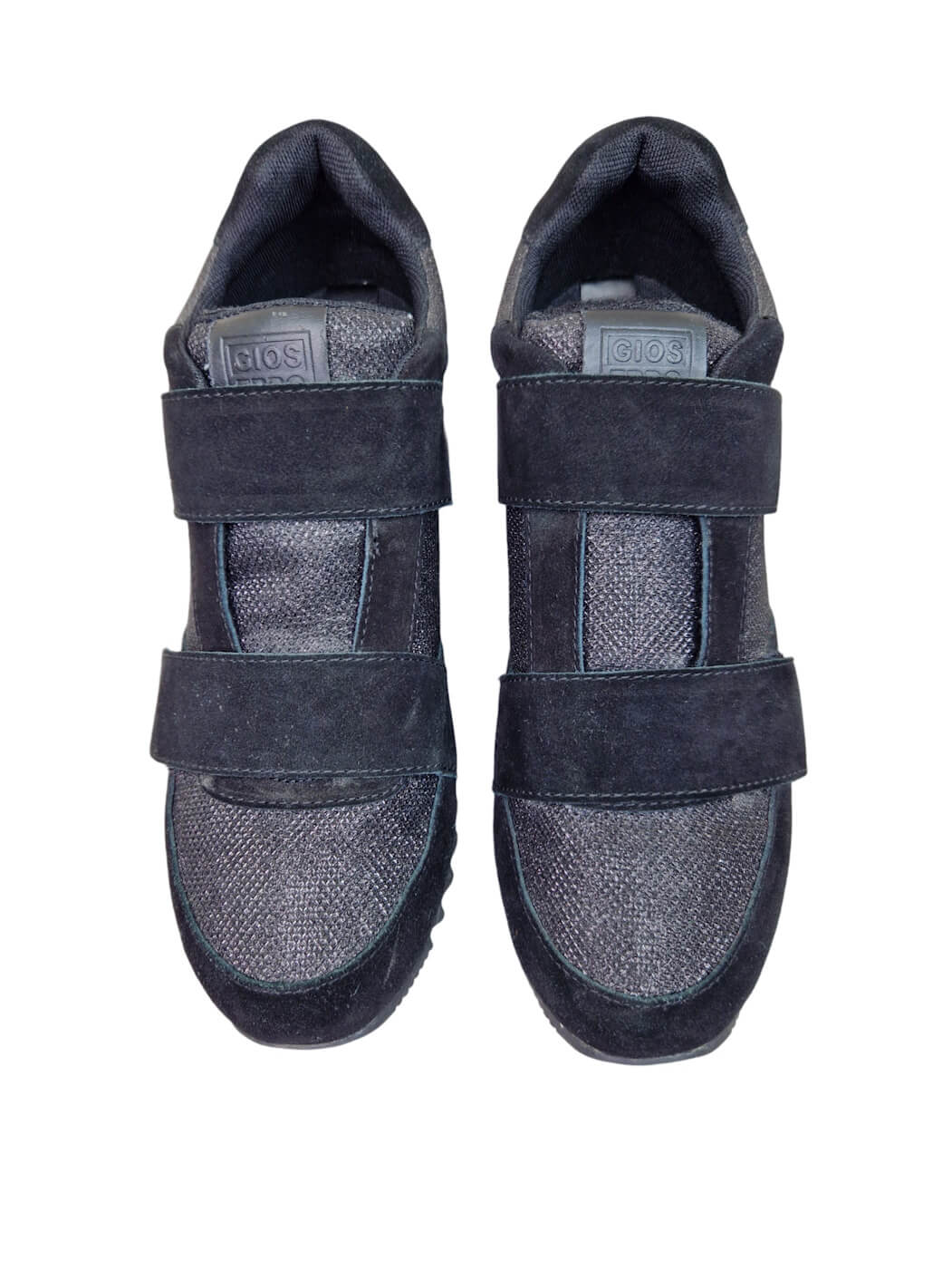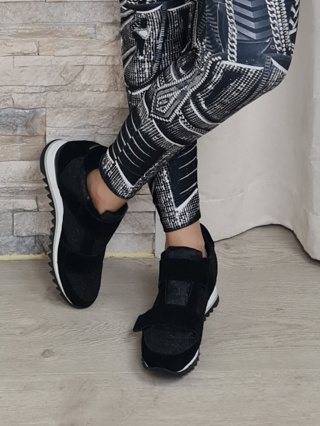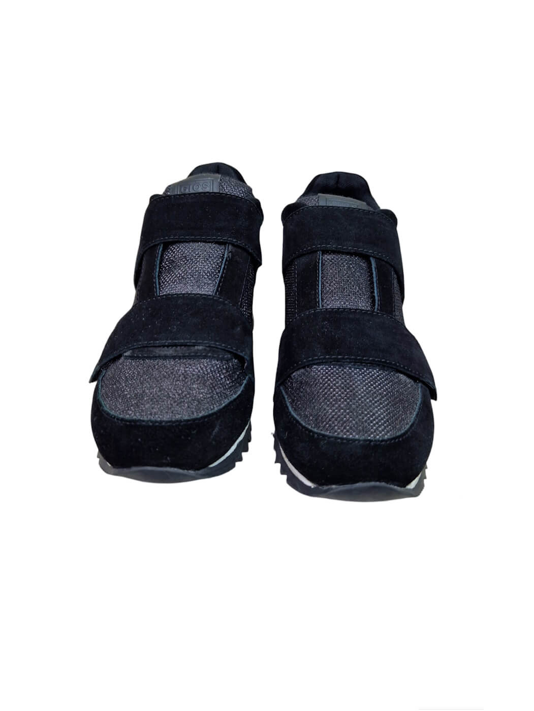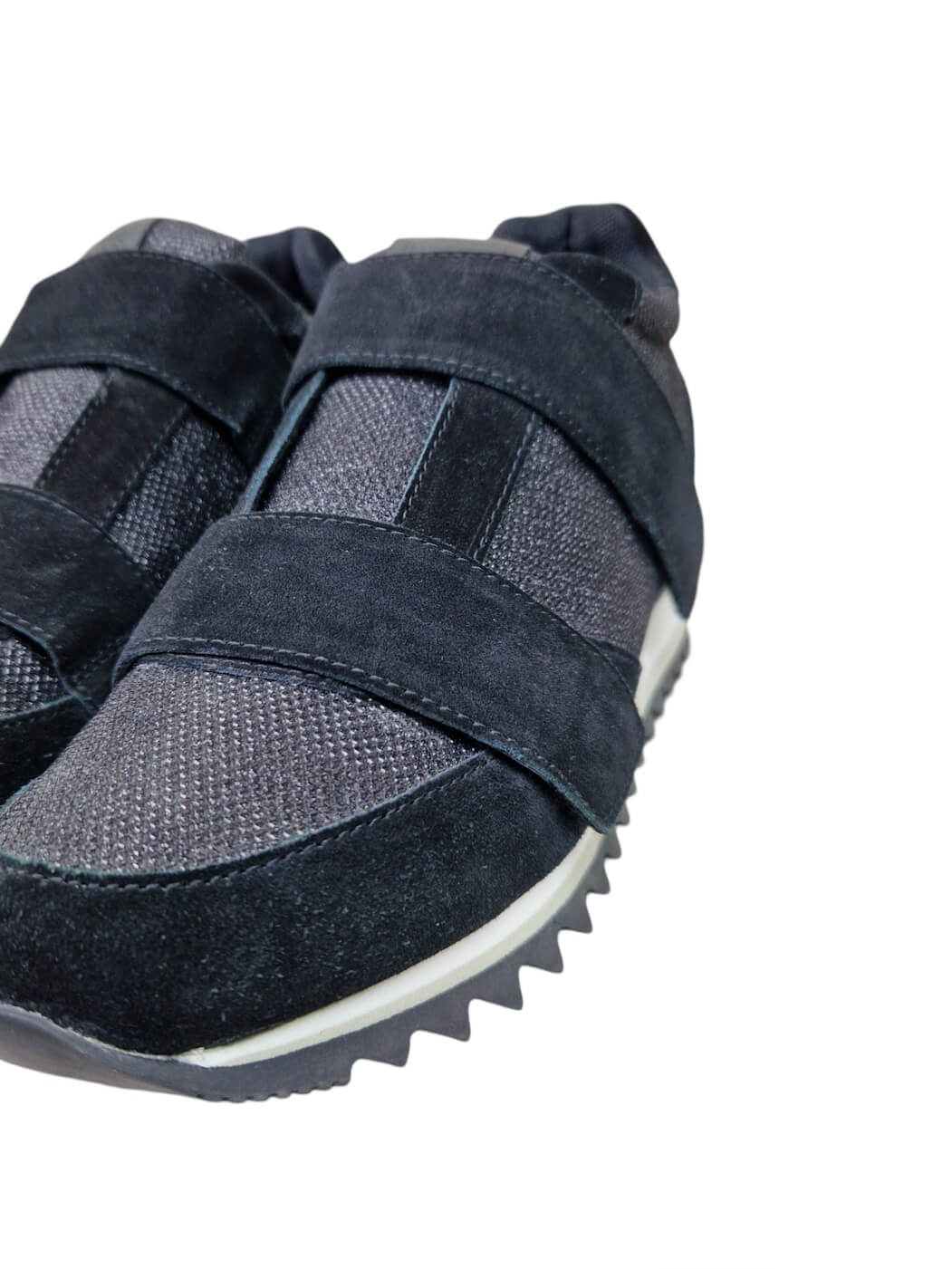 As sapatilhas exibidas na imagem apresentam um design moderno e desportivo, com uma combinação de materiais e texturas que conferem um visual dinâmico. A parte frontal é composta por uma malha respirável em tons de cinza, com sobreposições em camurça preta e detalhes em tecido texturizado, criando um contraste visual interessante e uma sensação de profundidade. As tiras elásticas largas em preto cruzam o peito do pé, adicionando um toque urbano e descontraído ao calçado.