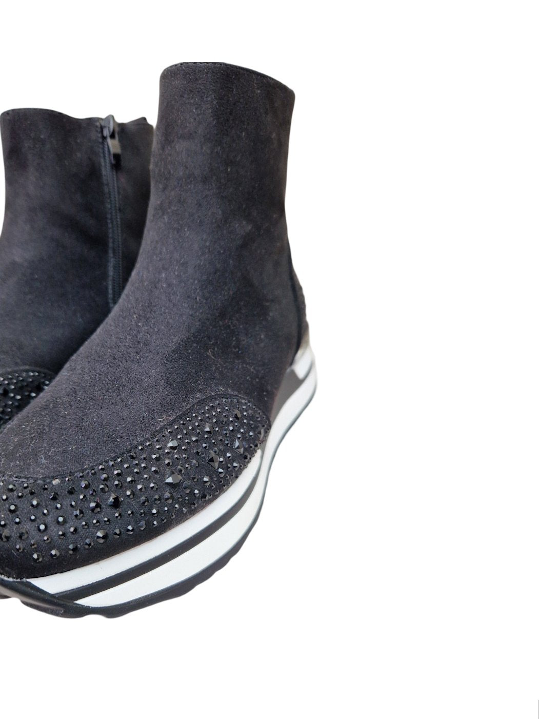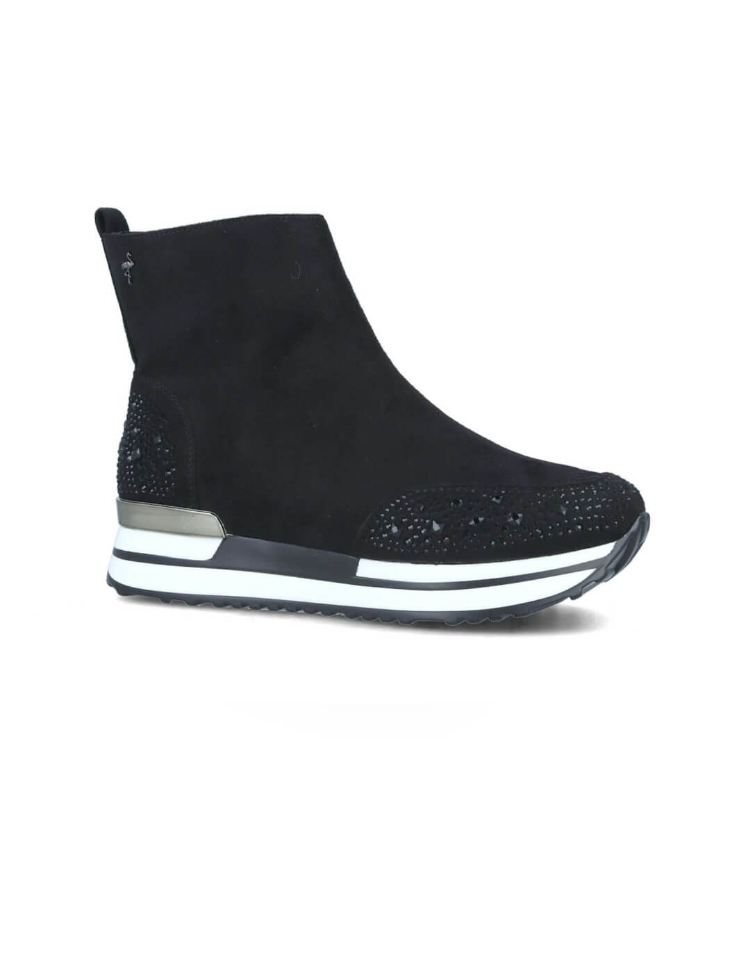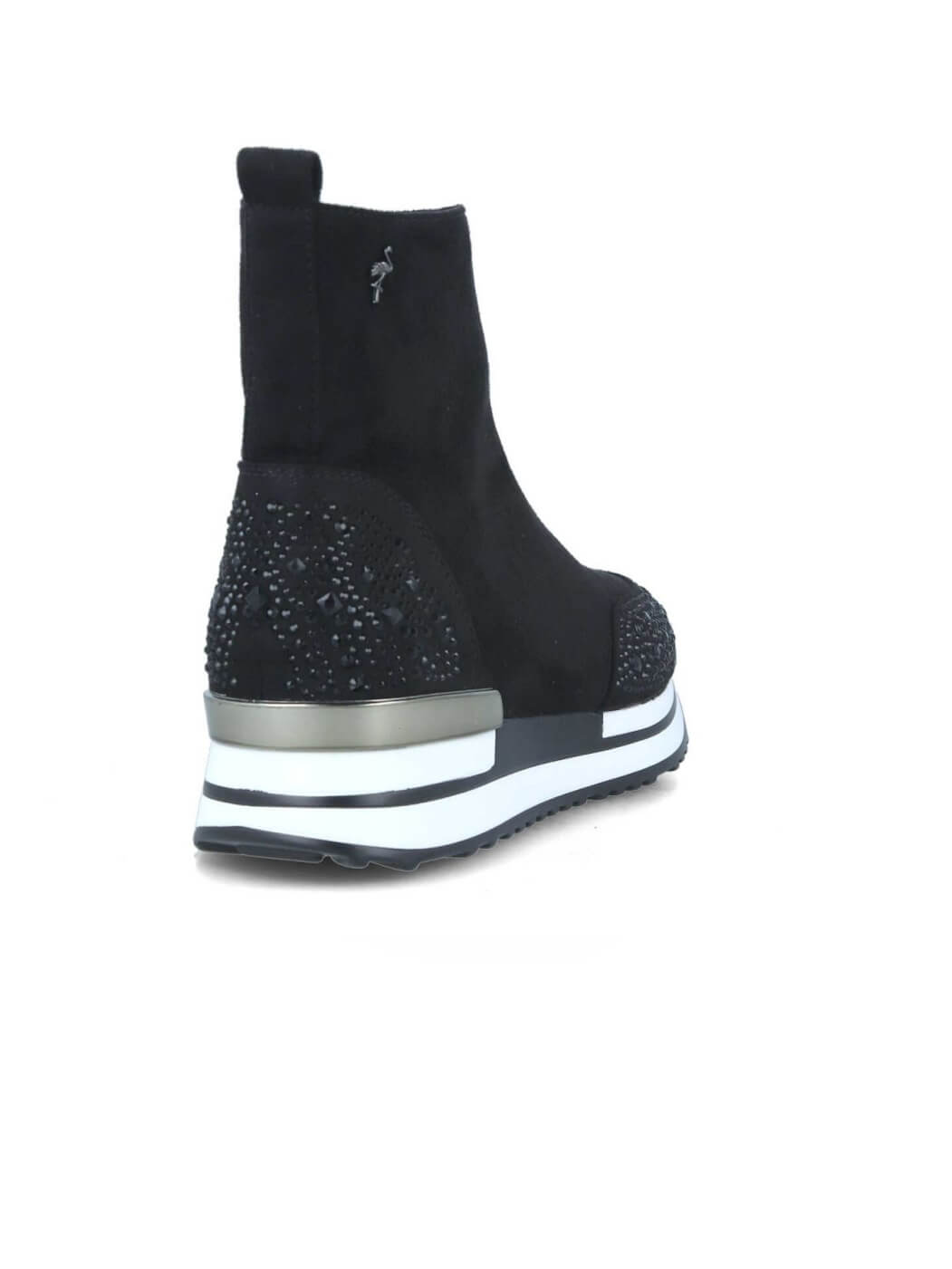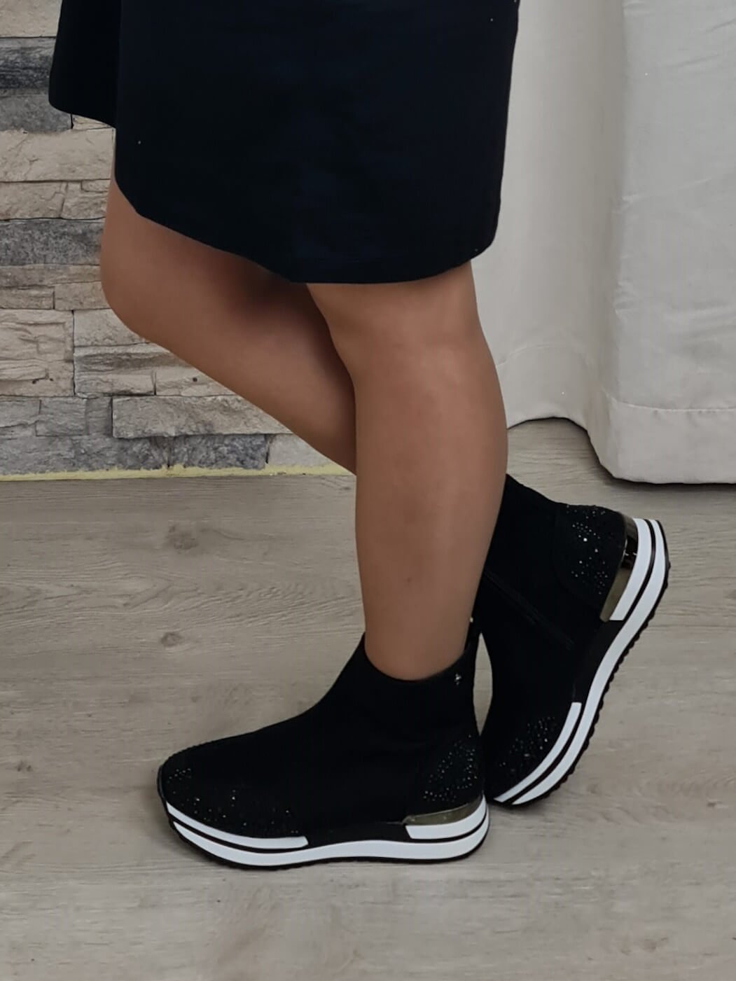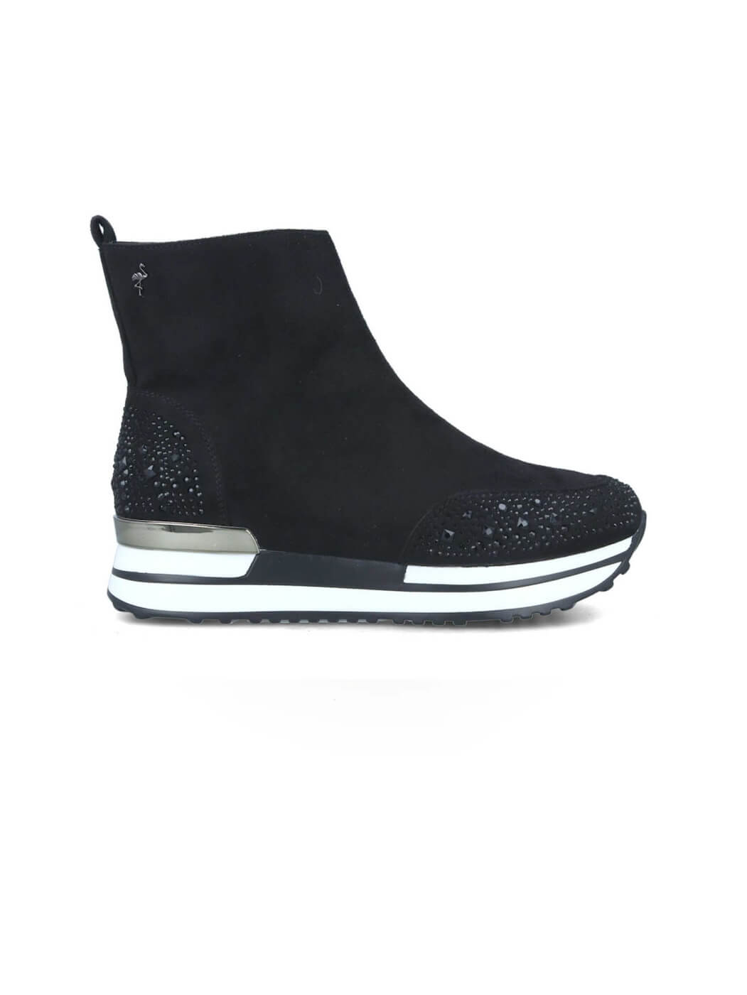 Os ténis exibidos são botins de cano curto, na cor preta. O material principal parece ser camurça ou um tecido similar com toque aveludado. Apresentam detalhes brilhantes na parte frontal e no calcanhar.