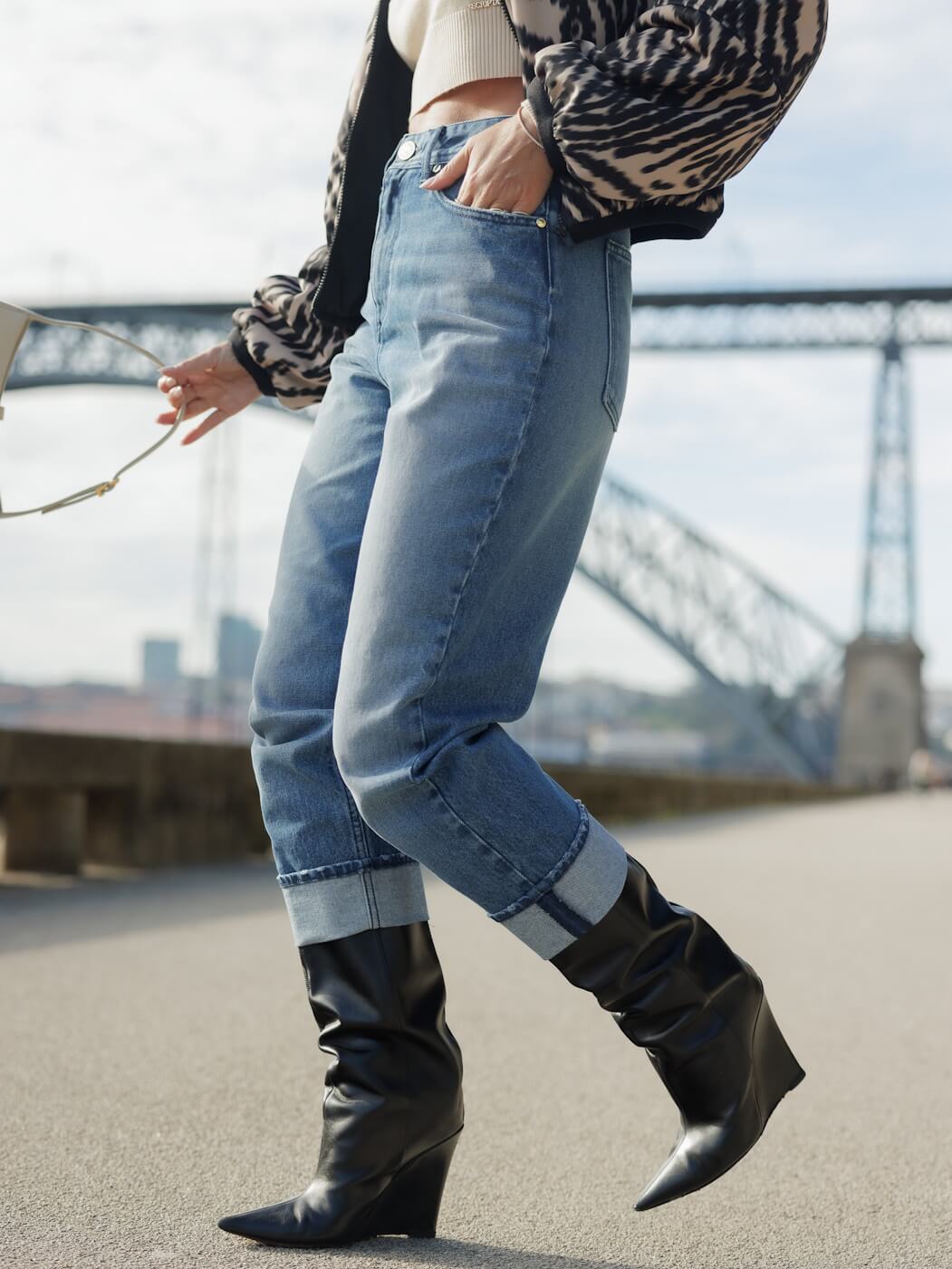 Ao vestir as "Casual Chic", sentirá uma sensação de liberdade e um toque de originalidade. O tecido de ganga resistente e o corte que se ajusta ao corpo proporcionam bem-estar e a convidam a expressar a sua personalidade autêntica.