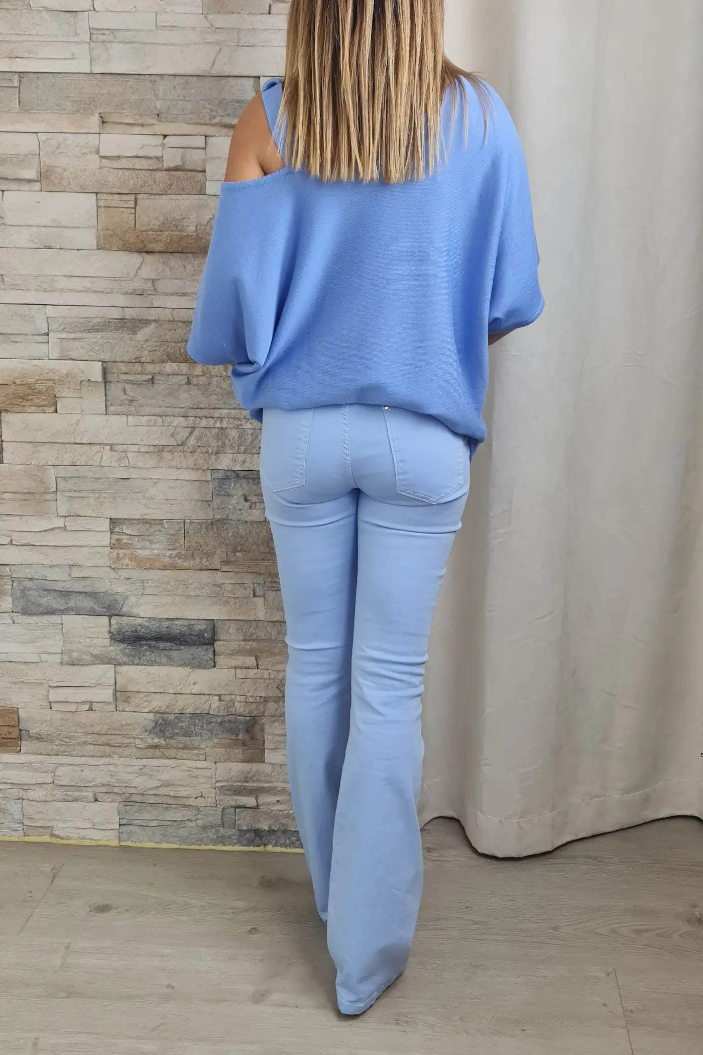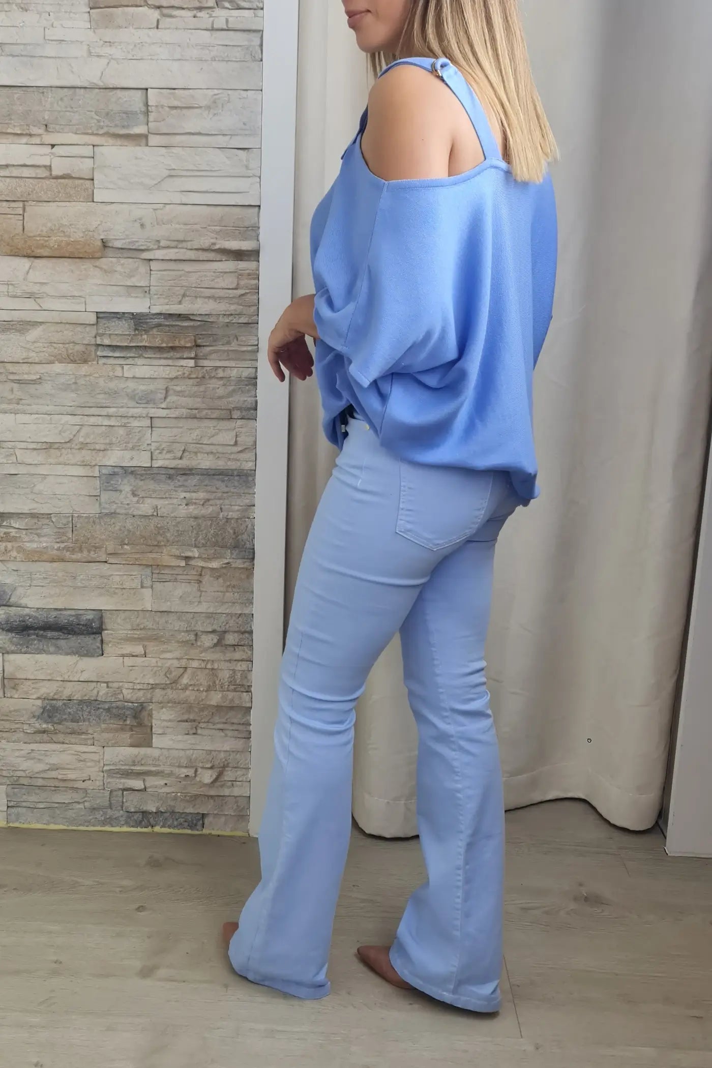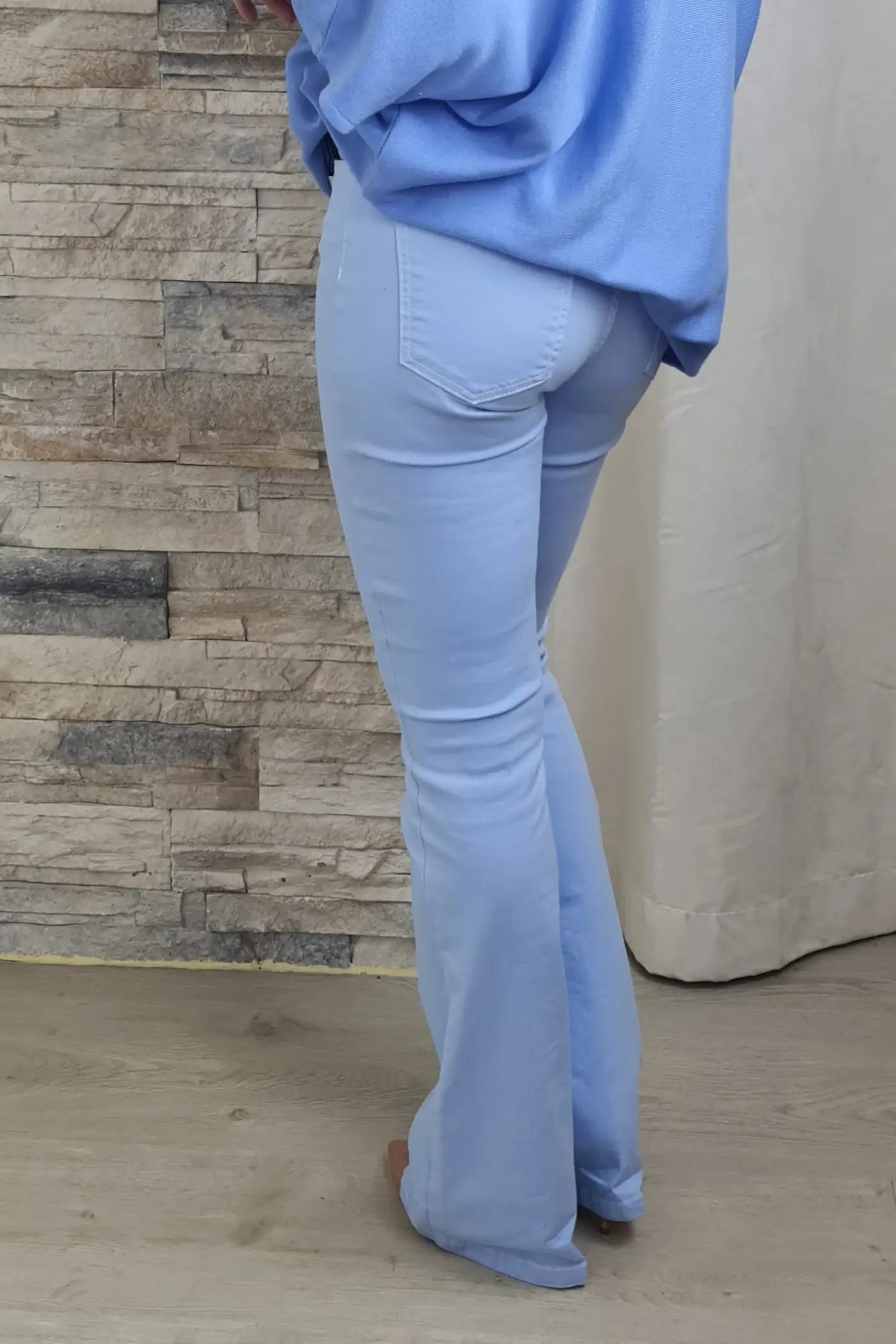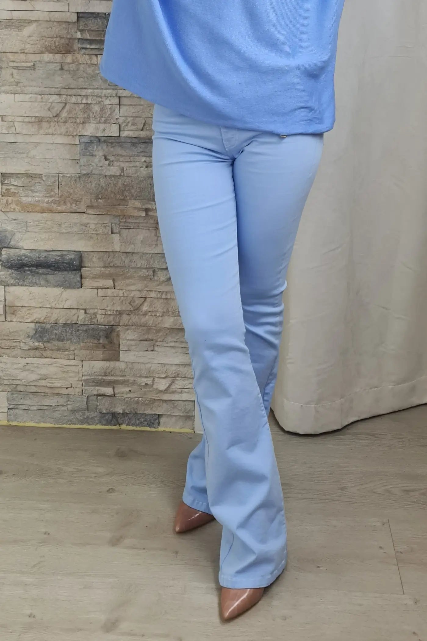 Ao vestir estas calças de ganga, a suavidade do tecido adapta-se ao seu corpo, proporcionando uma sensação de bem-estar imediato. A cor azul céu, leve e serena, evoca a clareza e a criatividade, lembrando-a de que a sua essência é única. O corte de perna larga, ou "boca de sino", não é apenas uma tendência; é um símbolo de liberdade, convidando-a a movimentar-se sem restrições e a expressar o seu estilo com confiança.