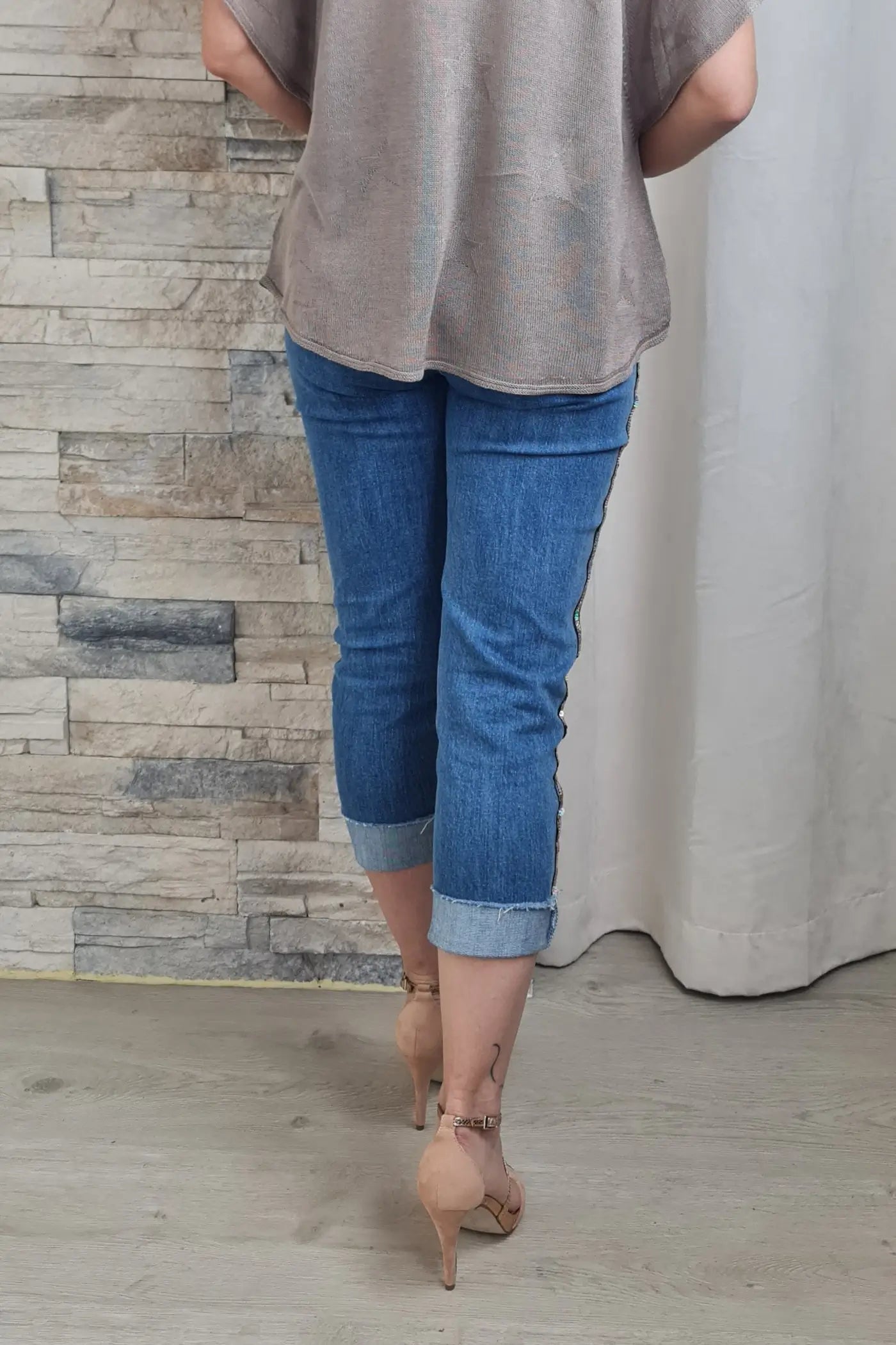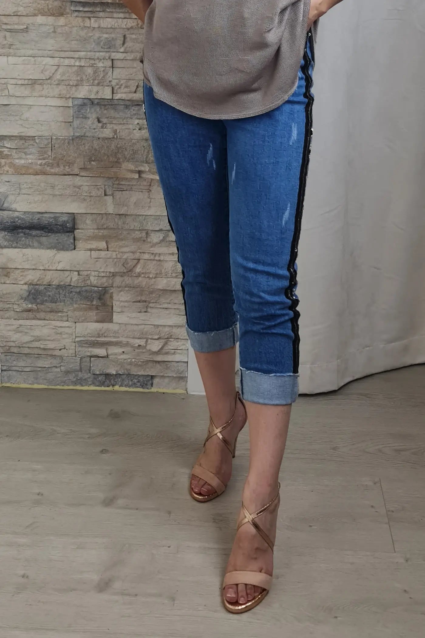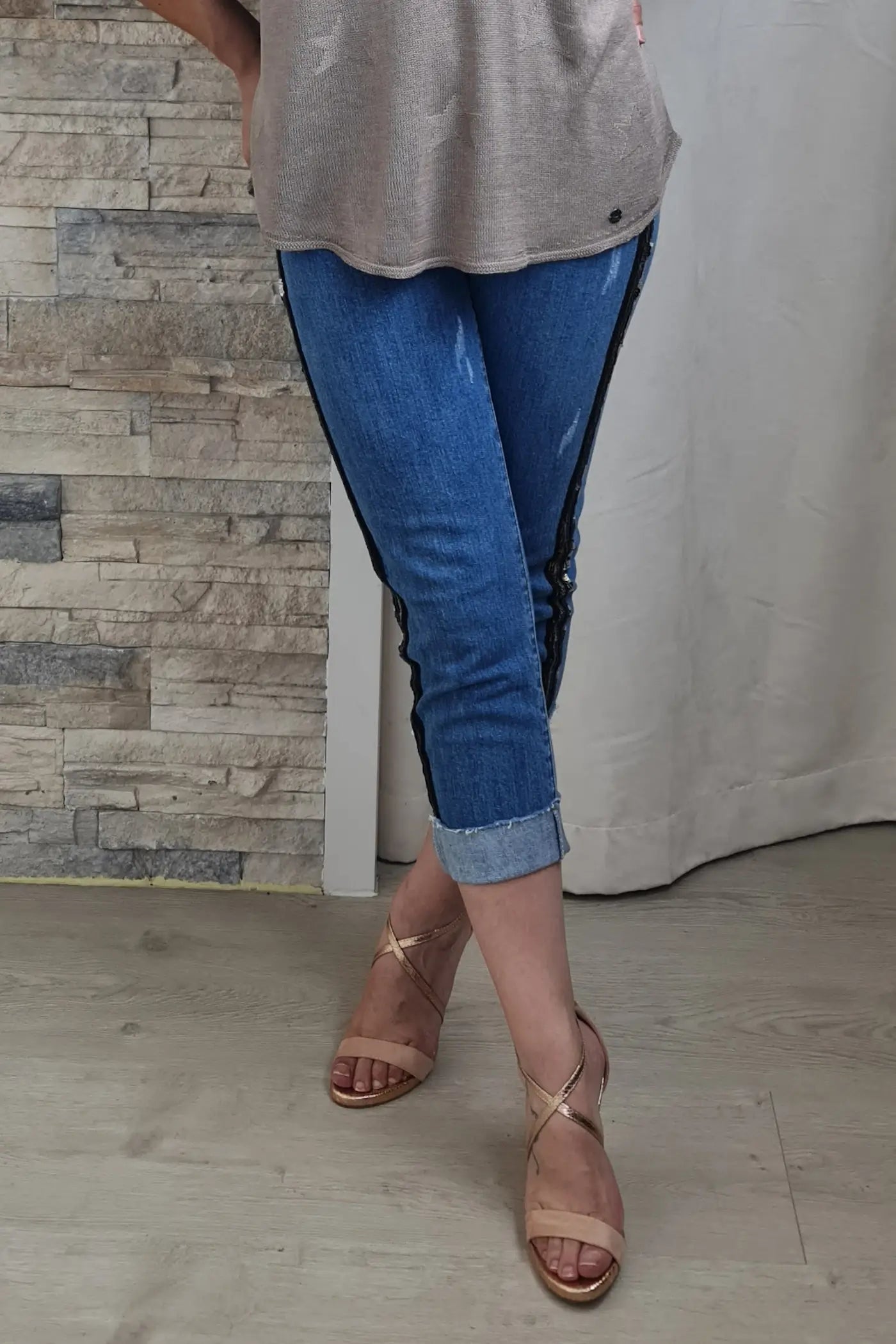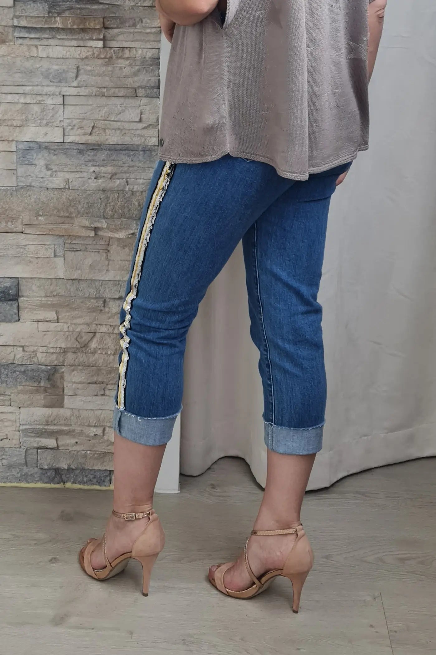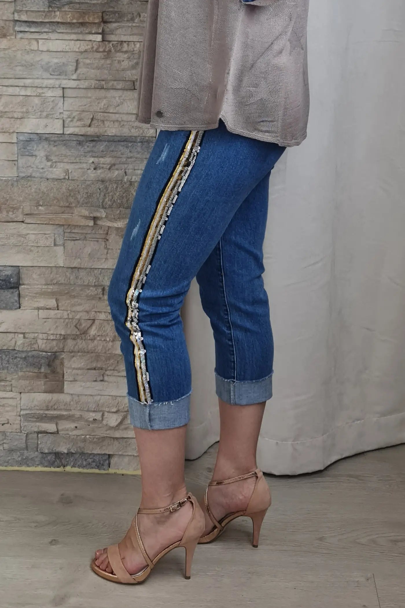 Ao vestir estas calças de ganga, o tecido adapta-se ao seu corpo, proporcionando uma sensação de bem-estar imediato. A cor azul ganga clássica é complementada por um detalhe que faz toda a diferença: uma risca lateral com lantejoulas, brilhantes e alegres. Este pormenor subtil mas ousado é um lembrete do seu brilho interior. A bainha virada confere um ar descontraído e casual, perfeito para o dia a dia, para um encontro com amigos ou para uma ida a um festival.