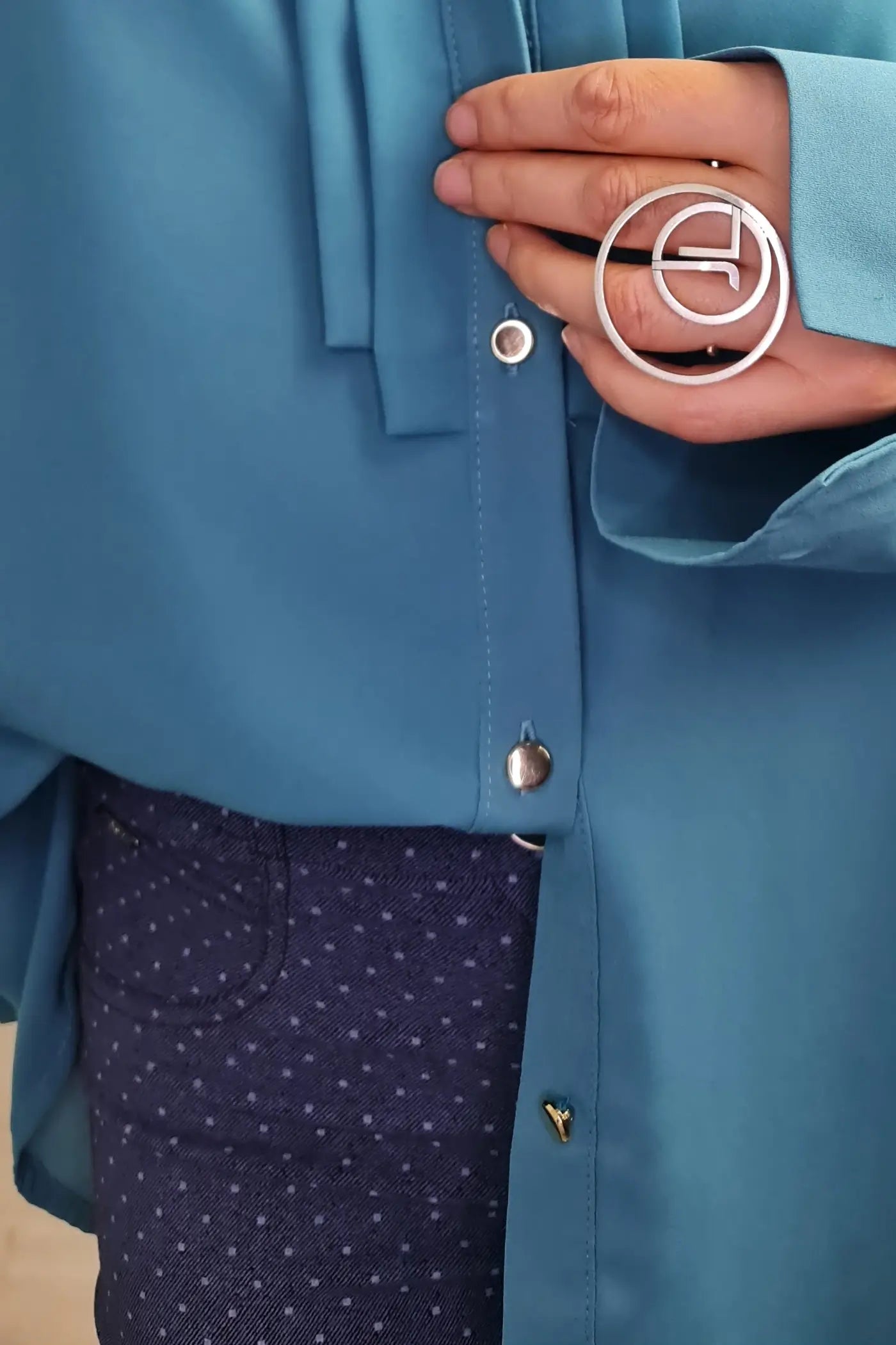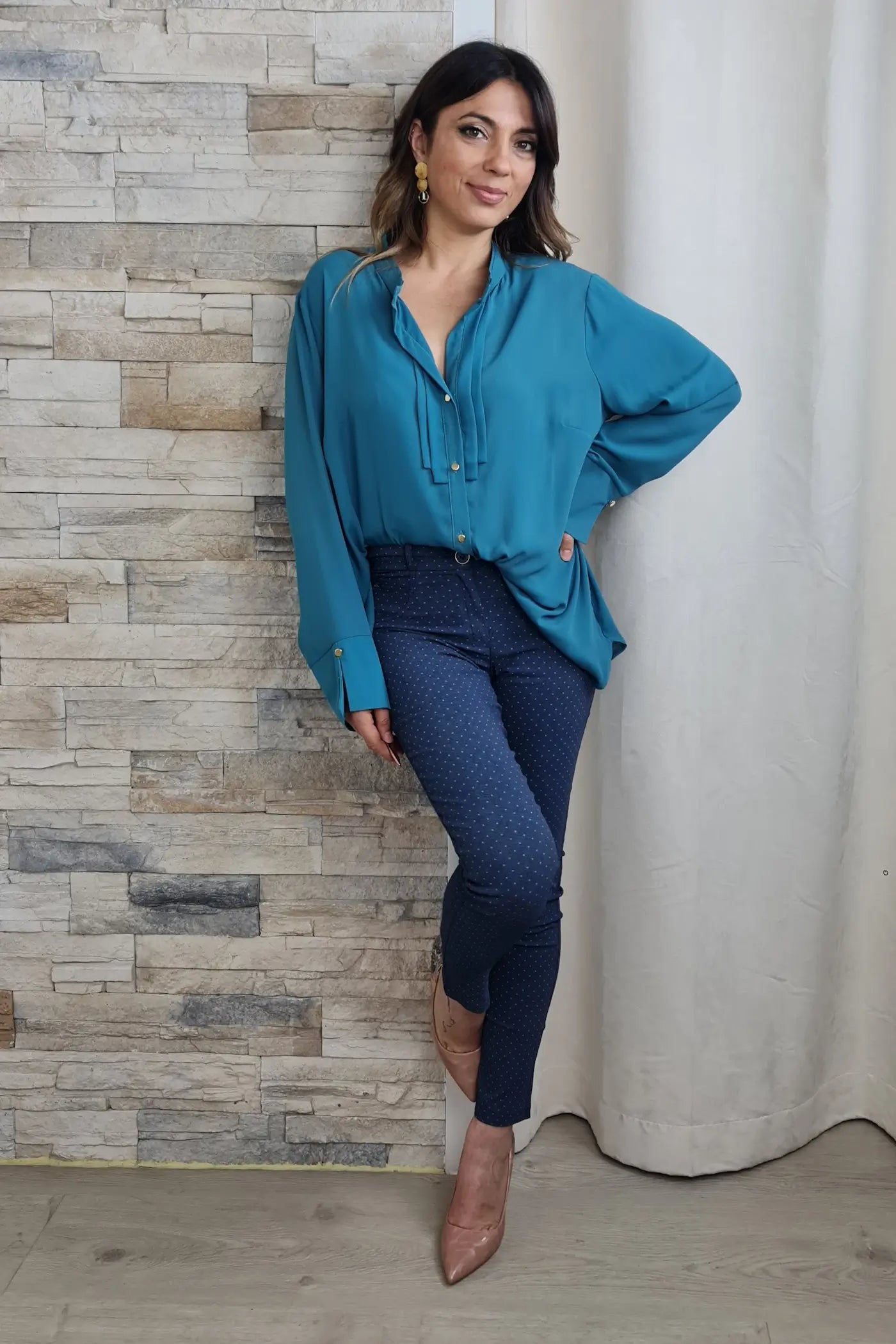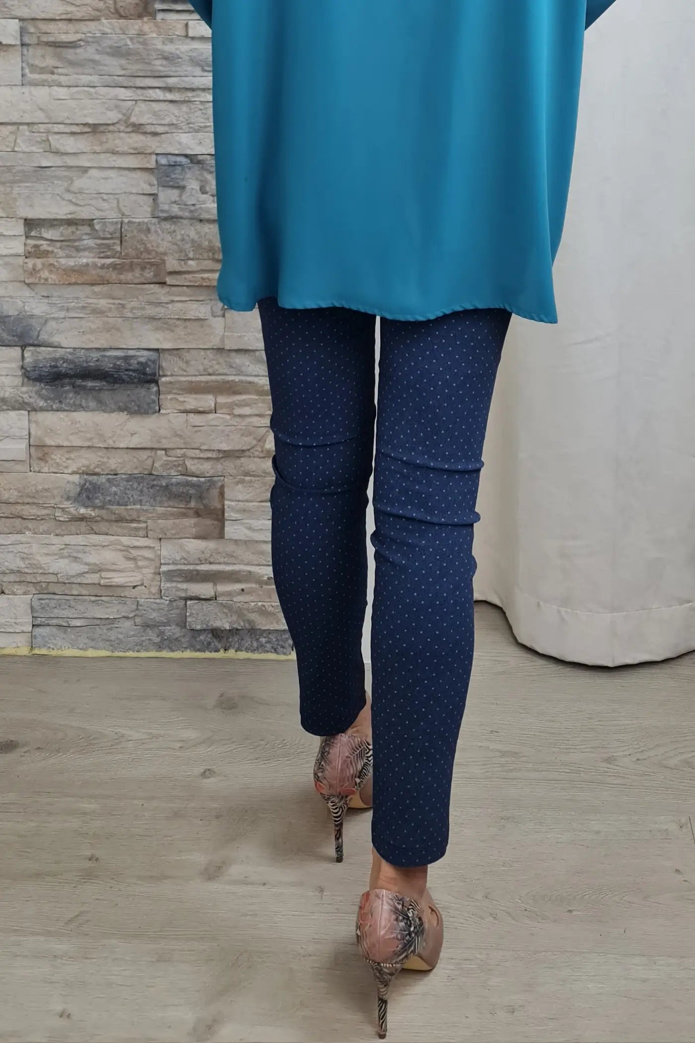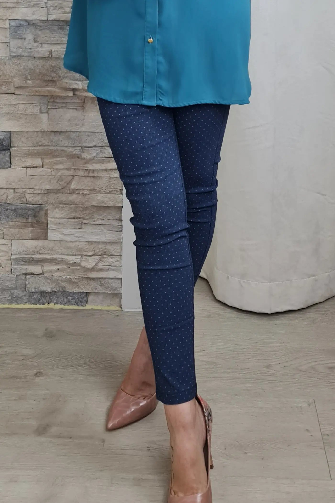 Ao vestir estas calças, a sua cor azul, que evoca a serenidade do oceano e a leveza do céu, proporciona uma sensação de calma e otimismo. O seu corte ajustado, com o detalhe de bolinhas, confere-lhe um visual único e expressivo, sem comprometer o conforto. O seu design versátil e elegante permite que a use em diversas ocasiões, seja para um almoço com amigas, um passeio ou para adicionar um toque de originalidade ao seu dia a dia.