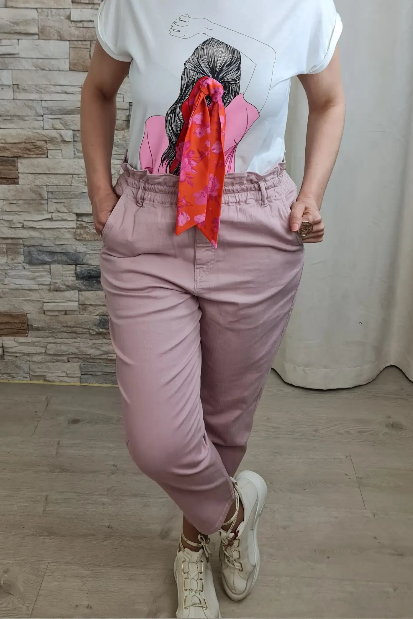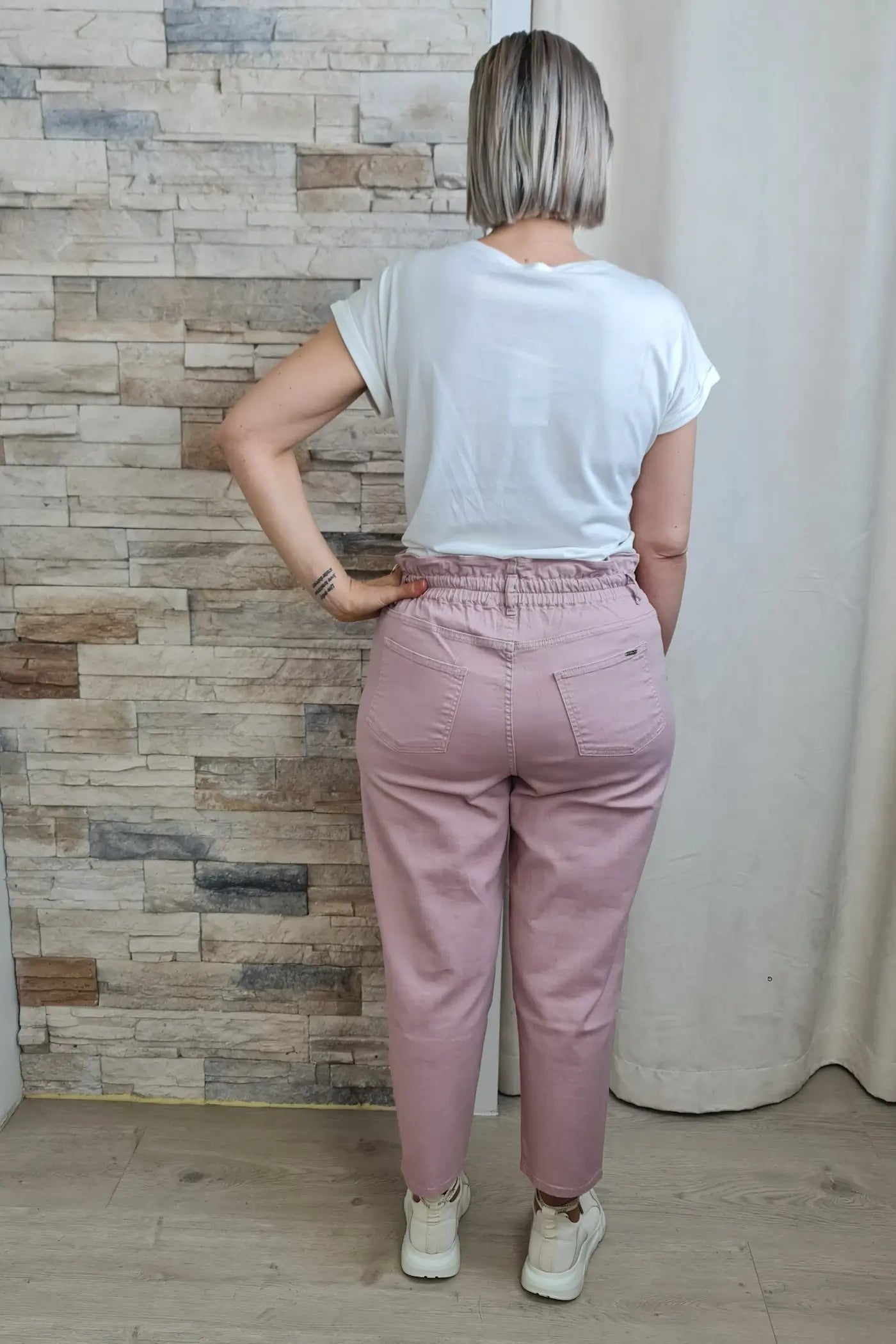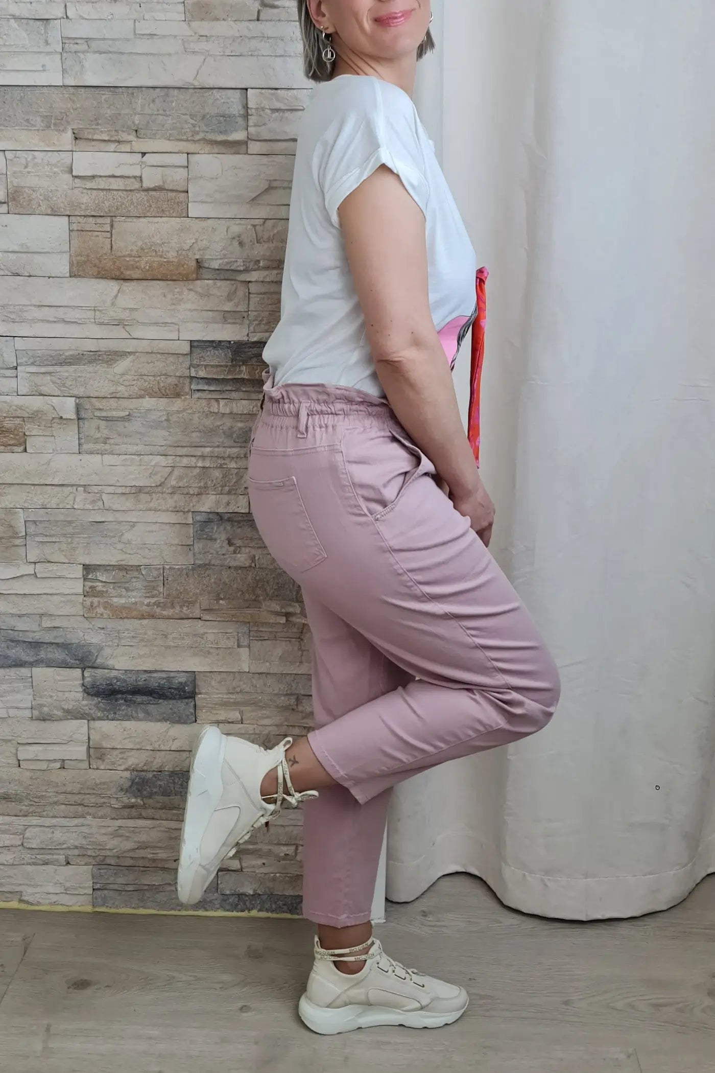 As calças são de cor rosa seco, com um corte reto e comprimento que termina ligeiramente acima do tornozelo. Possuem cintura subida, evidenciada pelo cós elástico franzido com um cordão ajustável na frente. Há bolsos laterais visíveis. O tecido parece ser de algodão ou uma mistura de algodão, com um aspeto casual e confortável.