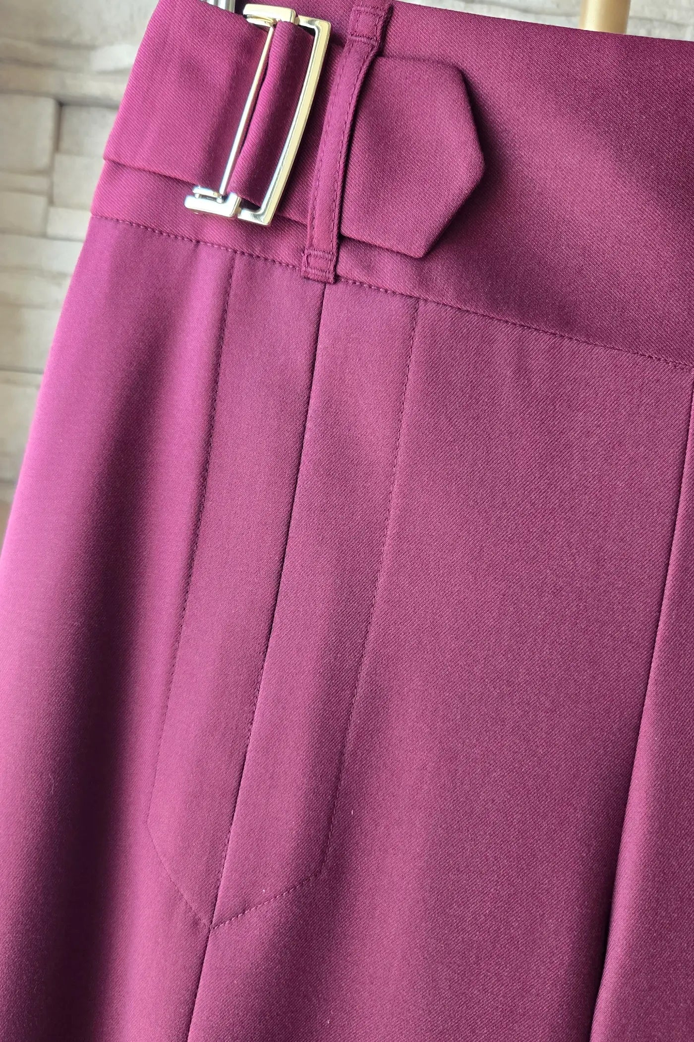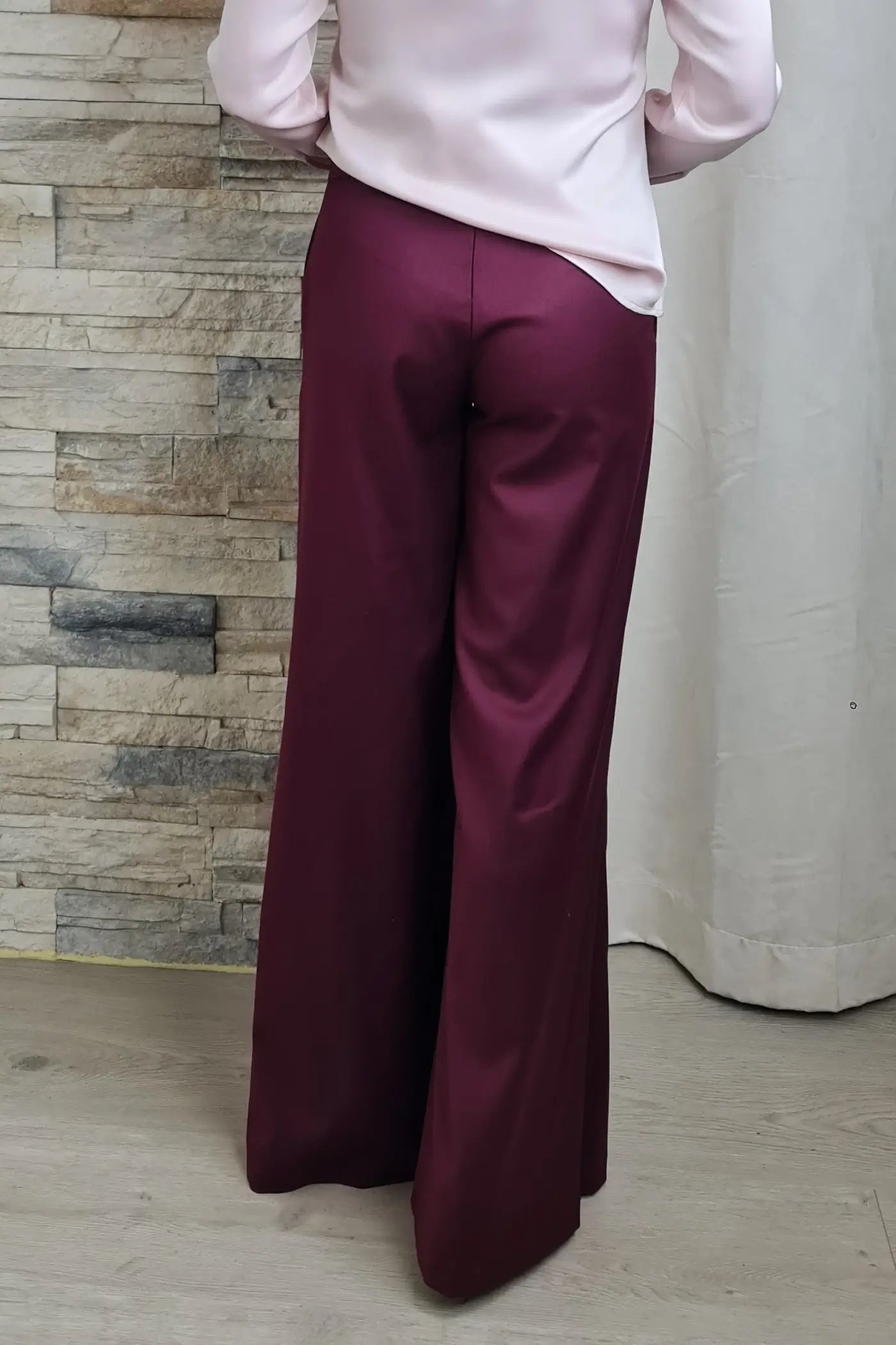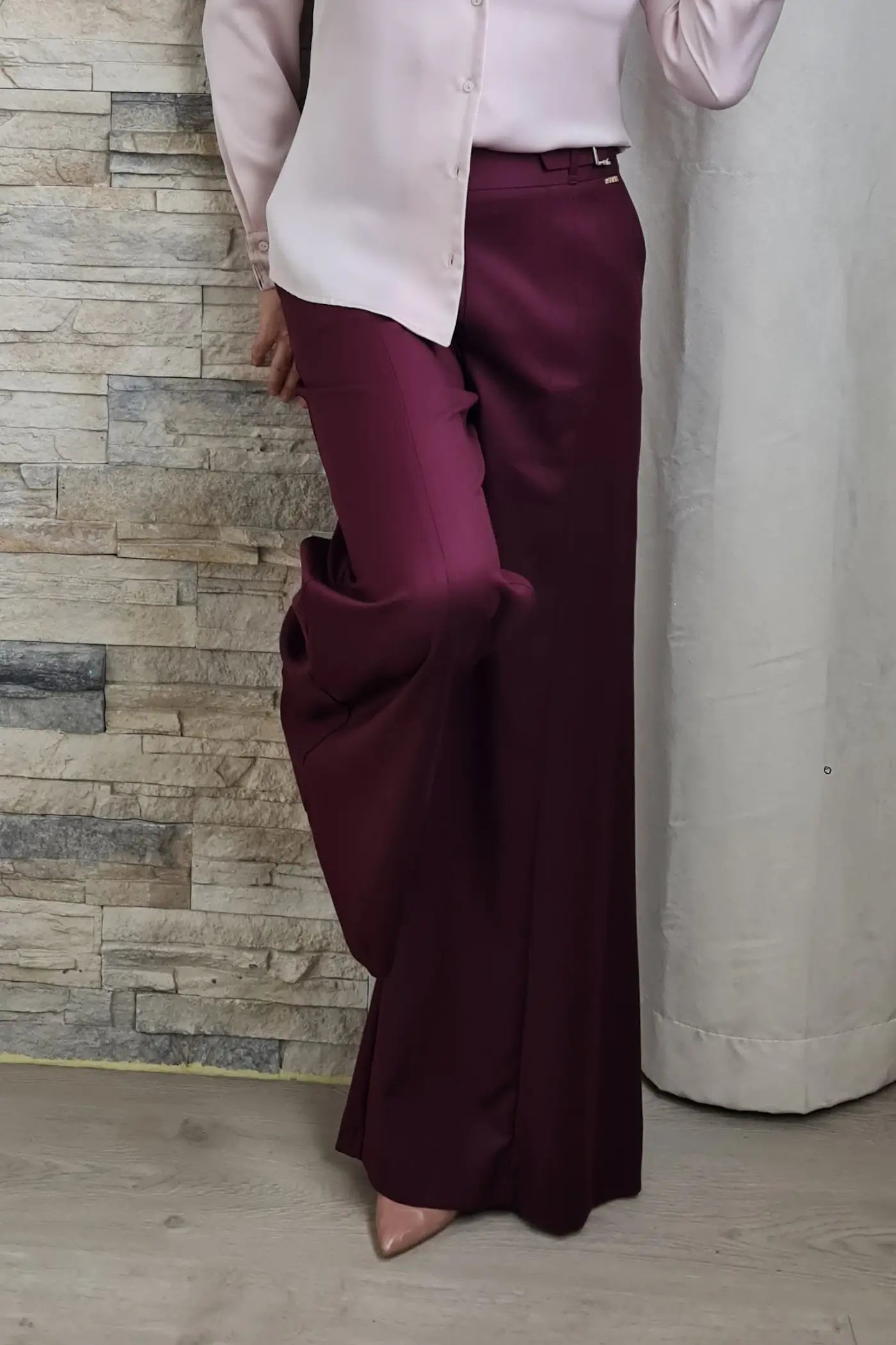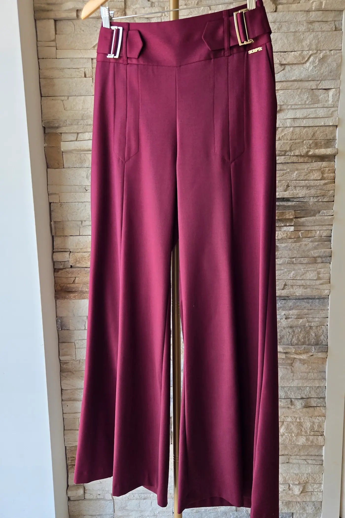 O design é clássico com um toque moderno. Em tom bordeaux, destacam-se pelos detalhes de fivela dourada na cintura, adicionando um toque refinado e único. O corte de perna larga oferece uma silhueta alongada e elegante.