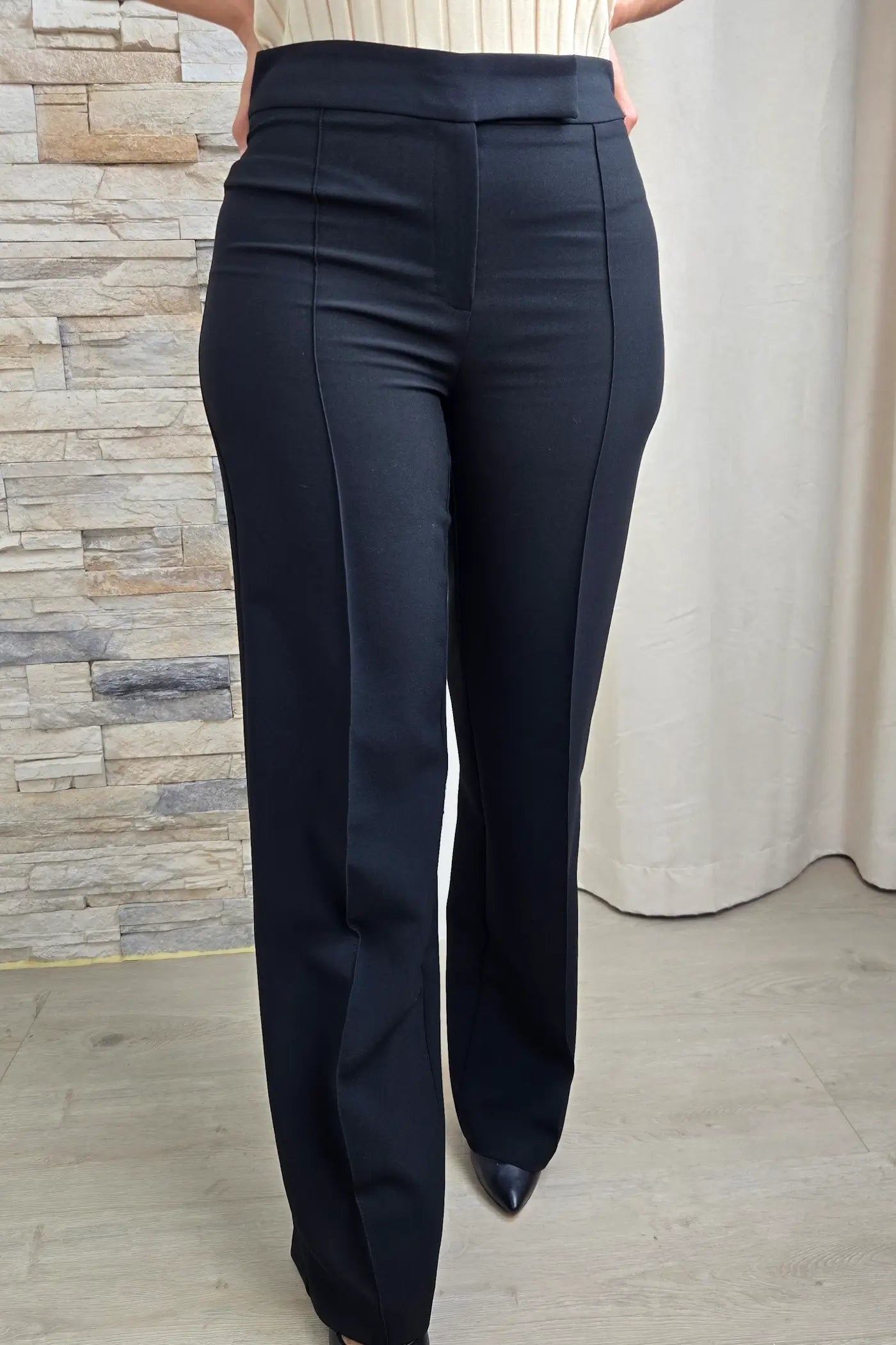 O design é clássico com um toque moderno. Em tom preto, destacam-se pelos vincos frontais bem definidos, que adicionam um toque de alfaiataria e elegância. O corte reto oferece uma silhueta alongada e versátil, perfeita para diversas ocasiões.