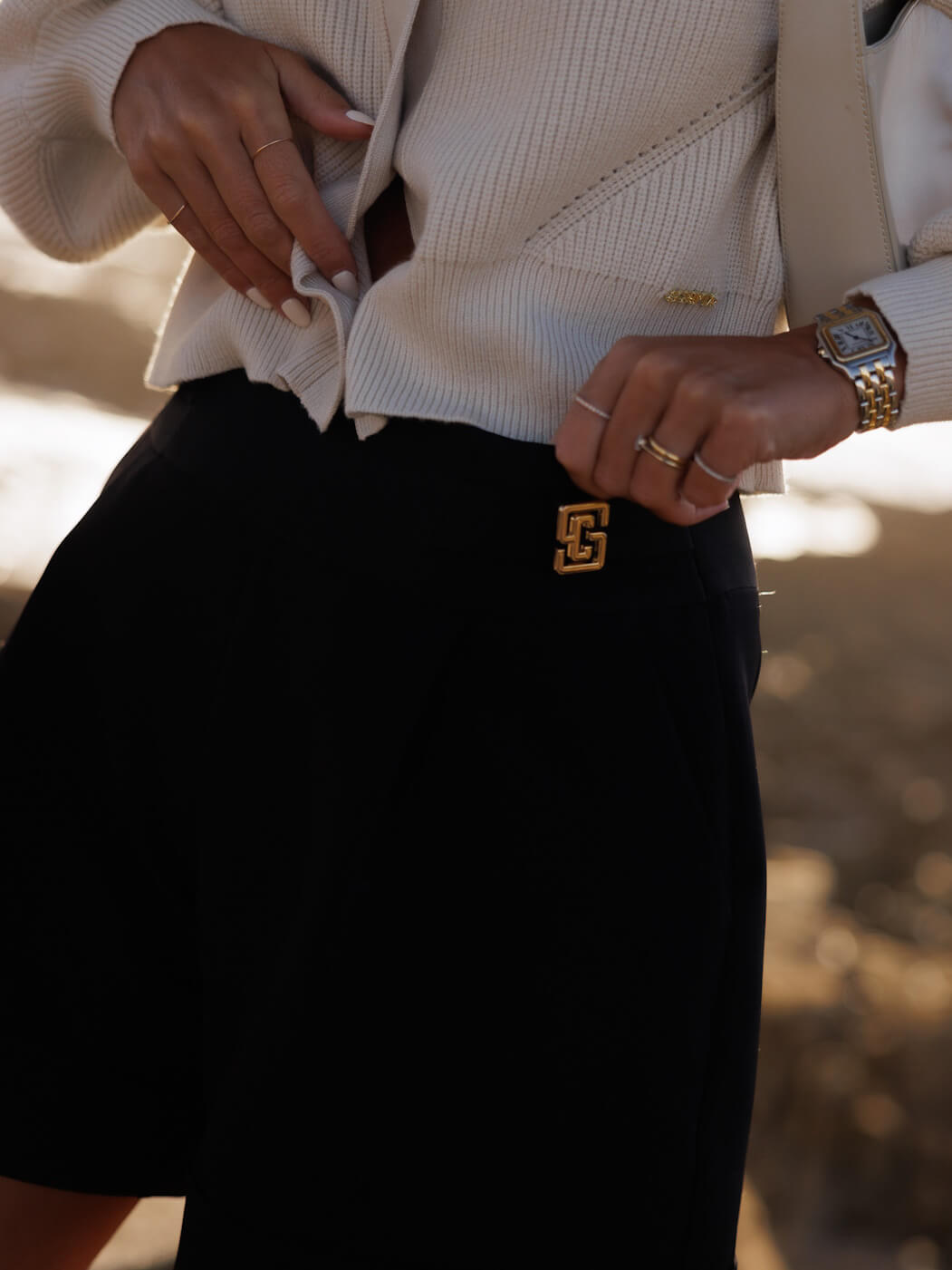 O design é uma fusão de alfaiataria e detalhes contemporâneos. Com um corte de cintura alta, pernas largas e pregas frontais, destaca-se pela cor preta clássica e um detalhe de presilha metálica dourada com a letra "S" estilizada na cintura, adicionando um toque de luxo discreto.