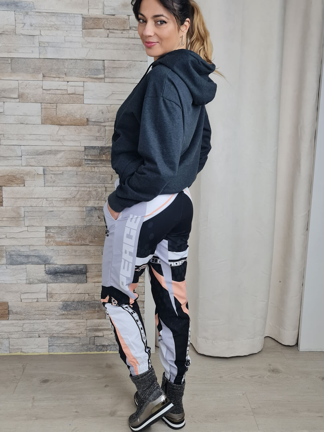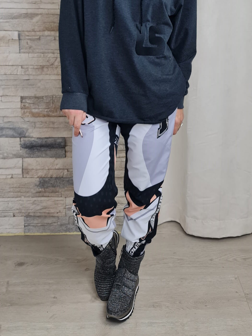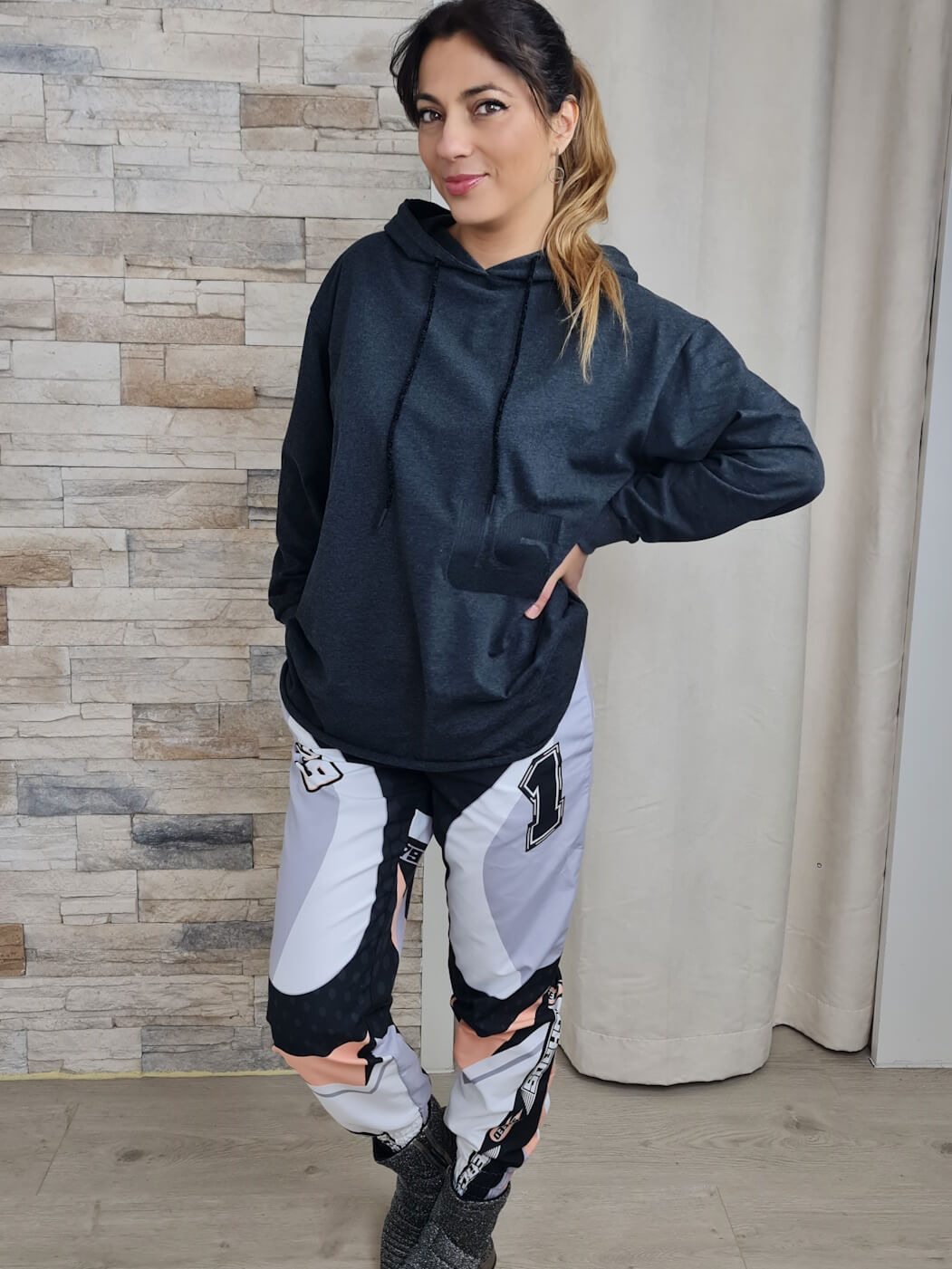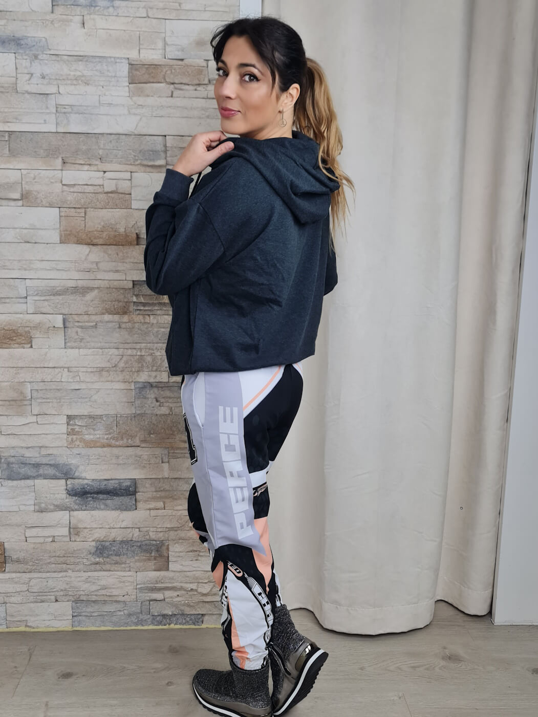 A cintura elástica e os punhos ajustados na barra das calças proporcionam um caimento perfeito e liberdade de movimento. A combinação com um casaco de capuz cinzento e ténis pretos completa o look casual e moderno, ideal para o dia a dia.