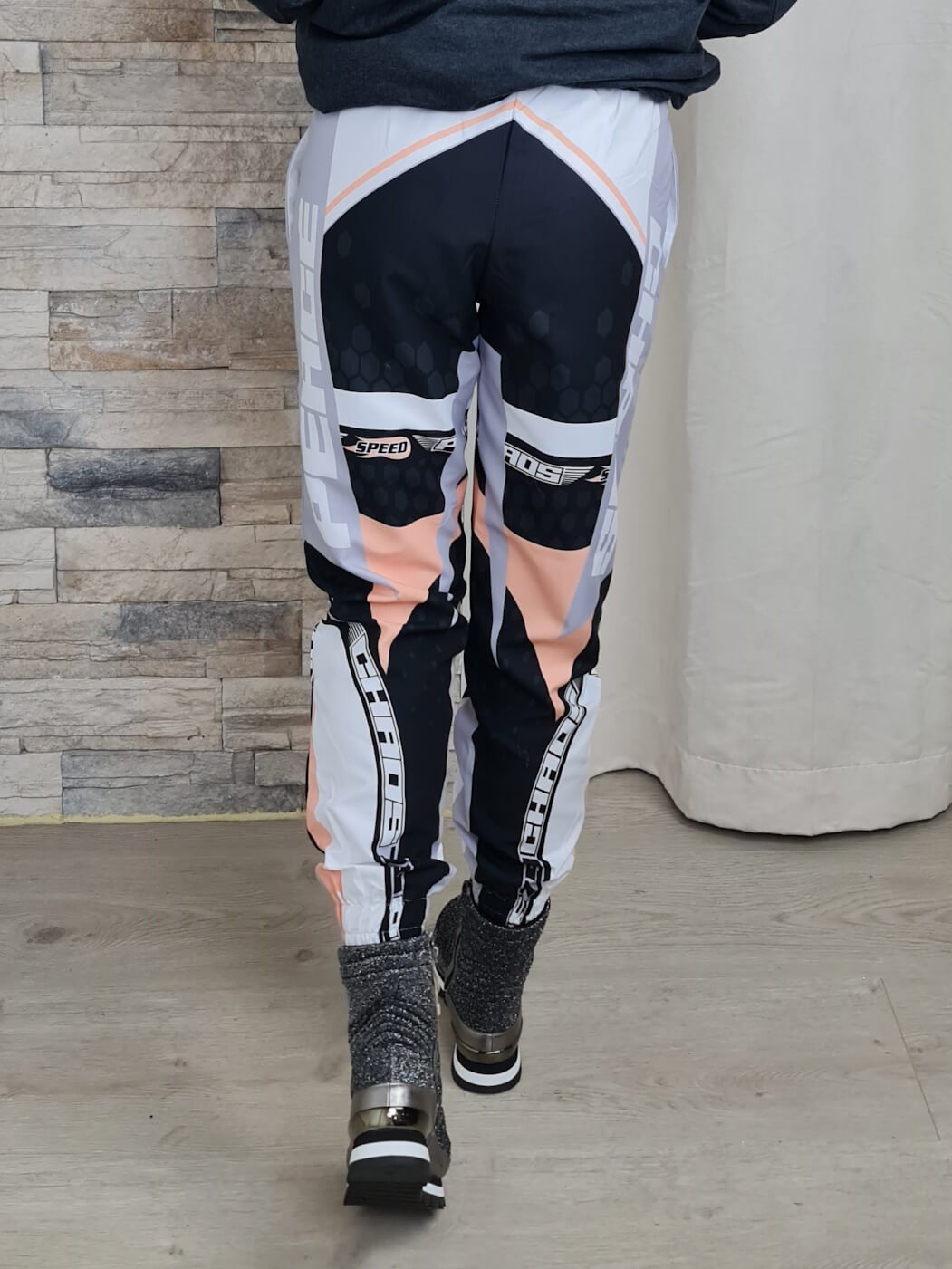 As calças apresentam um design moderno e descontraído, com um corte tipo jogger que se ajusta confortavelmente ao corpo. A combinação de cores cinza, branco e preto, com detalhes em rosa claro, confere um toque de estilo e originalidade à peça. Os detalhes incluem estampados com números e letras, adicionando um elemento desportivo e urbano ao visual.
