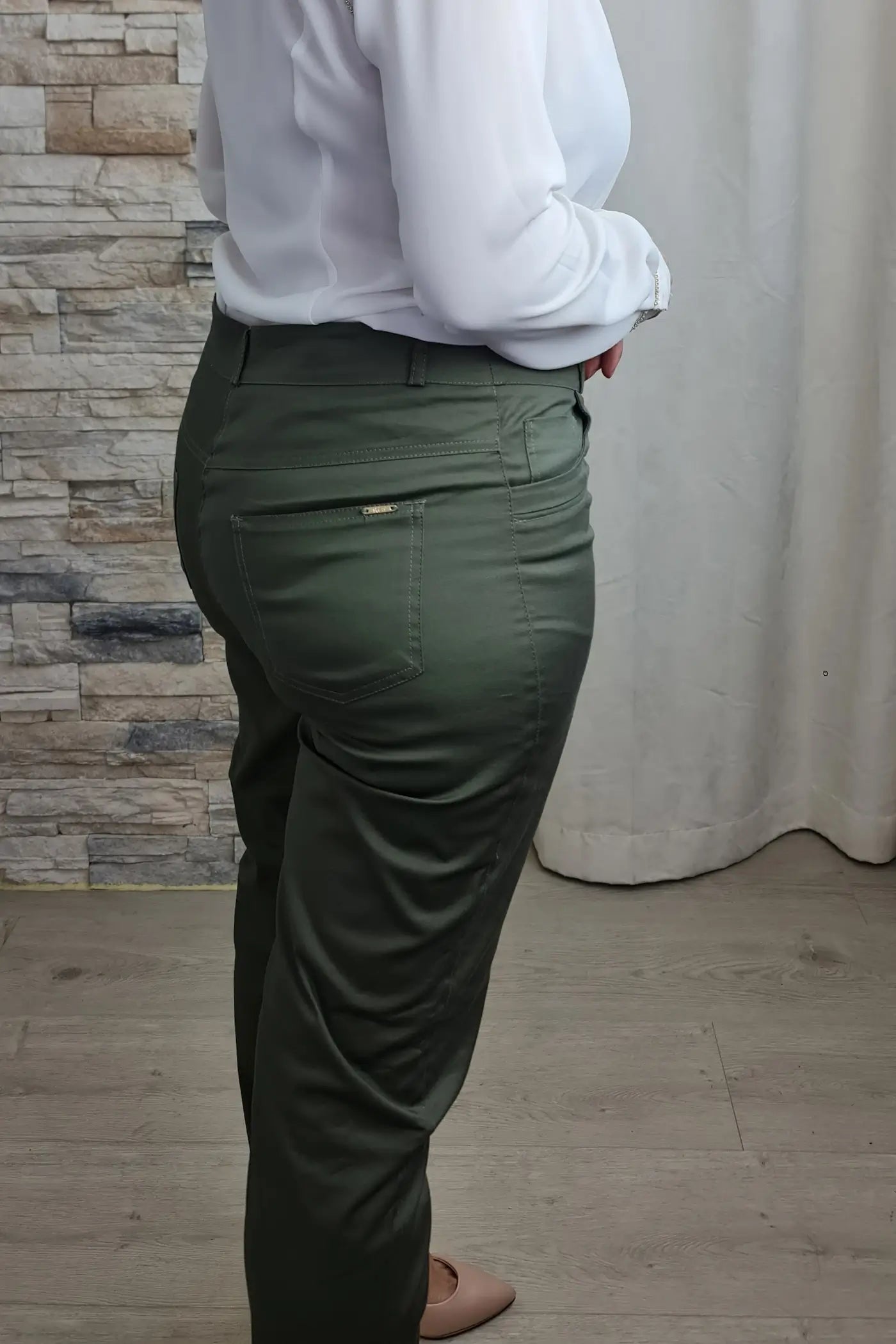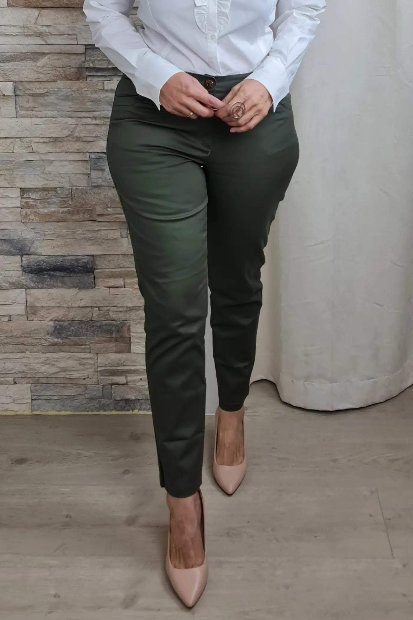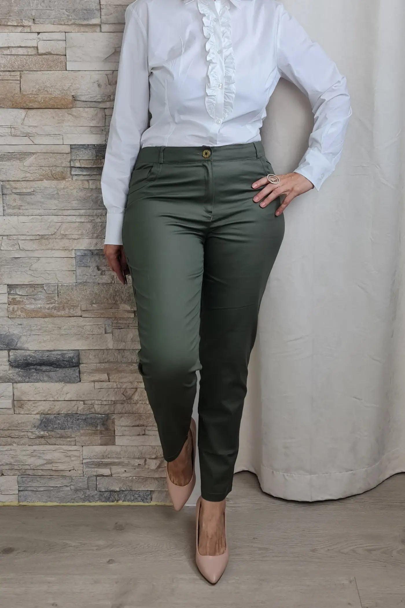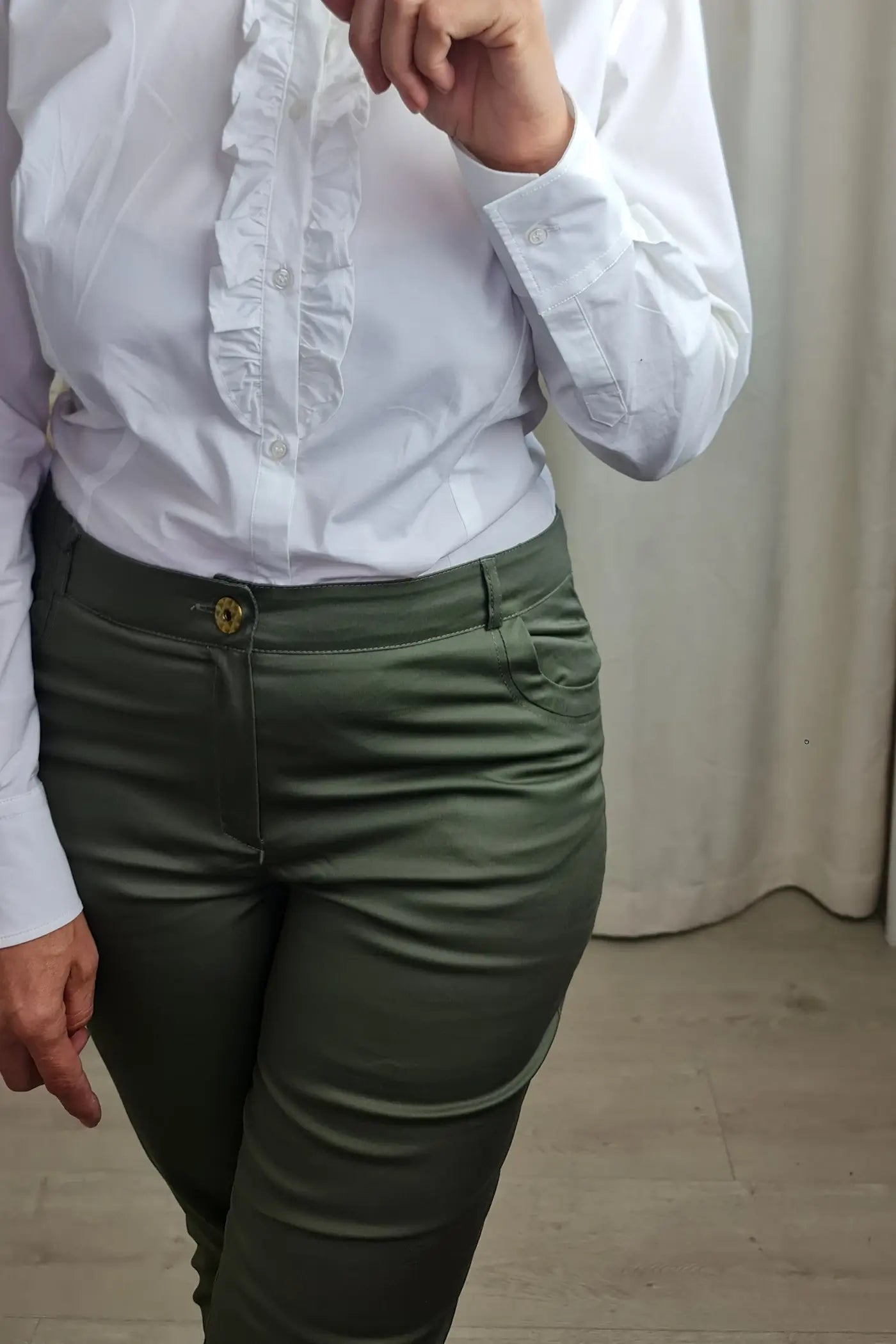 Ao vestir estas calças, a sua cor verde, que evoca a serenidade do oceano e a leveza do céu, proporciona uma sensação de calma e otimismo. O seu corte reto e o cinto no mesmo tom conferem-lhe um visual profissional e elegante, sem comprometer o conforto.