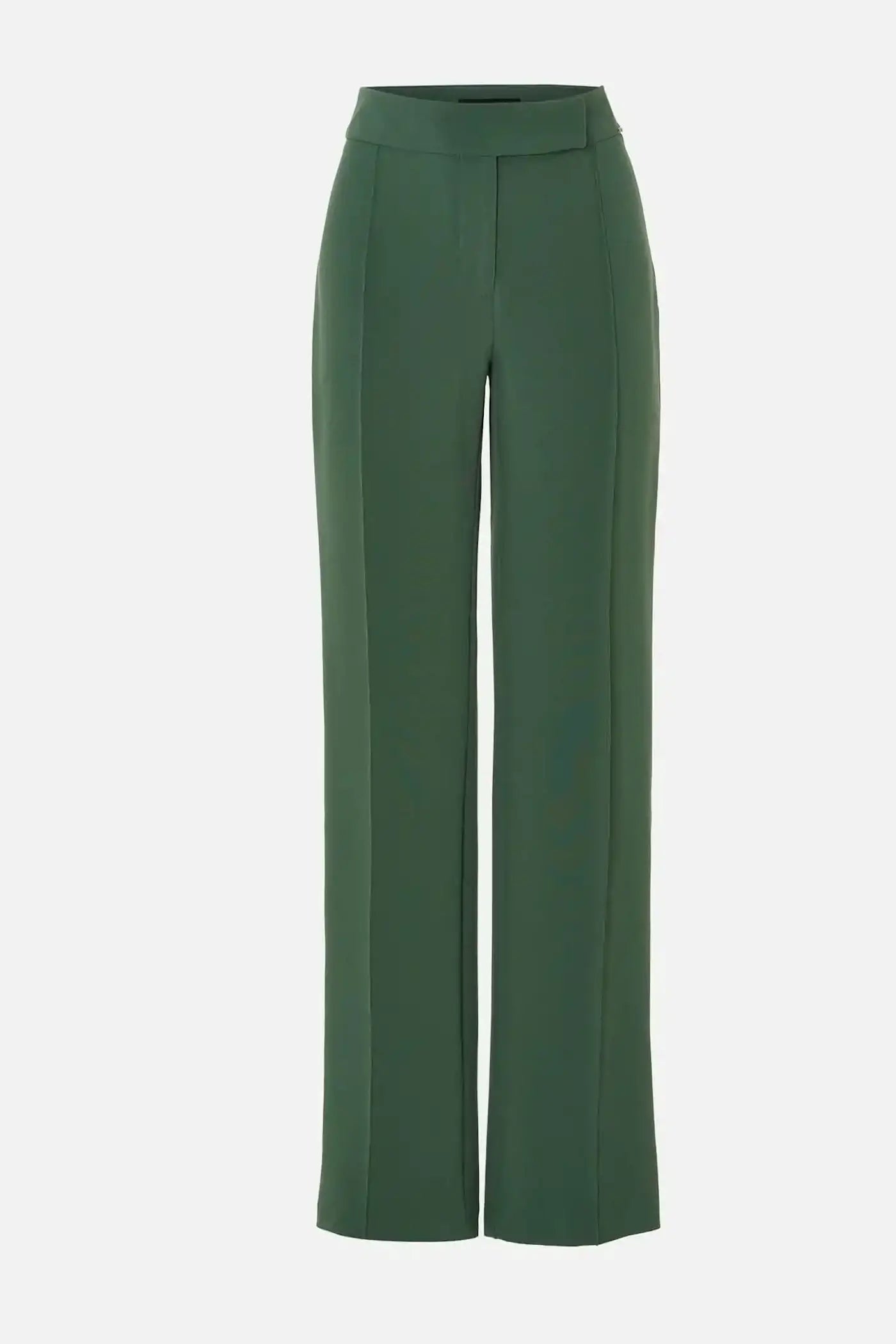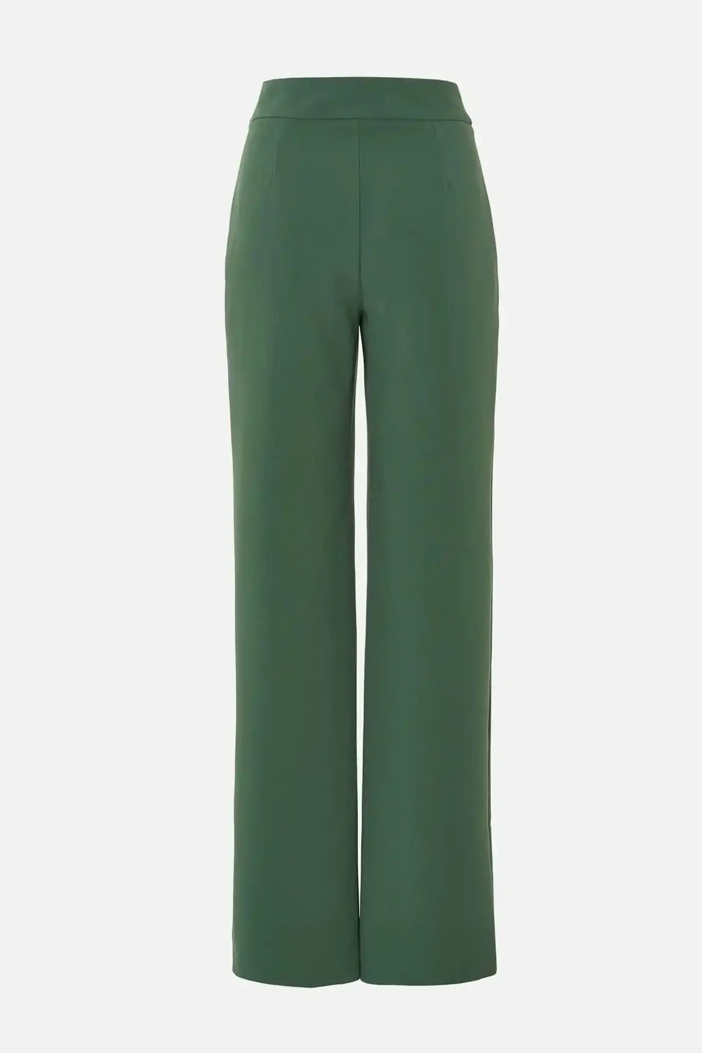 O design é clássico com um toque moderno. Em tom verde escuro, destacam-se pelos vincos frontais bem definidos, que adicionam um toque de alfaiataria e elegância. O corte reto oferece uma silhueta alongada e versátil, perfeita para diversas ocasiões.