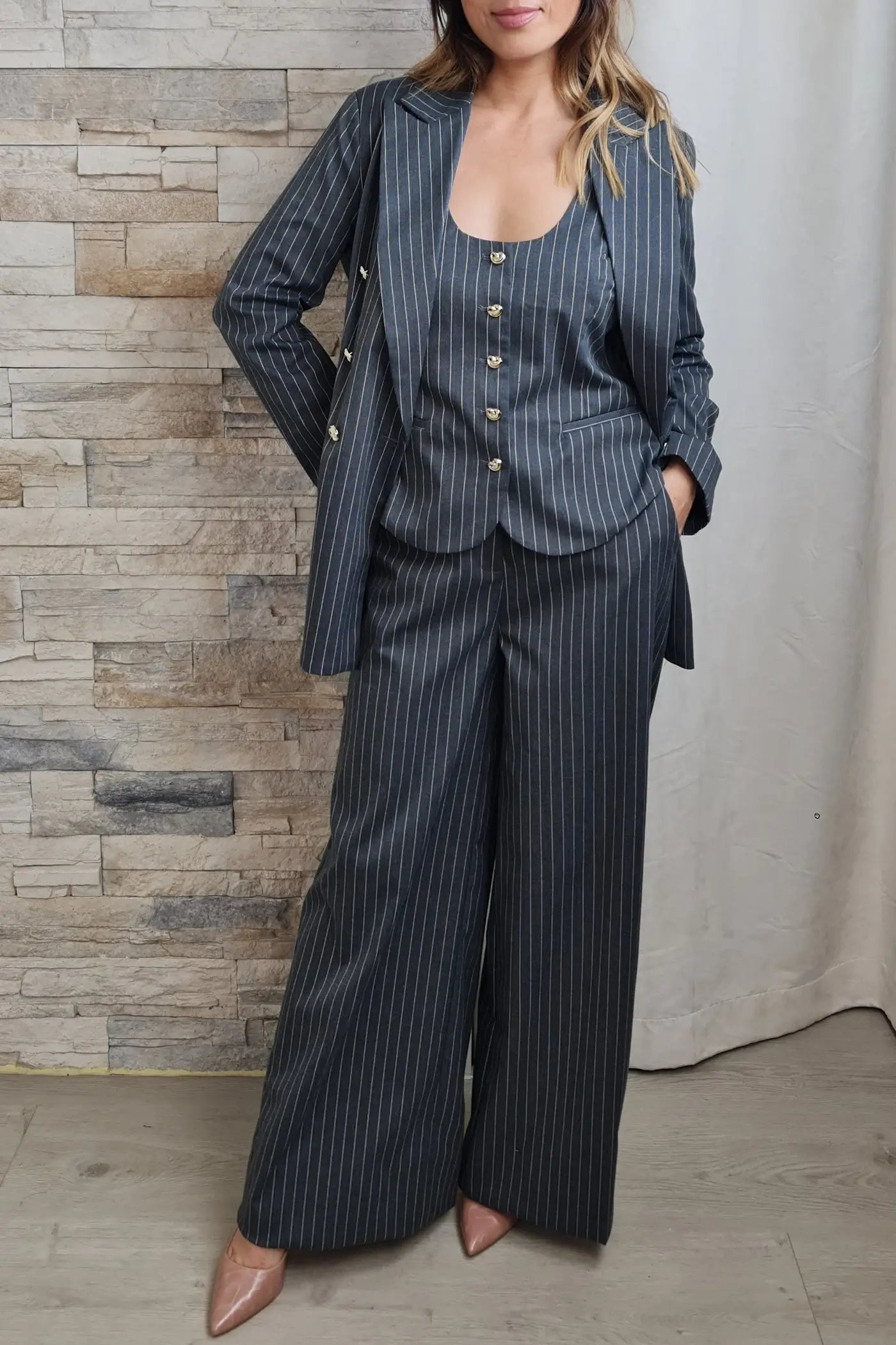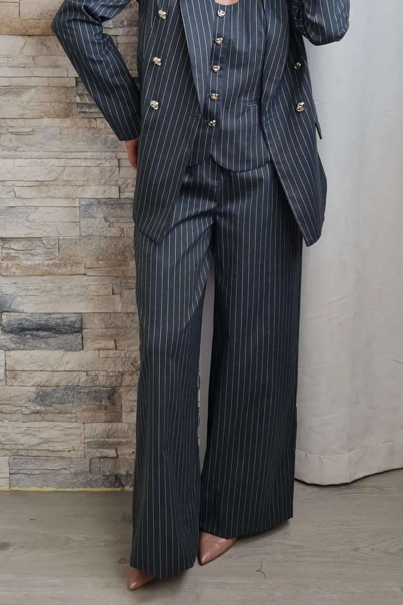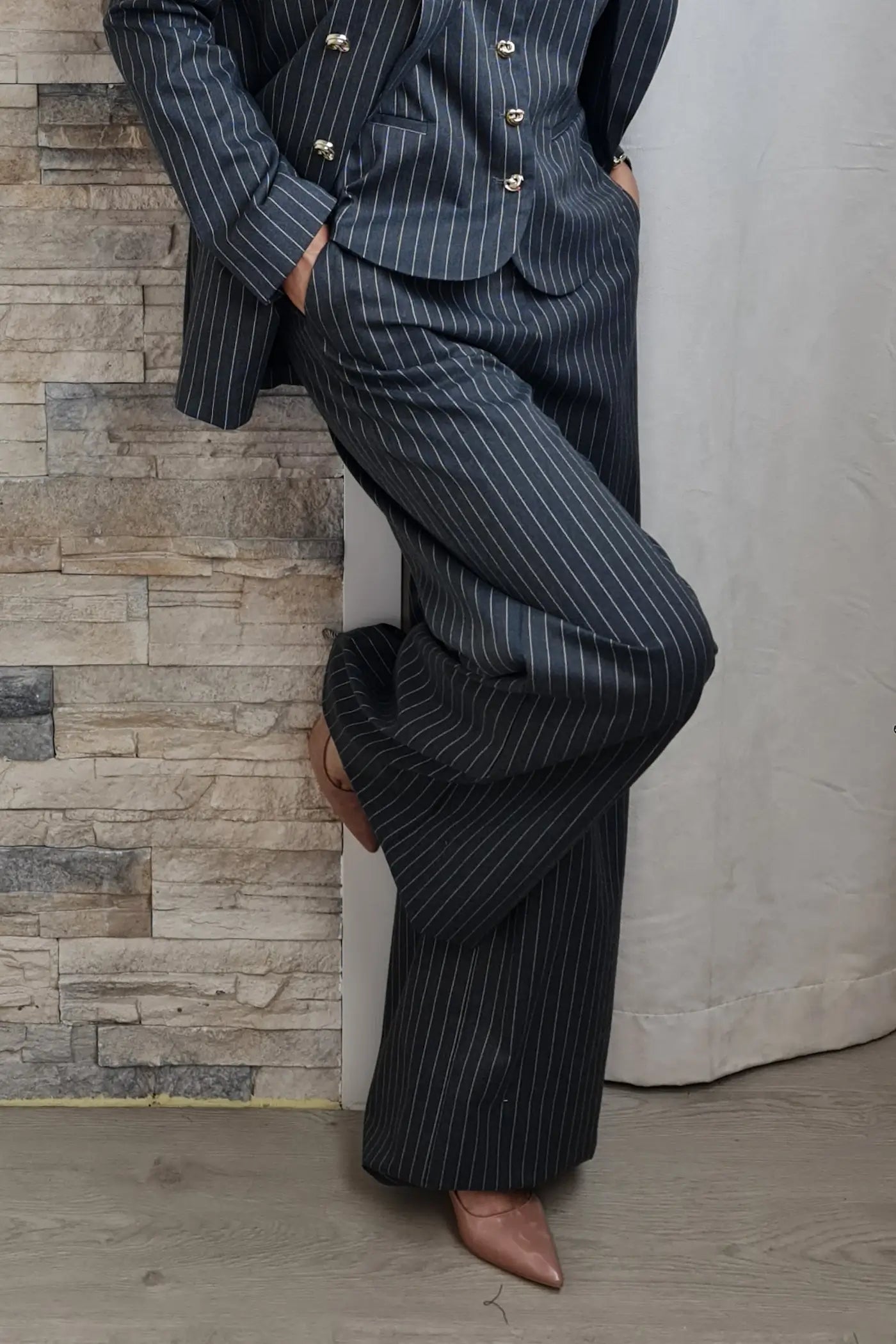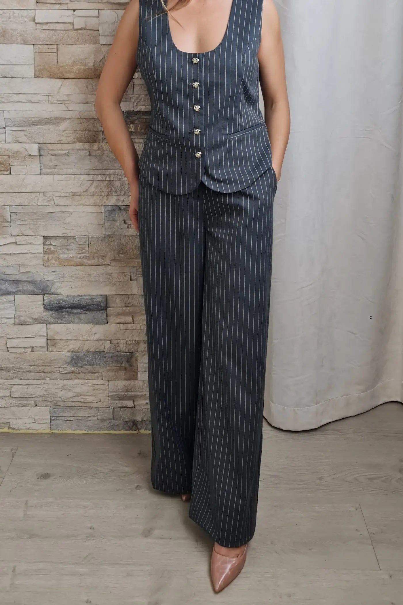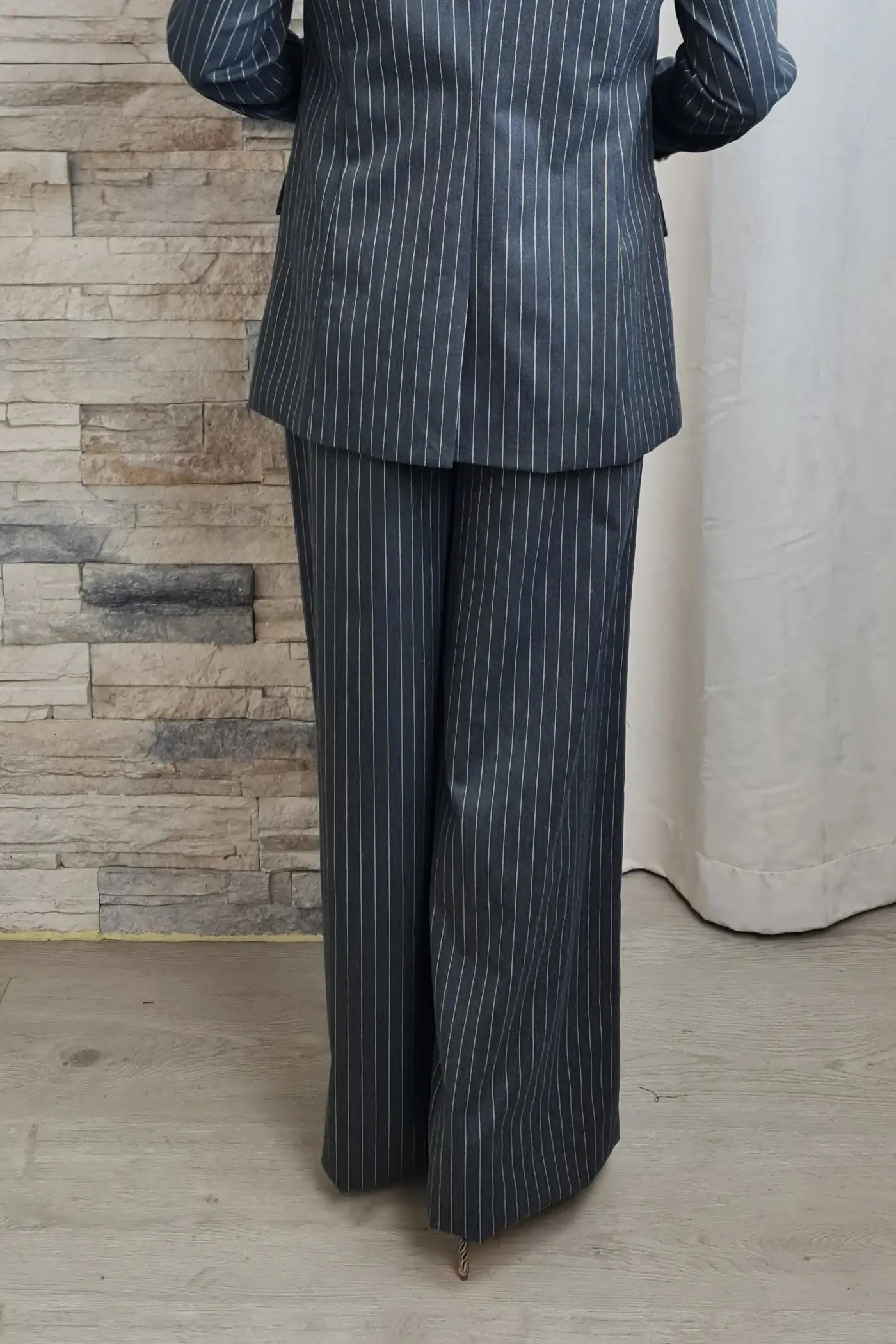 Ao vestir estas calças, sentirá a força e a sofisticação da cor cinzenta, que evoca o profissionalismo e a determinação, proporcionando uma sensação de controlo e confiança. As riscas de giz finas e bege não são apenas um padrão clássico; o seu corte de pantalona, largo e fluido, confere um visual imponente e moderno, que alonga a silhueta e garante o máximo conforto.
