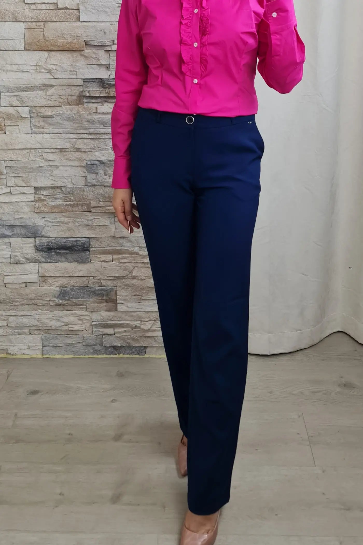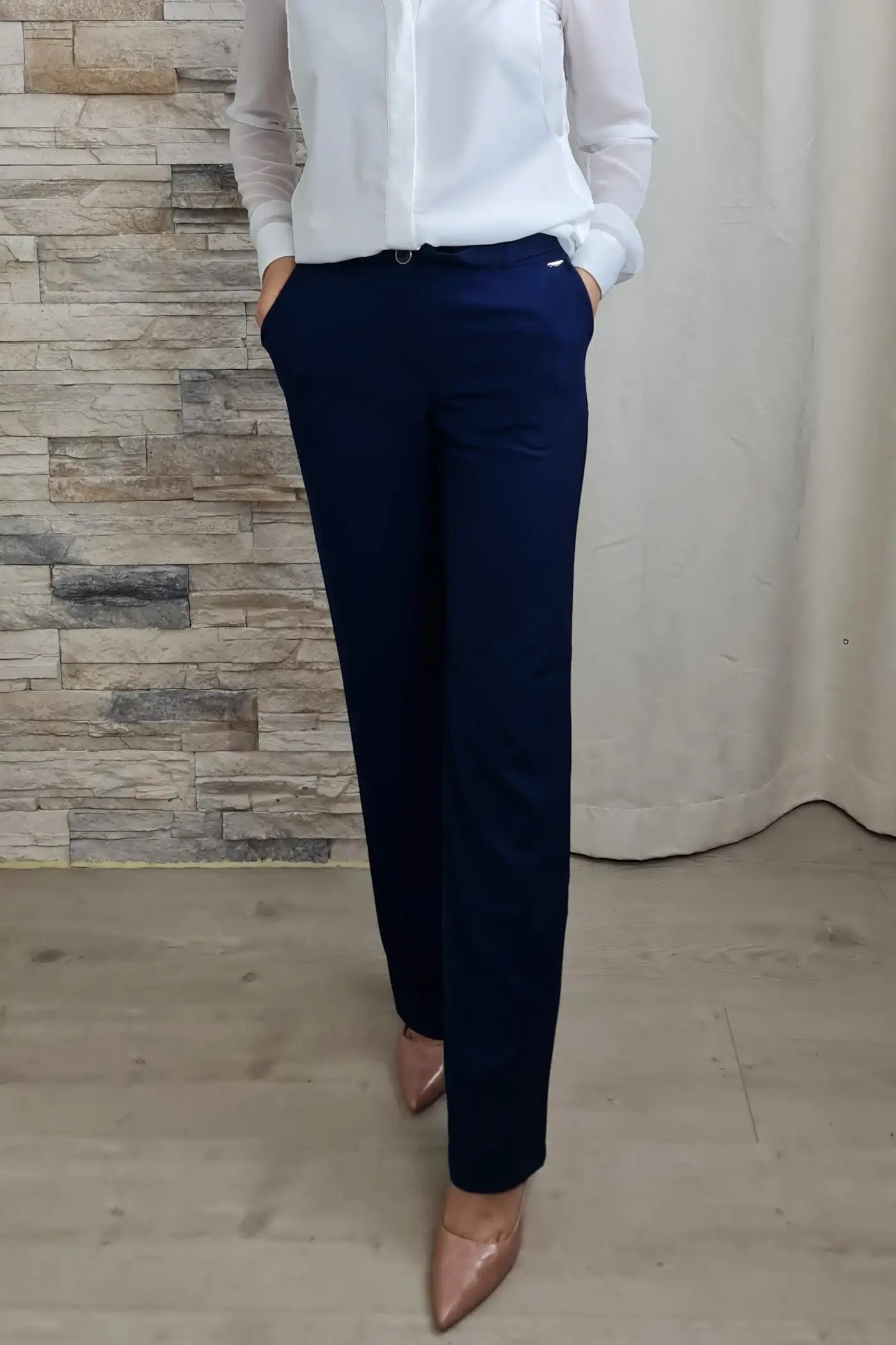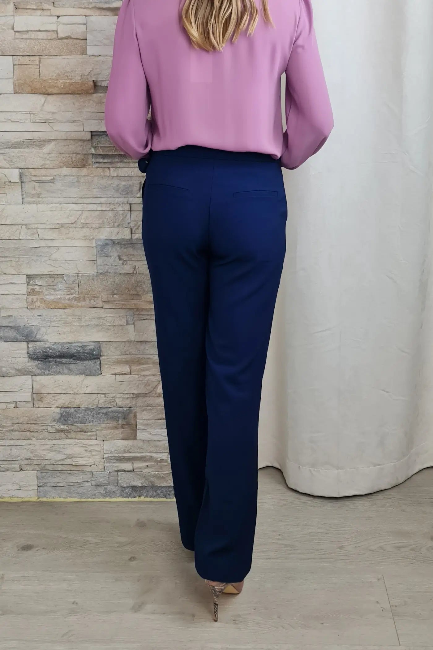 Ao vestir estas calças, a sua cor azul, que evoca a serenidade do oceano e a leveza do céu, proporciona uma sensação de calma e otimismo. O seu corte reto e o cinto no mesmo tom conferem-lhe um visual profissional e elegante, sem comprometer o conforto.