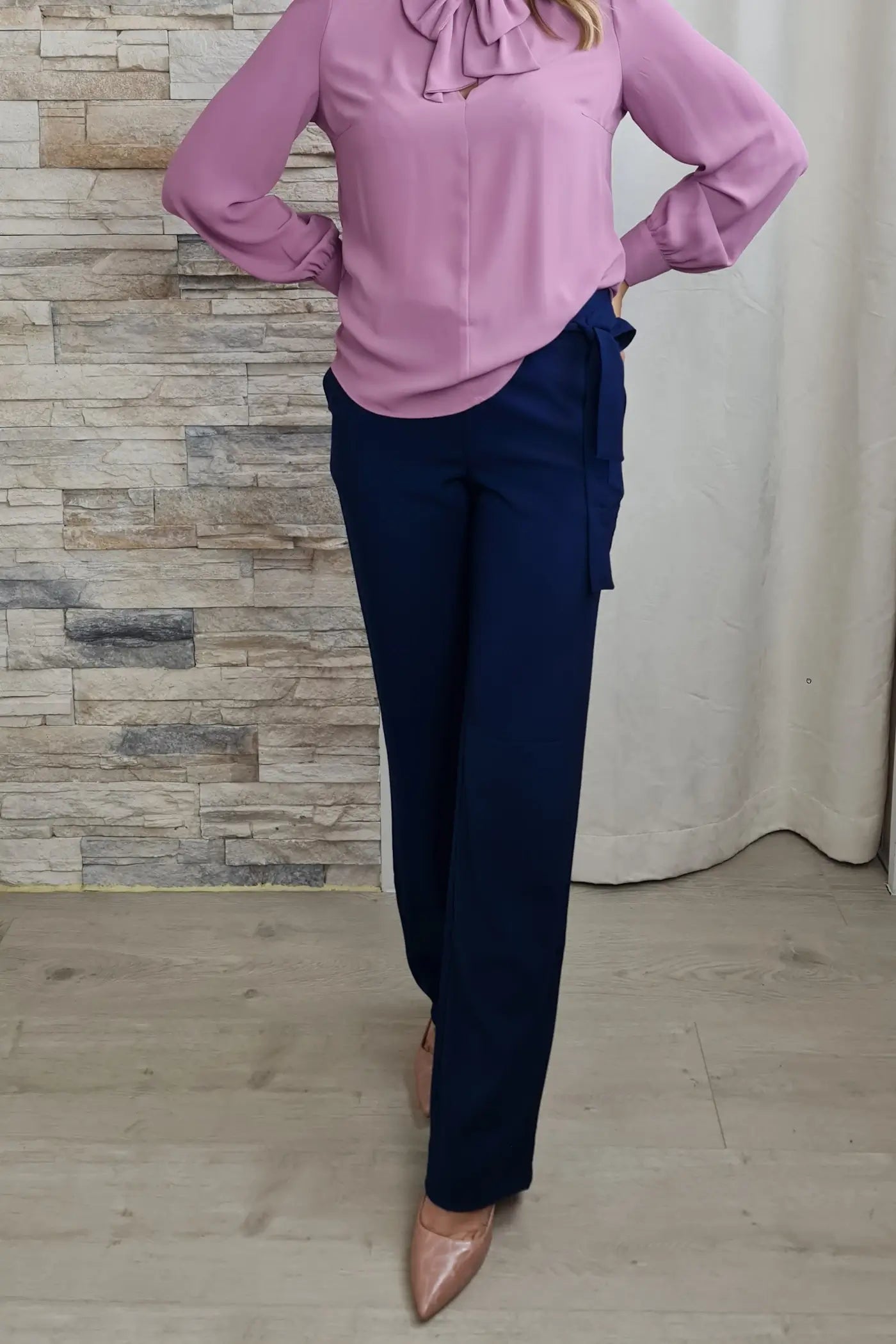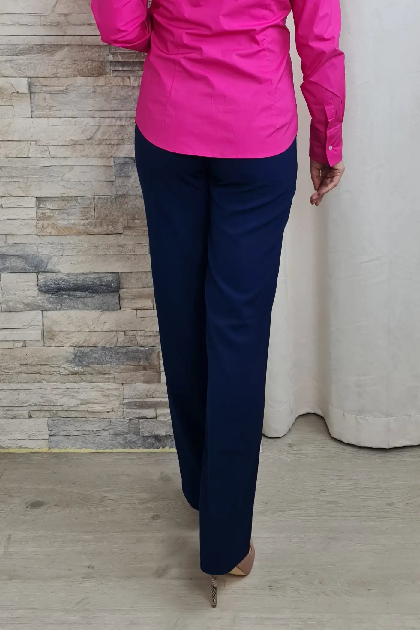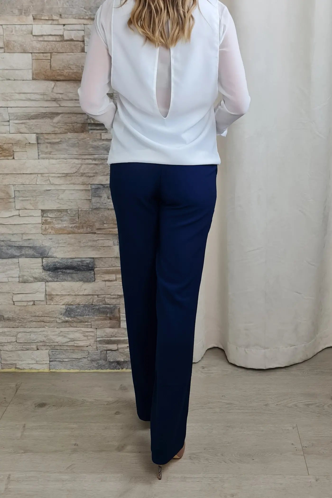 Ao vestir estas calças, a sua cor azul, que evoca a serenidade do oceano e a leveza do céu, proporciona uma sensação de calma e otimismo. O seu corte reto e o cinto no mesmo tom conferem-lhe um visual profissional e elegante, sem comprometer o conforto.