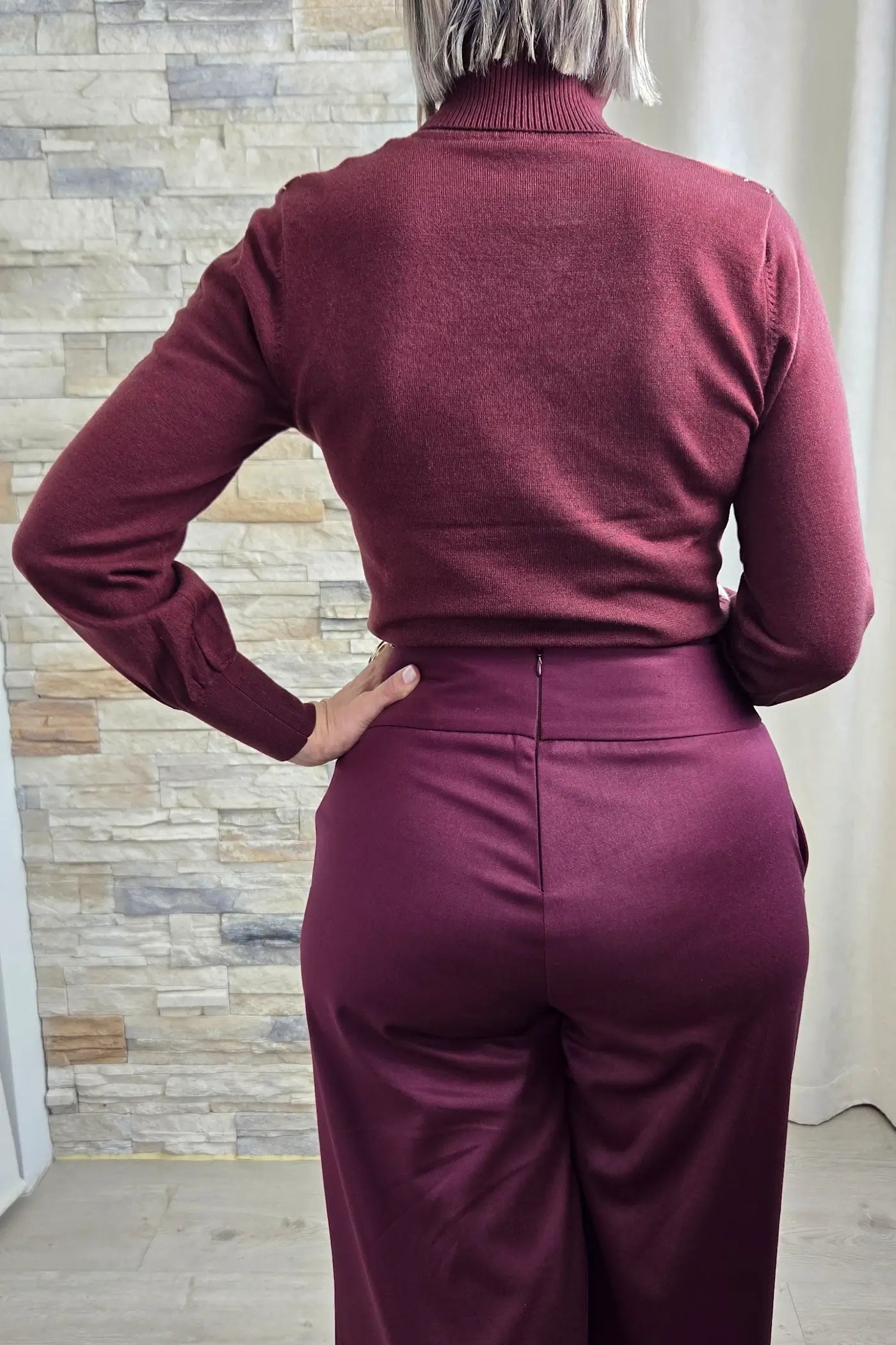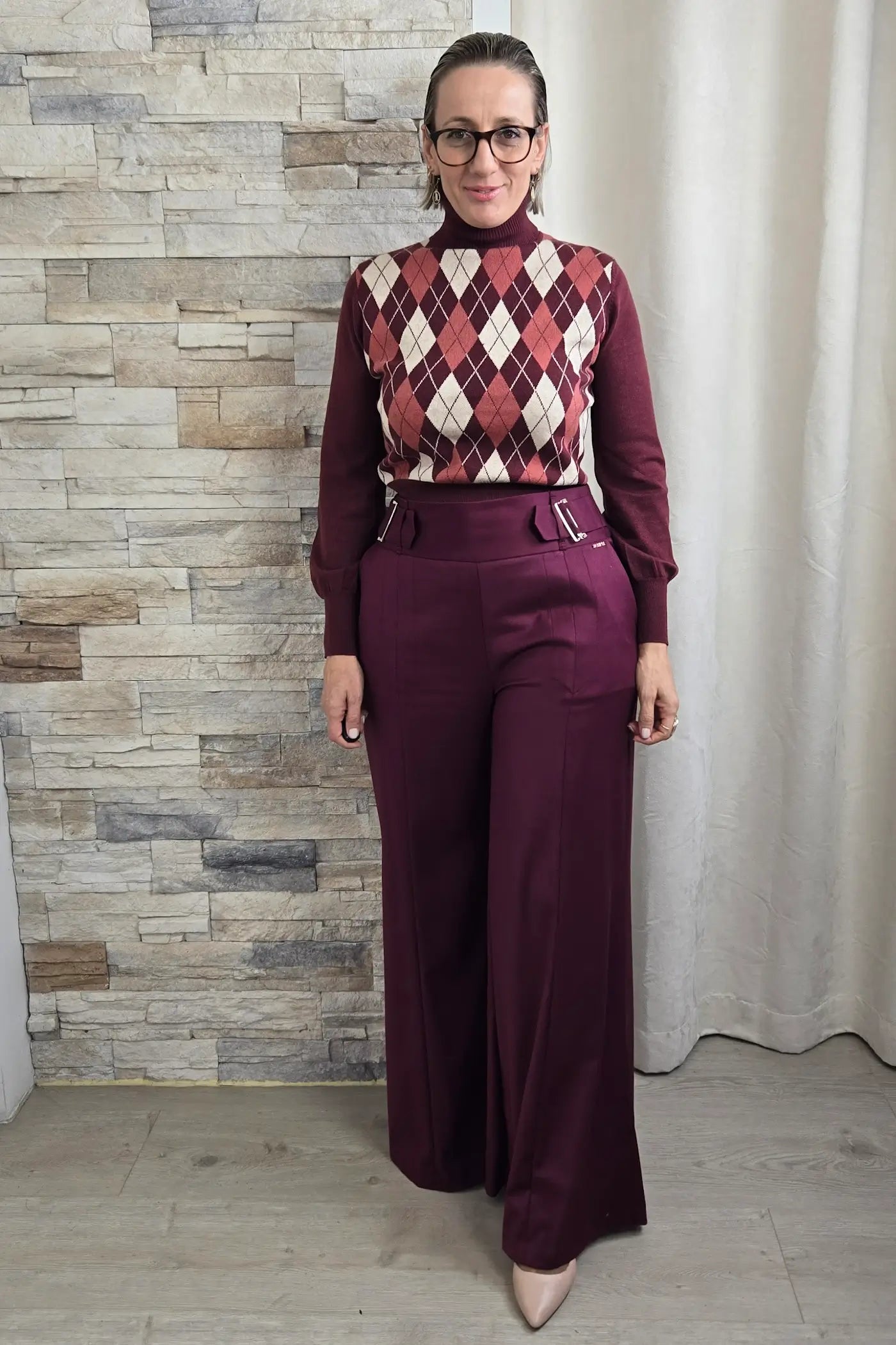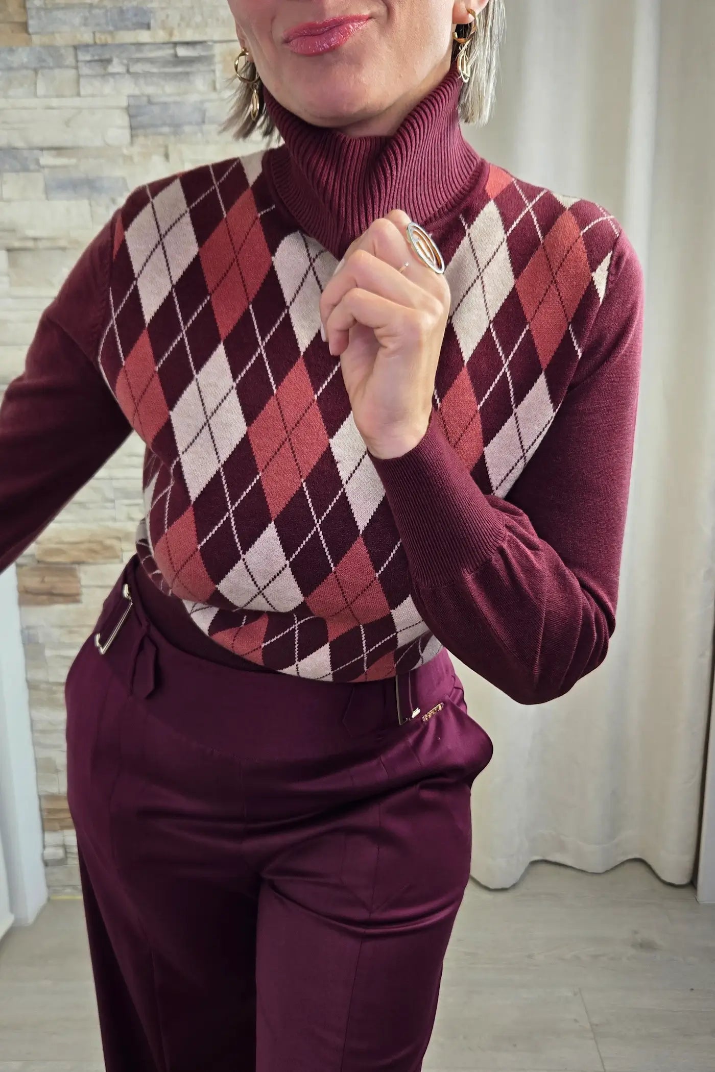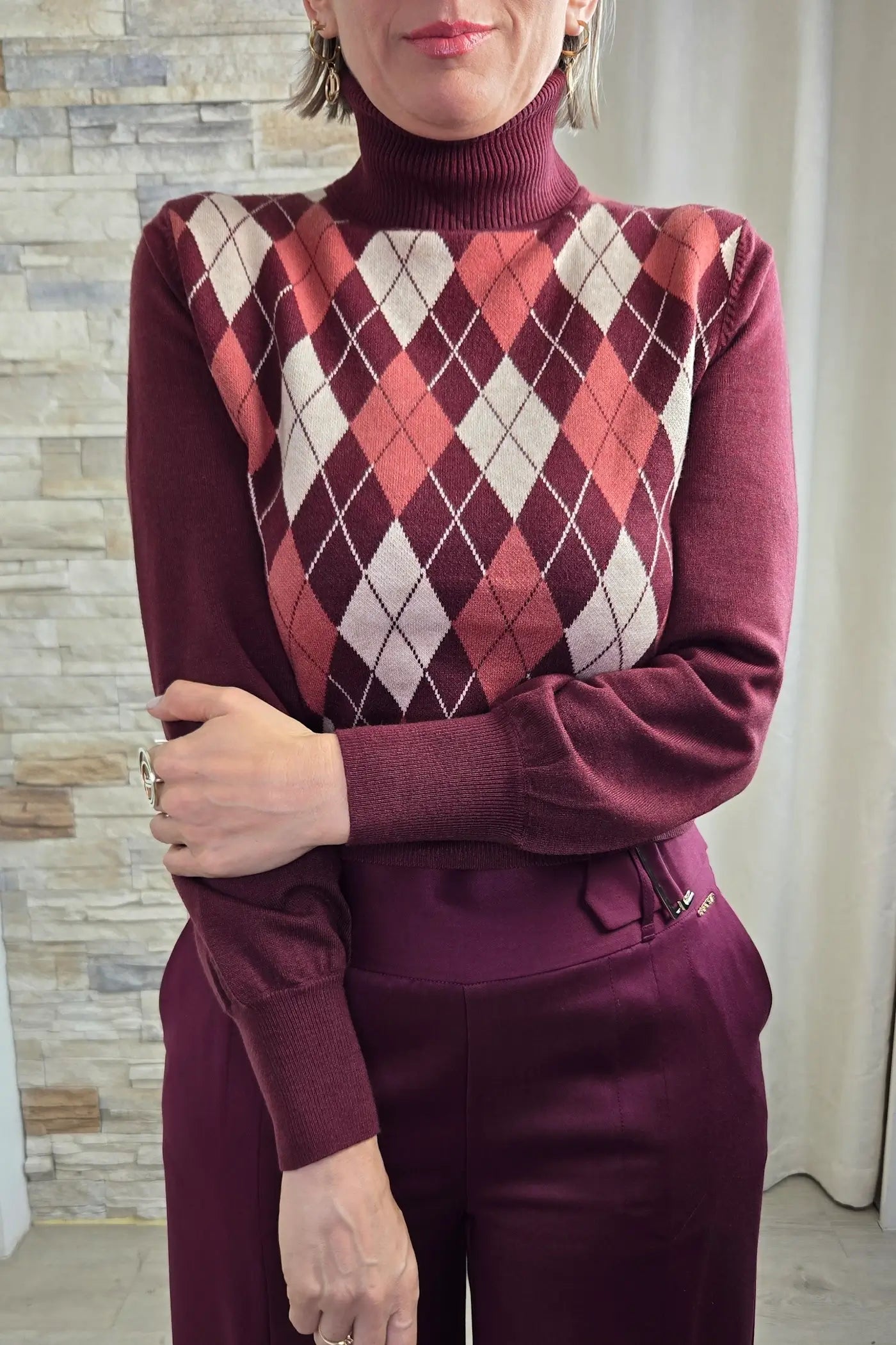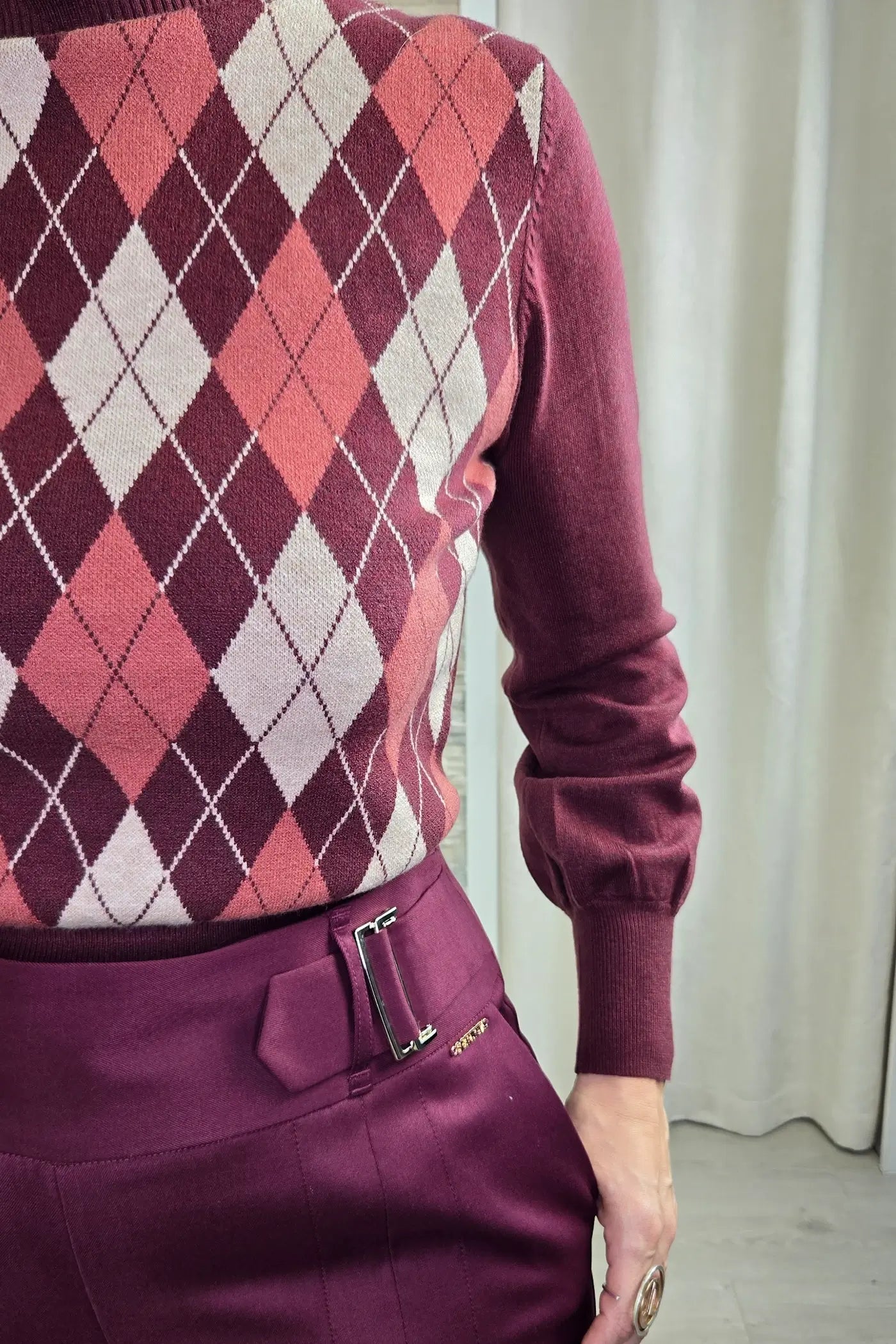 Cor e Padrão: A camisola utiliza uma paleta poderosa de bordeaux/vinho na base, complementada por losangos Argyle em tons de rosa, bordeaux e bege claro. Esta combinação rica e feminina cria um ponto focal imediato e elegante.