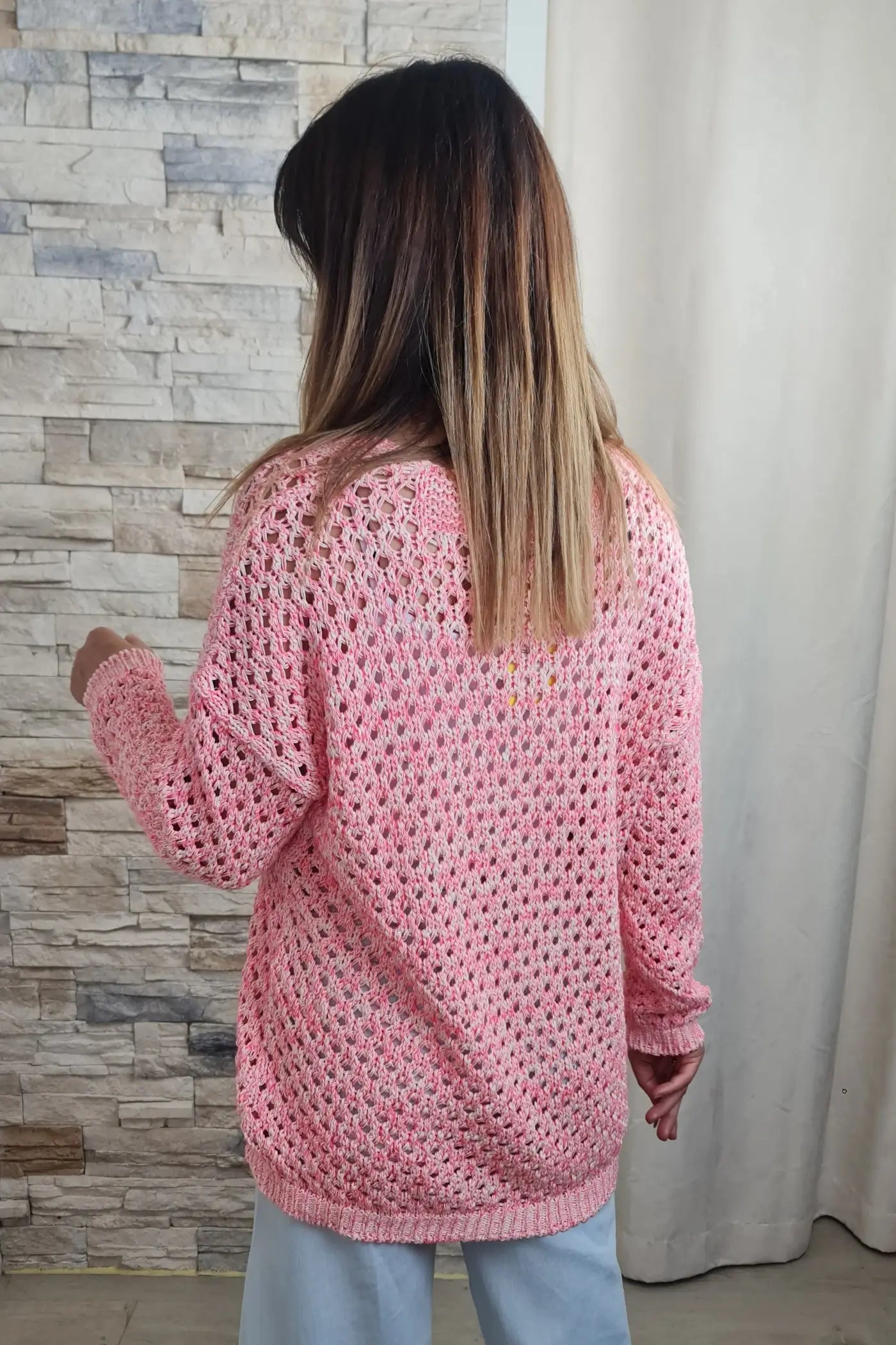 O grande destaque da peça é o seu trabalho de malha em crochet (perfurado), que confere uma textura rica e leve, ideal para sobreposições. A trama aberta injeta um toque de sensualidade subtil, permitindo que a peça que usar por baixo (como um top de alças fino) se vislumbre.