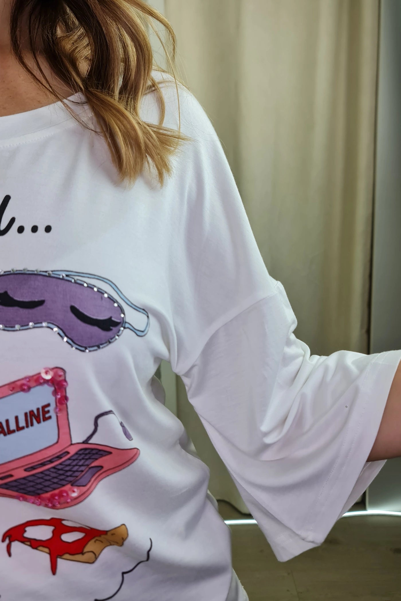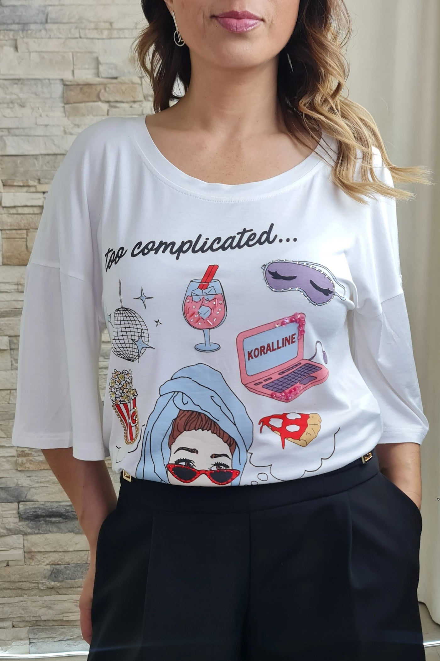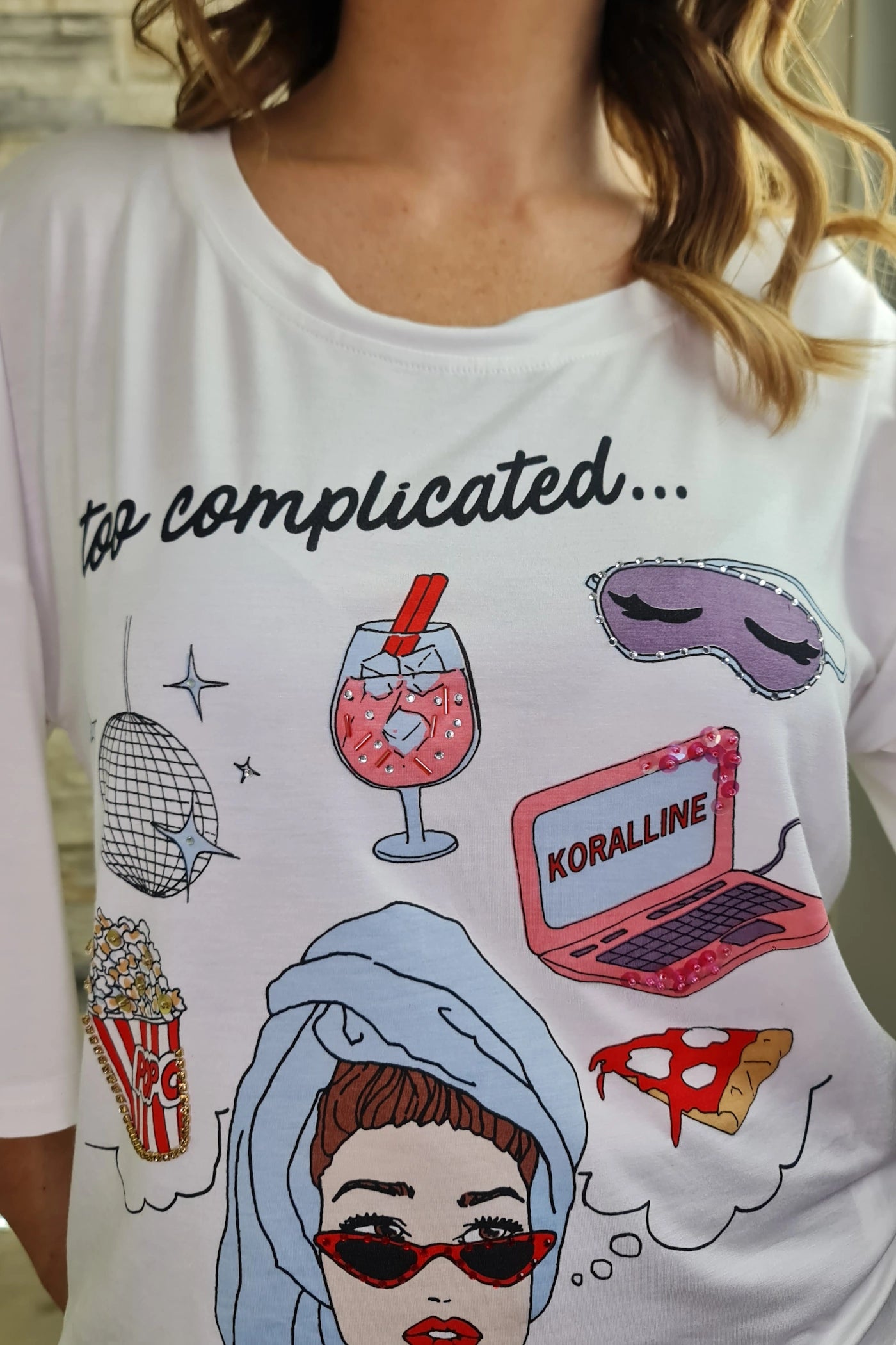 O destaque da peça é o estampado frontal vibrante e divertido, com elementos gráficos que remetem a momentos de lazer e descanso, como pipocas, um cocktail, uma máscara de dormir e um portátil. A inscrição "Too complicated..." e o desenho de uma figura feminina glamorosa com o cabelo envolto numa toalha convidam a uma atitude de descontração e auto-cuidado, expressando a sua personalidade de forma autêntica e irreverente.
