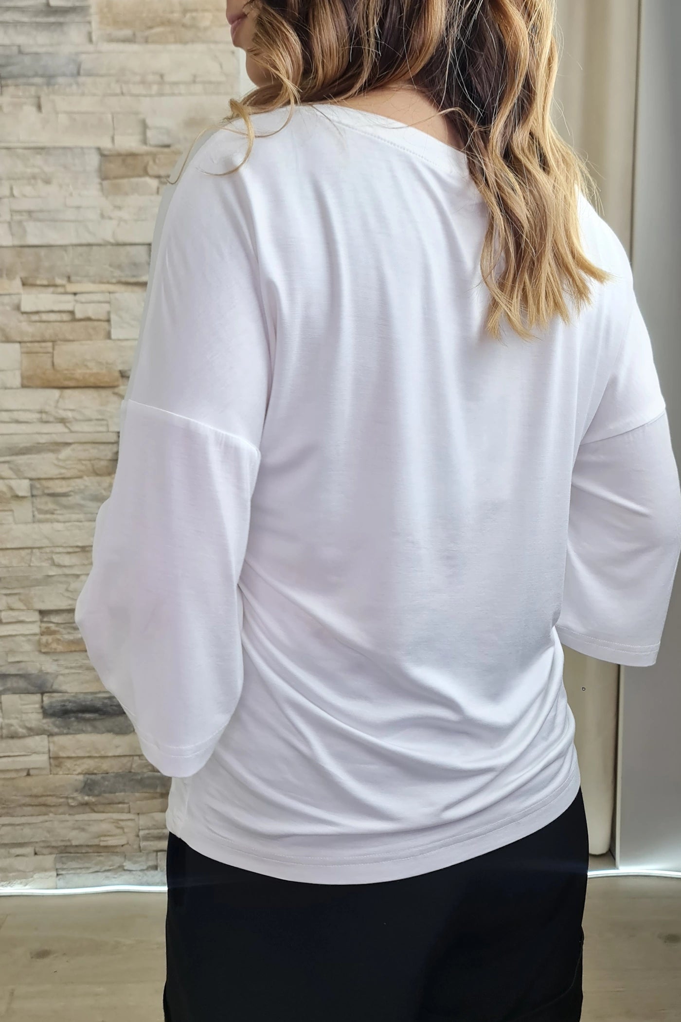 Ao vestir esta camisola, sentirá o conforto do algodão suave que envolve o corpo, na cor branca clean que ilumina o visual. O corte folgado (regular fit) com decote redondo e as mangas a 3/4 largas, que caem suavemente sobre os braços, conferem um visual relaxado, mas sofisticado.