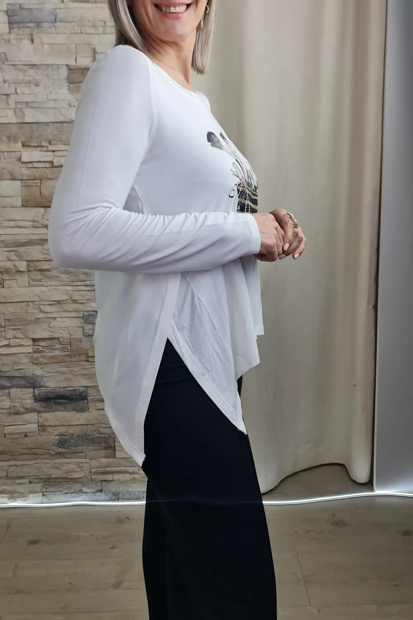 A "Serenidade Essencial" é a peça ideal para quem procura na moda uma forma de se expressar com autenticidade, sendo o fundo perfeito para coordenar com peças mais ousadas, como calças de cor forte ou saias estampadas, ou para um look monocromático de elegância suprema. Vista-a e sinta-se confiante para irradiar a sua luz por onde for.
