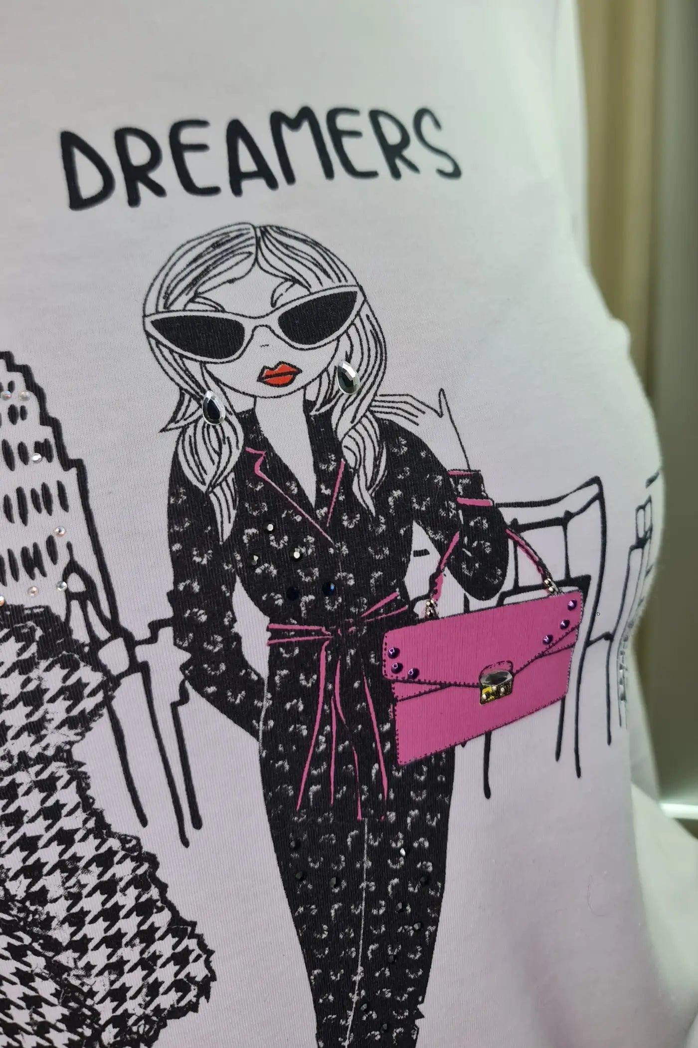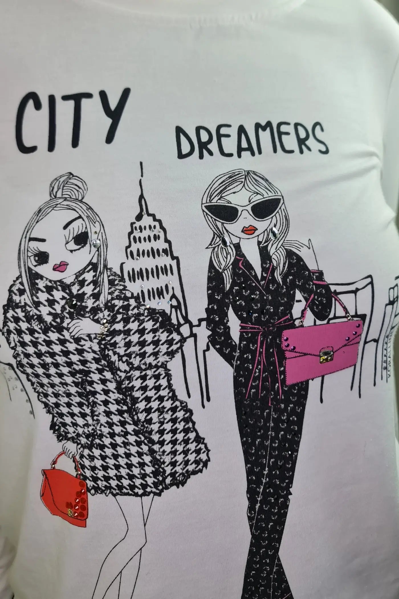 O destaque da peça é o estampado frontal vibrante e irreverente com duas figuras femininas estilizadas. O design arrojado — uma figura com um casaco em padrão pied-de-poule e outra mais elegante de fato — juntamente com a inscrição "CITY DREAMERS", convida-a a expressar a sua atitude cosmopolita e sonhadora de forma autêntica e descomplicada. É uma peça que celebra a força e a sofisticação da mulher moderna.