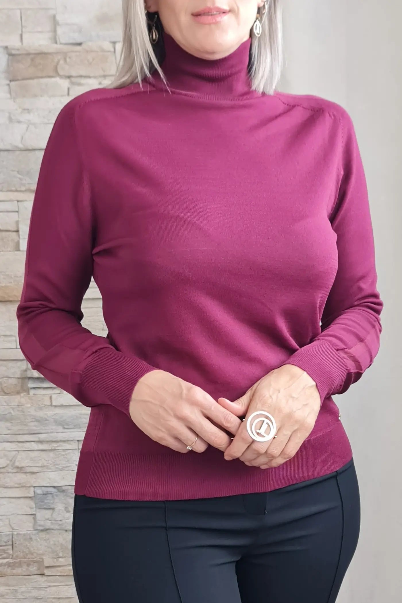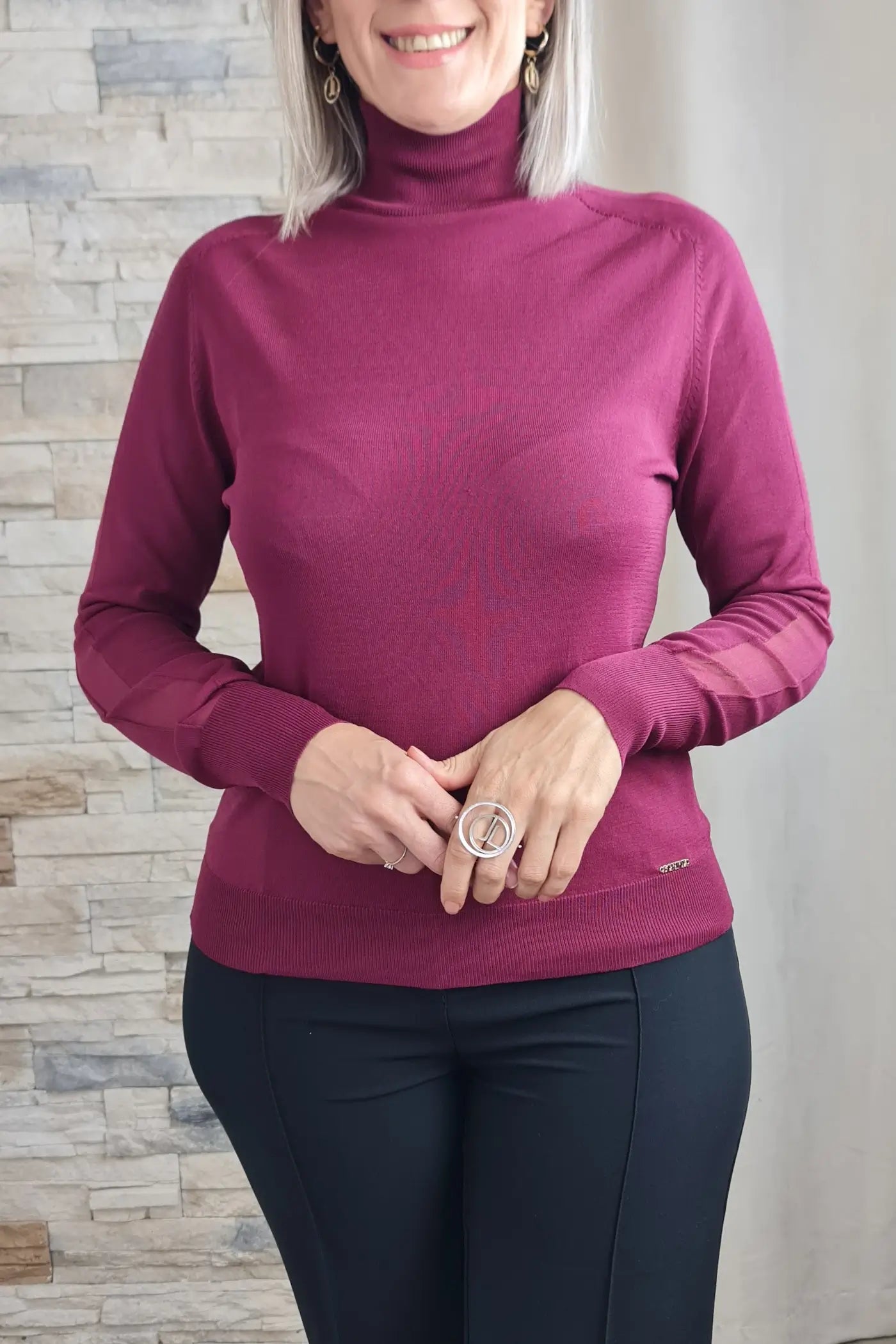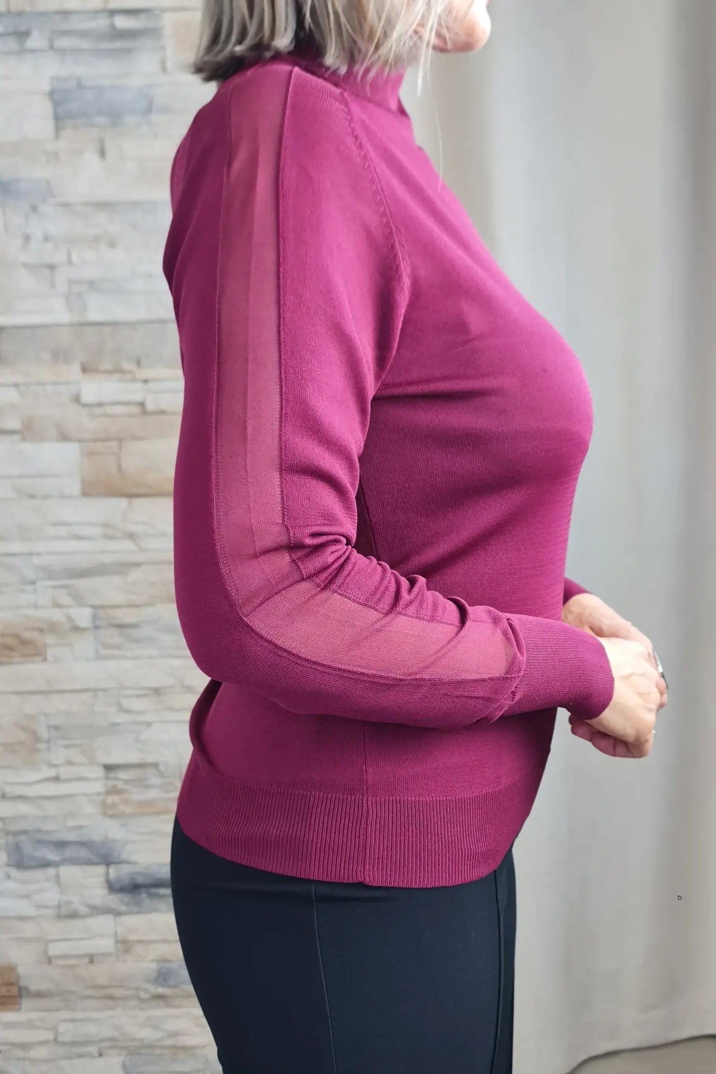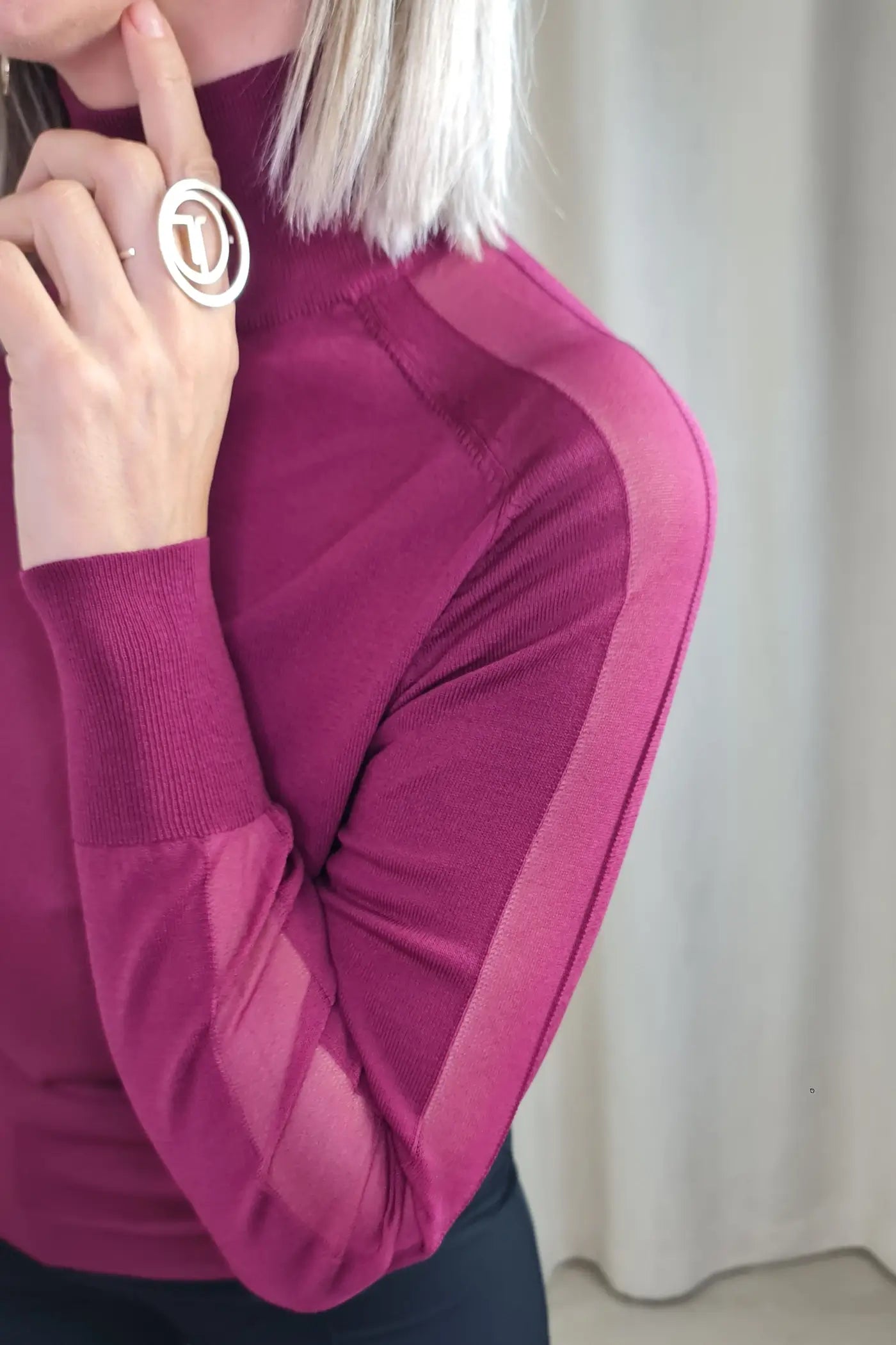 Ao vestir esta camisola, o seu tom bordeaux, que evoca a força da natureza e a serenidade, proporciona uma sensação de calma e otimismo. O seu corte justo e o seu tecido de malha, com os detalhes de transparência nas mangas, confere-lhe um visual ousado e elegante, sem comprometer o conforto. O seu design versátil e elegante permite que a use em diversas ocasiões, seja para um encontro de trabalho a um almoço com amigas.