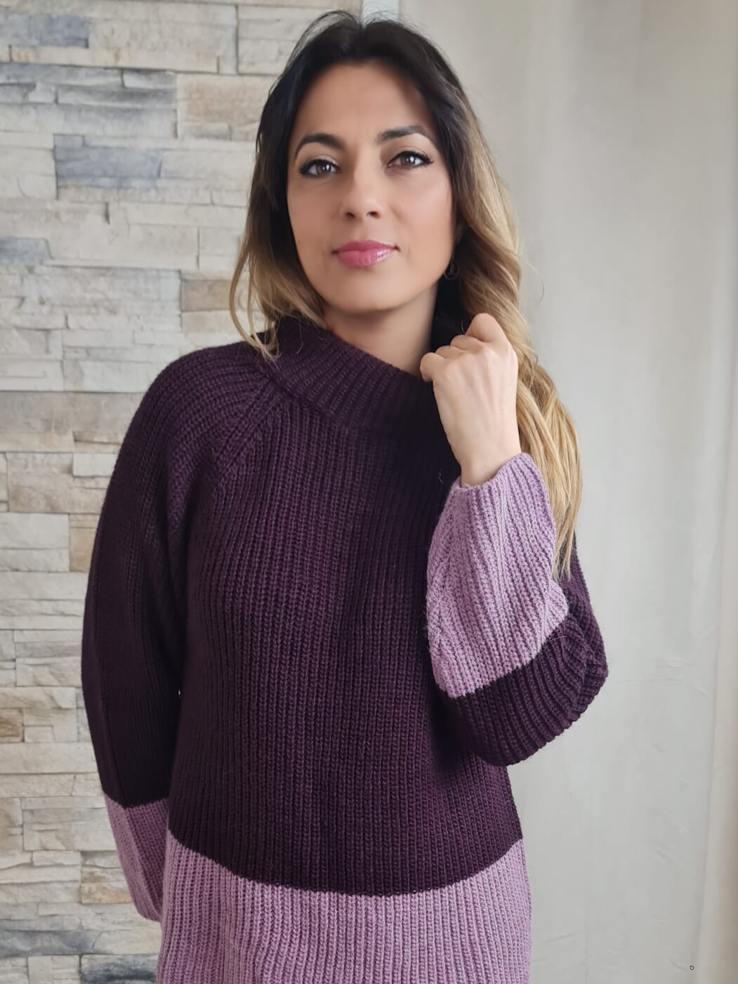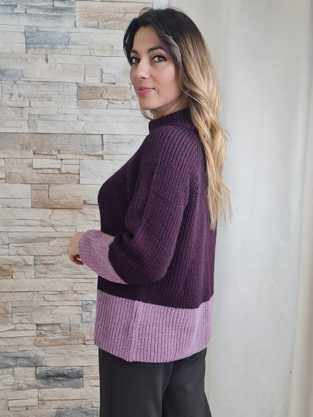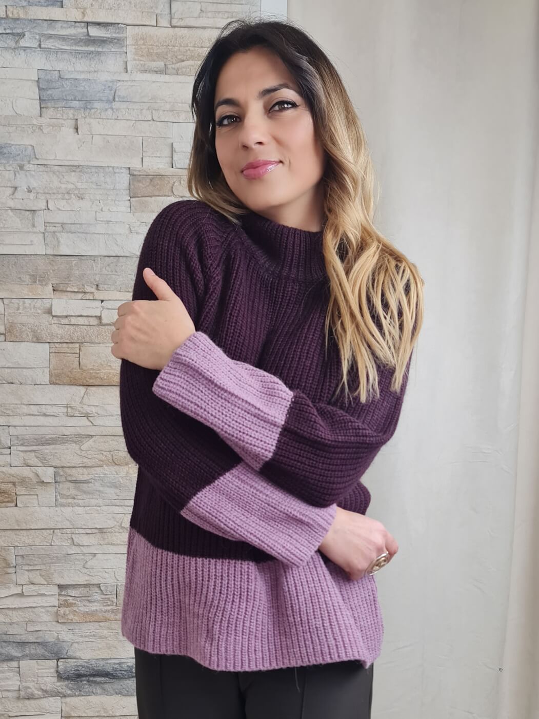 A camisola apresenta um design moderno e sofisticado, com um padrão bicolor em tons de bordeaux e lilás. A peça possui mangas compridas e gola alta, ideal para os dias mais frios. O detalhe que mais se destaca é a barra em tom lilás, que cria um contraste interessante com o tom bordeaux do corpo da camisola.