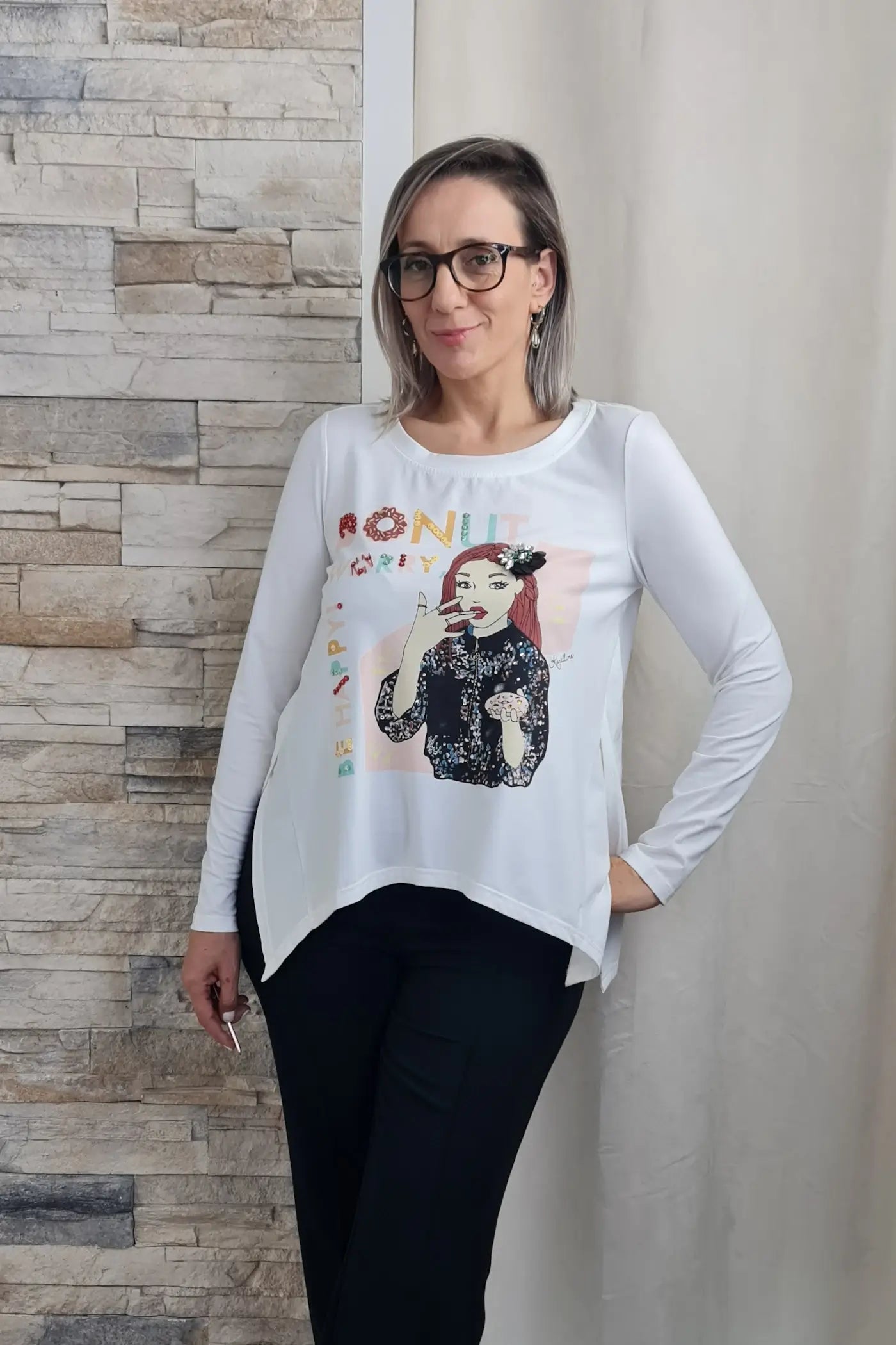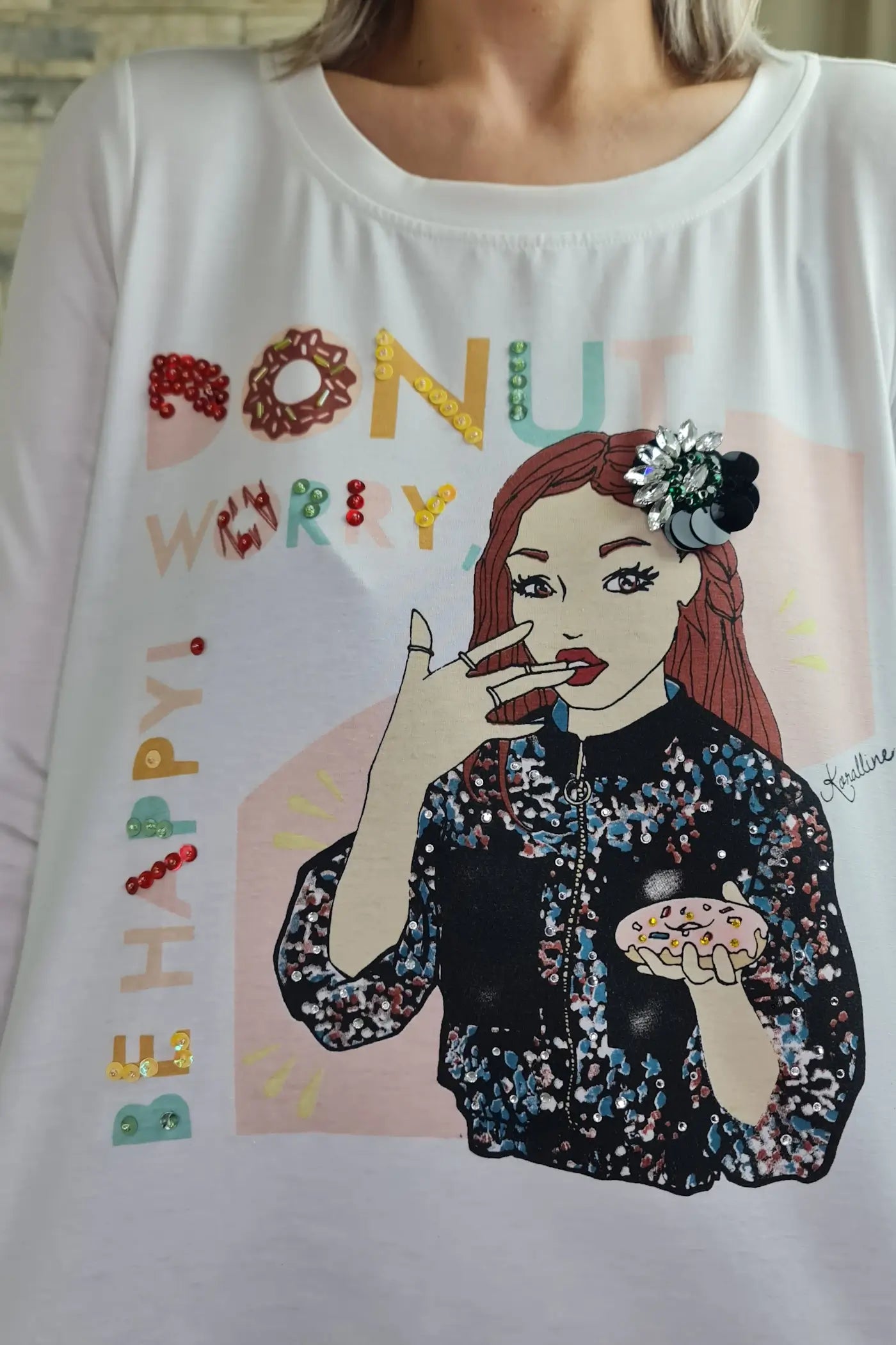 O destaque da peça é o estampado frontal vibrante e irreverente, com uma figura feminina estilizada envolta por um design gráfico e divertido. A inscrição "DONUT WORRY BE HAPPY!" e os detalhes de missangas e lantejoulas que dão forma ao estampado (como nos donuts e em parte da figura) injetam um toque de brilho e bom humor, convidando-a a expressar a sua personalidade de forma autêntica e descomplicada.